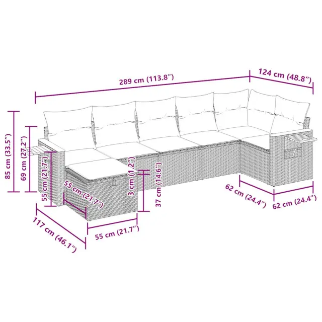 Ta vrtna sedežna garnitura je popoln dodatek za vaše dvorišče, teraso ali verando, saj zagotavlja udoben in vabljiv prostor za klepet z družino in prijatelji ali preprosto za sprostitev in uživanje na prostem. Trpežen material: PE ratan, znan tudi kot poli ratan, je močan sintetični material, ki ne potrebuje vzdrževanja in je videti kot naravni ratan. Je lahek, enostaven za čiščenje in se zaradi svoje vzdržljivosti in odpornosti na vremenske vplive pogosto uporablja za zunanje pohištvo.Funkcija shranjevanja z vodoodporno vrečo: Vsak vrtni sedež ima pod sedežem prostor za shranjevanje, opremljen z vodoodporno vrečo za shranjevanje blazin, igrač in drugih predmetov. Notranja torba ima zgornji pokrov in jo je mogoče varno pritrditi na sedež s kavljem in zanko za večjo stabilnost.Vsestranski stolček za noge: Stolček je vsestransko uporaben, saj služi kot udoben naslon za noge, ko ležite na kavču, ali kot dodaten sedež na vrtu.Prevleko je mogoče odstraniti in oprati: Te sedežne blazine imajo odstranljive prevleke za lažje pranje in vzdrževanje.Robusten in stabilen okvir: Jeklen okvir s prašnim premazom je močan, stabilen, trpežen ter odporen na korozijo in slabe vremenske razmere, kar zagotavlja dolgotrajno delovanje. Dobro je vedeti:Če želite, da vaše zunanje pohištvo ostane lepo, vam priporočamo, da ga zaščitite z vodoodporno prevleko.Dimenzije vodoodporne vreče: 55 x 53 x 34 cm (D x Š x V)Največja dovoljena teža (na sedež): 110 kgUV-odpornoPlastične nastavljive nogePotrebno sestavljanje: DaSrednji sedež:Barva: ČrnaMaterial: PE ratan, jeklen okvir s prašnim premazomDimenzije: 55 x 62 x 69 cm (Š x G x V)Velikost sedeža: 55 x 55 cm (Š x G)Višina sedeža od tal (brez blazine): 37 cmKotni sedež:Barva: ČrnaMaterial: PE ratan, jeklen okvir s prašnim premazomDimenzije: 62 x 62 x 69 cm (Š x G x V)Velikost sedeža: 55 x 55 cm (Š x G)Višina sedeža od tal (brez blazine): 37 cmKavč z naslonjali za roke:Barva: ČrnaMaterial: PE ratan, prašno premazano jeklo, trden akacijev les z oljnim premazomDimenzije: 62 x 62 x 69 cm (Š x G x V)Velikost sedeža: 55 x 55 cm (Š x G)Višina sedeža od tal (brez blazine): 37 cmVišina naslonjal za roke od tal: 55 cmStolček za noge:Barva: ČrnaMaterial: PE ratan, jeklen okvir s prašnim premazomDimenzije: 55 x 55 x 37 cm (Š x G x V)Blazina:Barva: Kremno belaMaterial prevleke: Tkanina (100 % poliester)Polnilo sedežne blazine: PenaPolnilo hrbtne blazine: bombažna vlaknaDimenzije sedežne blazine: 55 x 55 x 3 cm (Š x G x D)Dimenzije hrbtne blazine: 55 x 45 x 13 cm (D x Š x D)Paket vsebuje:3 x Srednji kavč s funkcijo shranjevanja z vodoodporno vrečo1 x Kotni kavč s funkcijo shranjevanja z vodoodporno vrečo2 x Kavč s funkcijo shranjevanja z vodoodporno vrečo1 x Stolček s funkcijo shranjevanja7 x Hrbtna blazina7 x Sedežna blazina s snemljivo in pralno prevleko 3325983