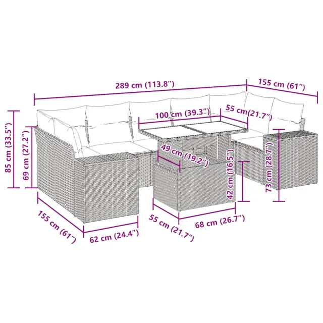 Ta vrtna sedežna garnitura je popoln dodatek za vaše dvorišče, teraso ali verando, saj zagotavlja udoben in vabljiv prostor za klepet z družino in prijatelji ali preprosto za sprostitev in uživanje na prostem. Trpežen material: PE ratan, znan tudi kot poli ratan, je močan sintetični material, ki ne potrebuje vzdrževanja in je videti kot naravni ratan. Je lahek, enostaven za čiščenje in se zaradi svoje vzdržljivosti in odpornosti na vremenske vplive pogosto uporablja za zunanje pohištvo.Funkcija shranjevanja z vodoodporno torbo: Vrtno pohištvo ima pod sedežem prostor za shranjevanje, opremljen z vodoodporno torbo za shranjevanje blazin, igrač in drugih stvari. Notranjo torbo je mogoče varno pritrditi na zunanje pohištvo s kavljem in zanko za večjo stabilnost.Nastavljiva mizna plošča: Z dvigom mizne plošče lahko mizo povišate, s čimer se zunanja klubska mizica spremeni v jedilno mizo. Popolna je za sprejemanje gostov ali uživanje v obrokih na prostem.Prevleko je mogoče odstraniti in oprati: Te sedežne blazine imajo odstranljive prevleke za lažje pranje in vzdrževanje.Modularna zasnova: Ta komplet zunanjega pohištva ima modularno zasnovo, zaradi česar je popolnoma prilagodljiv in enostaven za premikanje, tako da lahko zunanjo garnituro postavite kakor koli želite. Dobro je vedeti:Če želite, da vaše zunanje pohištvo ostane lepo, vam priporočamo, da ga zaščitite z vodoodporno prevleko.Dimenzije vodoodporne vreče: 55 x 53 x 34 cm (D x Š x V)Maksimalna nosilnost (na sedež): 110 kgUV-odpornoPlastične nastavljive nogePotrebno sestavljanje: DaKotni sedež:Barva: RjavaMaterial: PE ratan, jeklen okvir s prašnim premazomDimenzije: 62 x 62 x 69 cm (Š x G x V)Velikost sedeža: 55 x 55 cm (Š x G)Višina sedeža od tal (brez blazine): 37 cmKotni sedež s naslonom za roke iz ratana:Barva: RjavaMaterial: PE ratan, jeklen okvir s prašnim premazomDimenzije: 83 x 62 x 69 cm (Š x G x V)Velikost sedeža: 55 x 55 cm (Š x G)Višina sedeža od tal (brez blazine): 37 cmVišina naslonjal za roke od tal: 55 cmŠirina naslona za roke: 27,5 cmSrednji sedež:Barva: RjavaMaterial: PE ratan, jeklen okvir s prašnim premazomDimenzije: 55 x 62 x 69 cm (Š x G x V)Velikost sedeža: 55 x 55 cm (Š x G)Višina sedeža od tal (brez blazine): 37 cmMiza:Barva: RjavaMaterial: PE ratan, jeklo s prašnim premazom, kaljeno stekloDimenzije: 100 x 55 x 44/73 cm (D x Š x V)Blazina:Barva: Kremno belaMaterial prevleke: Tkanina (100 % poliester)Polnilo sedežne blazine: PenaPolnilo hrbtne blazine: bombažna vlaknaDimenzije sedežne blazine: 55 x 55 x 3 cm (Š x G x D)Dimenzije hrbtne blazine: 55 x 45 x 13 cm (D x Š x D)Paket vsebuje:1 x Vrtna miza2 x Kotni kavč s funkcijo shranjevanja z vodoodporno vrečo2 x Kotni sedež z naslonom za roke iz ratana s funkcijo shranjevanja z vodoodporno torbo3 x Srednji kavč s funkcijo shranjevanja z vodoodporno vrečo9 x Blazina za hrbet7 x Sedežna blazina s snemljivo in pralno prevleko 3326764