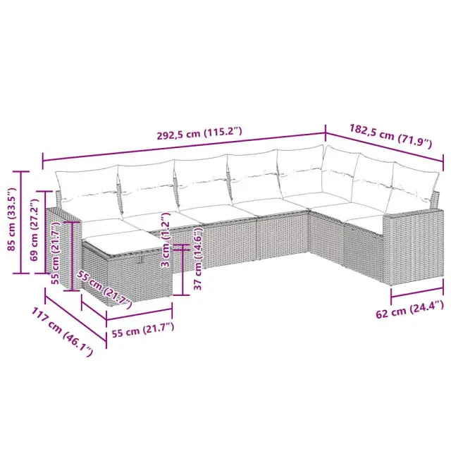 Ta vrtna sedežna garnitura je popoln dodatek za vaše dvorišče, teraso ali verando, saj zagotavlja udoben in vabljiv prostor za klepet z družino in prijatelji ali preprosto za sprostitev in uživanje na prostem. Trpežen material: PE ratan, znan tudi kot poli ratan, je močan sintetični material, ki ne potrebuje vzdrževanja in je videti kot naravni ratan. Je lahek, enostaven za čiščenje in se zaradi svoje vzdržljivosti in odpornosti na vremenske vplive pogosto uporablja za zunanje pohištvo.Funkcija shranjevanja z vodoodporno torbo: Vrtno pohištvo ima pod sedežem prostor za shranjevanje, opremljen z vodoodporno torbo za shranjevanje blazin, igrač in drugih stvari. Notranjo torbo je mogoče varno pritrditi na zunanje pohištvo s kavljem in zanko za večjo stabilnost.Vsestranski stolček za noge: Stolček je vsestransko uporaben, saj služi kot udoben naslon za noge, ko ležite na kavču, ali kot dodaten sedež na vrtu.Prevleko je mogoče odstraniti in oprati: Te sedežne blazine imajo odstranljive prevleke za lažje pranje in vzdrževanje.Modularna zasnova: Ta komplet zunanjega pohištva ima modularno zasnovo, zaradi česar je popolnoma prilagodljiv in enostaven za premikanje, tako da lahko zunanjo garnituro postavite kakor koli želite. Dobro je vedeti:Če želite, da vaše zunanje pohištvo ostane lepo, vam priporočamo, da ga zaščitite z vodoodporno prevleko.Dimenzije vodoodporne vreče: 55 x 53 x 34 cm (D x Š x V)Največja dovoljena teža (na sedež): 110 kgUV-odpornoPlastične nastavljive nogePotrebno sestavljanje: DaKavč z naslonjali za roke:Barva: BežMaterial: PE ratan, jeklen okvir s prašnim premazomDimenzije: 65,5 x 62 x 69 cm (Š x G x V)Velikost sedeža: 55 x 55 cm (Š x G)Višina sedeža od tal (brez blazine): 37 cmVišina naslonjal za roke od tal: 55 cmŠirina naslonjala za roke: 10 cmKotni sedež:Barva: BežMaterial: PE ratan, jeklen okvir s prašnim premazomDimenzije: 62 x 62 x 69 cm (Š x G x V)Velikost sedeža: 55 x 55 cm (Š x G)Višina sedeža od tal (brez blazine): 37 cmSrednji sedež:Barva: BežMaterial: PE ratan, jeklen okvir s prašnim premazomDimenzije: 55 x 62 x 69 cm (Š x G x V)Velikost sedeža: 55 x 55 cm (Š x G)Višina sedeža od tal (brez blazine): 37 cmStolček za noge:Barva: BežMaterial: PE ratan, jeklen okvir s prašnim premazomDimenzije: 55 x 55 x 37 cm (Š x G x V)Blazina:Barva: Kremno belaMaterial prevleke: Tkanina (100 % poliester)Polnilo sedežne blazine: PenaPolnilo hrbtne blazine: bombažna vlaknaDimenzije sedežne blazine: 55 x 55 x 3 cm (Š x G x D)Dimenzije hrbtne blazine: 55 x 45 x 13 cm (D x Š x D)Paket vsebuje:2 x Kavč s funkcijo shranjevanja z vodoodporno vrečo1 x Kotni kavč s funkcijo shranjevanja z vodoodporno vrečo4 x Srednji kavč s funkcijo shranjevanja z vodoodporno vrečo1 x Stolček s funkcijo shranjevanja8 x Blazina za hrbet8 x Sedežna blazina s snemljivo in pralno prevleko 3325434