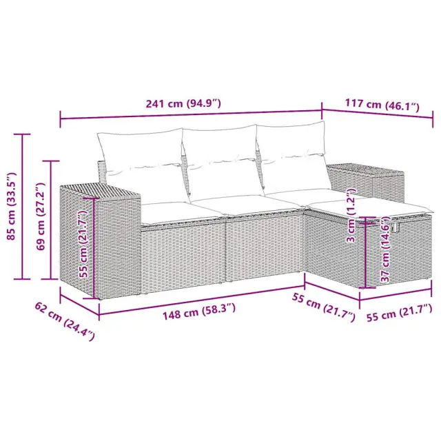 Ta vrtna sedežna garnitura je popoln dodatek za vaše dvorišče, teraso ali verando, saj zagotavlja udoben in vabljiv prostor za klepet z družino in prijatelji ali preprosto za sprostitev in uživanje na prostem. Trpežen material: PE ratan, znan tudi kot poli ratan, je močan sintetični material, ki ne potrebuje vzdrževanja in je videti kot naravni ratan. Je lahek, enostaven za čiščenje in se zaradi svoje vzdržljivosti in odpornosti na vremenske vplive pogosto uporablja za zunanje pohištvo.Funkcija shranjevanja z vodoodporno torbo: Vrtno pohištvo ima pod sedežem prostor za shranjevanje, opremljen z vodoodporno torbo za shranjevanje blazin, igrač in drugih stvari. Notranjo torbo je mogoče varno pritrditi na zunanje pohištvo s kavljem in zanko za večjo stabilnost.Vsestranski stolček za noge: Stolček je vsestransko uporaben, saj služi kot udoben naslon za noge, ko ležite na kavču, ali kot dodaten sedež na vrtu.Prevleko je mogoče odstraniti in oprati: Te sedežne blazine imajo odstranljive prevleke za lažje pranje in vzdrževanje.Modularna zasnova: Ta komplet zunanjega pohištva ima modularno zasnovo, zaradi česar je popolnoma prilagodljiv in enostaven za premikanje, tako da lahko zunanjo garnituro postavite kakor koli želite. Dobro je vedeti:Če želite, da vaše zunanje pohištvo ostane lepo, vam priporočamo, da ga zaščitite z vodoodporno prevleko.Dimenzije vodoodporne vreče: 55 x 53 x 34 cm (D x Š x V)Največja dovoljena teža (na sedež): 110 kgUV-odpornoPlastične nastavljive nogePotrebno sestavljanje: DaKavč z naslonjali za roke:Barva: BežMaterial: PE ratan, jeklen okvir s prašnim premazomDimenzije: 93 x 62 x 69 cm (Š x G x V)Velikost sedeža: 55 x 55 cm (Š x G)Višina sedeža od tal (brez blazine): 37 cmVišina naslonjal za roke od tal: 55 cmŠirina naslona za roke: 27,5 cmSrednji sedež:Barva: BežMaterial: PE ratan, jeklen okvir s prašnim premazomDimenzije: 55 x 62 x 69 cm (Š x G x V)Velikost sedeža: 55 x 55 cm (Š x G)Višina sedeža od tal (brez blazine): 37 cmStolček za noge:Barva: BežMaterial: PE ratan, jeklen okvir s prašnim premazomDimenzije: 55 x 55 x 37 cm (Š x G x V)Blazina:Barva: Kremno belaMaterial prevleke: Tkanina (100 % poliester)Polnilo sedežne blazine: PenaPolnilo hrbtne blazine: bombažna vlaknaDimenzije sedežne blazine: 55 x 55 x 3 cm (Š x G x D)Dimenzije hrbtne blazine: 55 x 45 x 13 cm (D x Š x D)Paket vsebuje:2 x Kavč s funkcijo shranjevanja z vodoodporno vrečo1 x Srednji kavč s funkcijo shranjevanja z vodoodporno vrečo1 x Stolček s funkcijo shranjevanja3 x Blazina za hrbet4 x Sedežna blazina s snemljivo in pralno prevleko 3325654