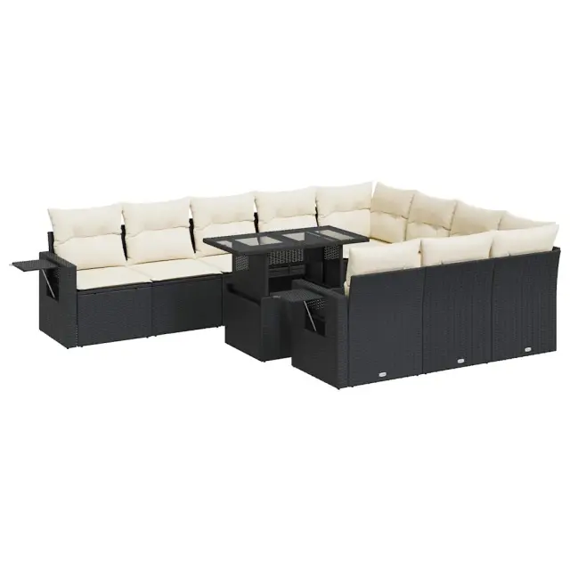 Ta vrtna sedežna garnitura je popoln dodatek za vaše dvorišče, teraso ali verando, saj zagotavlja udoben in vabljiv prostor za klepet z družino in prijatelji ali preprosto za sprostitev in uživanje na prostem. Trpežen material: PE ratan, znan tudi kot poli ratan, je močan sintetični material, ki ne potrebuje vzdrževanja in je videti kot naravni ratan. Je lahek, enostaven za čiščenje in se zaradi svoje vzdržljivosti in odpornosti na vremenske vplive pogosto uporablja za zunanje pohištvo.Funkcija shranjevanja z vodoodporno vrečo: Vsak vrtni sedež ima pod sedežem prostor za shranjevanje, opremljen z vodoodporno vrečo za shranjevanje blazin, igrač in drugih predmetov. Notranja torba ima zgornji pokrov in jo je mogoče varno pritrditi na sedež s kavljem in zanko za večjo stabilnost.Nastavljiva mizna plošča: Z dvigom mizne plošče lahko mizo povišate, s čimer se zunanja klubska mizica spremeni v jedilno mizo. Popolna je za sprejemanje gostov ali uživanje v obrokih na prostem.Prevleko je mogoče odstraniti in oprati: Te sedežne blazine imajo odstranljive prevleke za lažje pranje in vzdrževanje.Robusten in stabilen okvir: Jeklen okvir s prašnim premazom je močan, stabilen, trpežen ter odporen na korozijo in slabe vremenske razmere, kar zagotavlja dolgotrajno delovanje. Dobro je vedeti:Če želite, da vaše zunanje pohištvo ostane lepo, vam priporočamo, da ga zaščitite z vodoodporno prevleko.Dimenzije vodoodporne vreče: 55 x 53 x 34 cm (D x Š x V)Največja dovoljena teža (na sedež): 110 kgUV-odpornoPlastične nastavljive nogePotrebno sestavljanje: DaSrednji sedež:Barva: ČrnaMaterial: PE ratan, jeklen okvir s prašnim premazomDimenzije: 55 x 62 x 69 cm (Š x G x V)Velikost sedeža: 55 x 55 cm (Š x G)Višina sedeža od tal (brez blazine): 37 cmKotni sedež:Barva: ČrnaMaterial: PE ratan, jeklen okvir s prašnim premazomDimenzije: 62 x 62 x 69 cm (Š x G x V)Velikost sedeža: 55 x 55 cm (Š x G)Višina sedeža od tal (brez blazine): 37 cmKavč z naslonjali za roke:Barva: ČrnaMaterial: PE ratan, jeklen okvir s prašnim premazomDimenzije: 62 x 62 x 69 cm (Š x G x V)Velikost sedeža: 55 x 55 cm (Š x G)Višina sedeža od tal (brez blazine): 37 cmVišina naslonjal za roke od tal: 55 cmMiza:Barva: ČrnaMaterial: PE ratan, jeklo s prašnim premazom, kaljeno stekloDimenzije: 100 x 55 x 44/73 cm (D x Š x V)Blazina:Barva: Kremno belaMaterial prevleke: Tkanina (100 % poliester)Polnilo sedežne blazine: PenaPolnilo hrbtne blazine: bombažna vlaknaDimenzije sedežne blazine: 55 x 55 x 3 cm (Š x G x D)Dimenzije hrbtne blazine: 55 x 45 x 13 cm (D x Š x D)Paket vsebuje:6 x Srednji kavč s funkcijo shranjevanja z vodoodporno vrečo2 x Kotni kavč s funkcijo shranjevanja z vodoodporno vrečo2 x Kavč s funkcijo shranjevanja z vodoodporno vrečo1 x Miza12 x Blazina za hrbet10 x Sedežna blazina s snemljivo in pralno prevleko 3326547