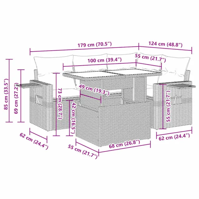 Ta vrtna sedežna garnitura je popoln dodatek za vaše dvorišče, teraso ali verando, saj zagotavlja udoben in vabljiv prostor za klepet z družino in prijatelji ali preprosto za sprostitev in uživanje na prostem. Trpežen material: PE ratan, znan tudi kot poli ratan, je močan sintetični material, ki ne potrebuje vzdrževanja in je videti kot naravni ratan. Je lahek, enostaven za čiščenje in se zaradi svoje vzdržljivosti in odpornosti na vremenske vplive pogosto uporablja za zunanje pohištvo.Funkcija shranjevanja z vodoodporno vrečo: Vsak vrtni sedež ima pod sedežem prostor za shranjevanje, opremljen z vodoodporno vrečo za shranjevanje blazin, igrač in drugih predmetov. Notranja torba ima zgornji pokrov in jo je mogoče varno pritrditi na sedež s kavljem in zanko za večjo stabilnost.Nastavljiva mizna plošča: Z dvigom mizne plošče lahko mizo povišate, s čimer se zunanja klubska mizica spremeni v jedilno mizo. Popolna je za sprejemanje gostov ali uživanje v obrokih na prostem.Prevleko je mogoče odstraniti in oprati: Te sedežne blazine imajo odstranljive prevleke za lažje pranje in vzdrževanje.Robusten in stabilen okvir: Jeklen okvir s prašnim premazom je močan, stabilen, trpežen ter odporen na korozijo in slabe vremenske razmere, kar zagotavlja dolgotrajno delovanje. Dobro je vedeti:Če želite, da vaše zunanje pohištvo ostane lepo, vam priporočamo, da ga zaščitite z vodoodporno prevleko.Dimenzije vodoodporne vreče: 55 x 53 x 34 cm (D x Š x V)Največja dovoljena teža (na sedež): 110 kgUV-odpornoPlastične nastavljive nogePotrebno sestavljanje: DaSrednji sedež:Barva: ČrnaMaterial: PE ratan, jeklen okvir s prašnim premazomDimenzije: 55 x 62 x 69 cm (Š x G x V)Velikost sedeža: 55 x 55 cm (Š x G)Višina sedeža od tal (brez blazine): 37 cmKotni sedež:Barva: ČrnaMaterial: PE ratan, jeklen okvir s prašnim premazomDimenzije: 62 x 62 x 69 cm (Š x G x V)Velikost sedeža: 55 x 55 cm (Š x G)Višina sedeža od tal (brez blazine): 37 cmKavč z naslonjali za roke:Barva: ČrnaMaterial: PE ratan, jeklen okvir s prašnim premazomDimenzije: 62 x 62 x 69 cm (Š x G x V)Velikost sedeža: 55 x 55 cm (Š x G)Višina sedeža od tal (brez blazine): 37 cmVišina naslonjal za roke od tal: 55 cmMiza:Barva: ČrnaMaterial: PE ratan, jeklo s prašnim premazom, kaljeno stekloDimenzije: 100 x 55 x 44/73 cm (D x Š x V)Blazina:Barva: Kremno belaMaterial prevleke: Tkanina (100 % poliester)Polnilo sedežne blazine: PenaPolnilo hrbtne blazine: bombažna vlaknaDimenzije sedežne blazine: 55 x 55 x 3 cm (Š x G x D)Dimenzije hrbtne blazine: 55 x 45 x 13 cm (D x Š x D)Paket vsebuje:1 x Srednji kavč s funkcijo shranjevanja z vodoodporno vrečo1 x Kotni kavč s funkcijo shranjevanja z vodoodporno vrečo2 x Kavč s funkcijo shranjevanja z vodoodporno vrečo1 x Miza5 x Blazina za hrbet4 x Sedežna blazina s snemljivo in pralno prevleko 3326467