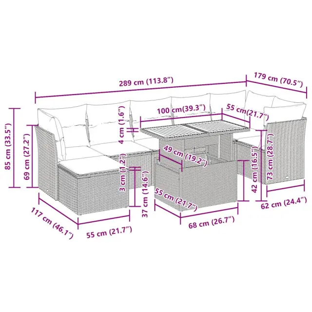 Ta vrtna sedežna garnitura je popoln dodatek za vaše dvorišče, teraso ali verando, saj zagotavlja udoben in vabljiv prostor za klepet z družino in prijatelji ali preprosto za sprostitev in uživanje na prostem. Trpežen material: PE ratan, znan tudi kot poli ratan, je močan sintetični material, ki ne potrebuje vzdrževanja in je videti kot naravni ratan. Je lahek, enostaven za čiščenje in se zaradi svoje vzdržljivosti in odpornosti na vremenske vplive pogosto uporablja za zunanje pohištvo.Funkcija shranjevanja z vodoodporno torbo: Vrtno pohištvo ima pod sedežem prostor za shranjevanje, opremljen z vodoodporno torbo za shranjevanje blazin, igrač in drugih stvari. Notranjo torbo je mogoče varno pritrditi na zunanje pohištvo s kavljem in zanko za večjo stabilnost.Nastavljiva mizna plošča: Z dvigom mizne plošče lahko mizo povišate, s čimer se zunanja klubska mizica spremeni v jedilno mizo. Popolna je za sprejemanje gostov ali uživanje v obrokih na prostem.Prevleko je mogoče odstraniti in oprati: Te sedežne blazine imajo odstranljive prevleke za lažje pranje in vzdrževanje.Modularna zasnova: Ta komplet zunanjega pohištva ima modularno zasnovo, zaradi česar je popolnoma prilagodljiv in enostaven za premikanje, tako da lahko zunanjo garnituro postavite kakor koli želite. Dobro je vedeti:Če želite, da vaše zunanje pohištvo ostane lepo, vam priporočamo, da ga zaščitite z vodoodporno prevleko.Dimenzije vodoodporne vreče: 55 x 53 x 34 cm (D x Š x V)Maksimalna nosilnost (na sedež): 110 kgUV-odpornoPlastične nastavljive nogePotrebno sestavljanje: DaKotni sedež:Barva: BežMaterial: PE ratan, jeklen okvir s prašnim premazomDimenzije: 62 x 62 x 69 cm (Š x G x V)Velikost sedeža: 55 x 55 cm (Š x G)Višina sedeža od tal (brez blazine): 37 cmSrednji sedež:Barva: BežMaterial: PE ratan, jeklen okvir s prašnim premazomDimenzije: 55 x 62 x 69 cm (Š x G x V)Velikost sedeža: 55 x 55 cm (Š x G)Višina sedeža od tal (brez blazine): 37 cmStolček za noge:Barva: BežMaterial: PE ratan, jeklen okvir s prašnim premazomDimenzije: 55 x 55 x 37 cm (Š x G x V)Miza:Barva: BežMaterial: PE ratan, prašno premazano jeklo, trden akacijev les z oljnim premazomDimenzije: 100 x 55 x 44/73 cm (D x Š x V)Blazina:Barva: Kremno belaMaterial prevleke: Tkanina (100 % poliester)Polnilo sedežne blazine: PenaPolnilo hrbtne blazine: bombažna vlaknaDimenzije sedežne blazine: 55 x 55 x 3 cm (Š x G x D)Dimenzije hrbtne blazine: 55 x 45 x 13 cm (D x Š x D)Paket vsebuje:1 x Vrtna miza3 x Kotni kavč s funkcijo shranjevanja z vodoodporno vrečo3 x Srednji kavč s funkcijo shranjevanja z vodoodporno vrečo1 x Stolček za noge s funkcijo shranjevanja z vodoodporno vrečo9 x Blazina za hrbet7 x Sedežna blazina s snemljivo in pralno prevleko 3326956