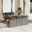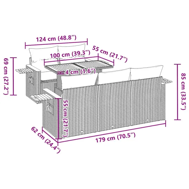 Ta vrtna sedežna garnitura je popoln dodatek za vaše dvorišče, teraso ali verando, saj zagotavlja udoben in vabljiv prostor za klepet z družino in prijatelji ali preprosto za sprostitev in uživanje na prostem.Trpežen material: PE ratan, znan tudi kot poli ratan, je močan sintetični material, ki ne potrebuje vzdrževanja in je videti kot naravni ratan. Je lahek, enostaven za čiščenje in se zaradi svoje vzdržljivosti in odpornosti na vremenske vplive pogosto uporablja za zunanje pohištvo.Funkcija shranjevanja z vodoodporno vrečo: Vsak vrtni sedež ima prostor za shranjevanje pod sedežem, skupaj z vodoodporno vrečo za shranjevanje blazin, igrač in drugih predmetov. Notranje vreče imajo zgornjo prevleko in jih je mogoče s pomočjo primenjal varno pritrditi na sedeže za dodatno varnost.Priročna stranska mizica: To zunanje pohištvo ima zložljivo stransko mizico s plinsko vzmetjo, ki zagotavlja priročen prostor za shranjevanje vaših potrebščin na dosegu roke.Prevleko je mogoče odstraniti in oprati: Te sedežne blazine imajo odstranljive prevleke za lažje pranje in vzdrževanje.Modularna zasnova: Ta komplet zunanjega pohištva ima modularno zasnovo, zaradi česar je popolnoma prilagodljiv in enostaven za premikanje, tako da lahko zunanjo garnituro postavite kakor koli želite.Dobro je vedeti:Če želite, da vaše zunanje pohištvo ostane lepo, vam priporočamo, da ga zaščitite z vodoodporno prevleko.Največja dovoljena teža (na sedež): 110 kgUV-odpornoPlastične nastavljive nogePotrebno sestavljanje: DaSrednji sedež:Barva: SivaMaterial: PE ratan, jeklen okvir s prašnim premazomDimenzije: 55 x 62 x 69 cm (Š x G x V)Velikost sedeža: 55 x 55 cm (Š x G)Višina sedeža od tal (brez blazine): 37 cmKotni sedež z naslonom za roke iz akacijevega lesa:Barva: SivaMaterial: PE ratan, prašno premazano jeklo, trden akacijev les z oljnim premazomDimenzije: 62 x 62 x 69 cm (Š x G x V)Velikost sedeža: 55 x 55 cm (Š x G)Višina sedeža od tal (brez blazine): 37 cmVišina naslonjal za roke od tal: 55 cmŠirina naslonjala za roke: 6 cmVelikost stranske mizice: 24,5 x 23,5 cm (D × Š)Miza:Material: PE ratan, prašno premazano jeklo, trden akacijev les z oljnim premazomDimenzije: 100 x 55 x 44/73 cm (D x Š x V)Blazina:Barva: Temno sivaMaterial prevleke: Tkanina (100 % poliester)Polnilo sedežne blazine: PenaPolnilo hrbtne blazine: bombažna vlaknaDimenzije sedežne blazine: 55 x 55 x 3 cm (Š x G x D)Dimenzije hrbtne blazine: 55 x 45 x 13 cm (D x Š x D)Paket vsebuje:1 x Vrtna miza4 x Kotni sedež z naslonom za roke iz akacije s funkcijo shranjevanja z vodoodporno torbo1 x Srednji kavč s funkcijo shranjevanja z vodoodporno vrečo5 x Sedežna blazina s snemljivo pralno prevleko5 x Blazina za hrbet 3327553