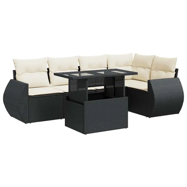 Ta vrtna sedežna garnitura je popoln dodatek za vaše dvorišče, teraso ali verando, saj zagotavlja udoben in vabljiv prostor za klepet z družino in prijatelji ali preprosto za sprostitev in uživanje na prostem. Trpežen material: PE ratan, znan tudi kot poli ratan, je močan sintetični material, ki ne potrebuje vzdrževanja in je videti kot naravni ratan. Je lahek, enostaven za čiščenje in se zaradi svoje vzdržljivosti in odpornosti na vremenske vplive pogosto uporablja za zunanje pohištvo.Funkcija shranjevanja z vodoodporno vrečo: Vsak vrtni sedež ima pod sedežem prostor za shranjevanje, opremljen z vodoodporno vrečo za shranjevanje blazin, igrač in drugih predmetov. Notranja torba ima zgornji pokrov in jo je mogoče varno pritrditi na sedež s kavljem in zanko za večjo stabilnost.Nastavljiva mizna plošča: Z dvigom mizne plošče lahko mizo povišate, s čimer se zunanja klubska mizica spremeni v jedilno mizo. Popolna je za sprejemanje gostov ali uživanje v obrokih na prostem.Prevleko je mogoče odstraniti in oprati: Te sedežne blazine imajo odstranljive prevleke za lažje pranje in vzdrževanje.Robusten in stabilen okvir: Jeklen okvir s prašnim premazom je močan, stabilen, trpežen ter odporen na korozijo in slabe vremenske razmere, kar zagotavlja dolgotrajno delovanje. Dobro je vedeti:Če želite, da vaše zunanje pohištvo ostane lepo, vam priporočamo, da ga zaščitite z vodoodporno prevleko.Dimenzije vodoodporne vreče: 55 x 53 x 34 cm (D x Š x V)Največja dovoljena teža (na sedež): 110 kgUV-odpornoPlastične nastavljive nogePotrebno sestavljanje: DaSrednji sedež:Barva: ČrnaMaterial: PE ratan, jeklen okvir s prašnim premazomDimenzije: 55 x 62 x 69 cm (Š x G x V)Velikost sedeža: 55 x 55 cm (Š x G)Višina sedeža od tal (brez blazine): 37 cmKotni sedež:Barva: ČrnaMaterial: PE ratan, jeklen okvir s prašnim premazomDimenzije: 62 x 62 x 69 cm (Š x G x V)Velikost sedeža: 55 x 55 cm (Š x G)Višina sedeža od tal (brez blazine): 37 cmKavč z naslonjali za roke:Barva: ČrnaMaterial: PE ratan, jeklen okvir s prašnim premazomDimenzije: 71 x 62 x 69 cm (Š x G x V)Velikost sedeža: 55 x 55 cm (Š x G)Višina sedeža od tal (brez blazine): 37 cmVišina naslonjal za roke od tal: 55 cmMiza:Barva: ČrnaMaterial: PE ratan, jeklo s prašnim premazom, kaljeno stekloDimenzije: 100 x 55 x 44/73 cm (D x Š x V)Blazina:Barva: Kremno belaMaterial prevleke: Tkanina (100 % poliester)Polnilo sedežne blazine: PenaPolnilo hrbtne blazine: bombažna vlaknaDimenzije sedežne blazine: 55 x 55 x 3 cm (Š x G x D)Dimenzije hrbtne blazine: 55 x 45 x 13 cm (D x Š x D)Paket vsebuje:2 x Srednji kavč s funkcijo shranjevanja z vodoodporno vrečo1 x Kotni kavč s funkcijo shranjevanja z vodoodporno vrečo2 x Kavč s funkcijo shranjevanja z vodoodporno vrečo1 x Miza6 x Blazina za hrbet5 x Sedežna blazina s snemljivo pralno prevleko 3326637