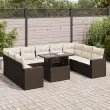 Ta vrtna sedežna garnitura je popoln dodatek za vaše dvorišče, teraso ali verando, saj zagotavlja udoben in vabljiv prostor za klepet z družino in prijatelji ali preprosto za sprostitev in uživanje na prostem. Trpežen material: PE ratan, znan tudi kot poli ratan, je močan sintetični material, ki ne potrebuje vzdrževanja in je videti kot naravni ratan. Je lahek, enostaven za čiščenje in se zaradi svoje vzdržljivosti in odpornosti na vremenske vplive pogosto uporablja za zunanje pohištvo.Funkcija shranjevanja z vodoodporno vrečo: Vsak vrtni sedež ima pod sedežem prostor za shranjevanje, opremljen z vodoodporno vrečo za shranjevanje blazin, igrač in drugih predmetov. Notranja torba ima zgornji pokrov in jo je mogoče varno pritrditi na sedež s kavljem in zanko za večjo stabilnost.Nastavljiva mizna plošča: Z dvigom mizne plošče lahko mizo povišate, s čimer se zunanja klubska mizica spremeni v jedilno mizo. Popolna je za sprejemanje gostov ali uživanje v obrokih na prostem.Prevleko je mogoče odstraniti in oprati: Te sedežne blazine imajo odstranljive prevleke za lažje pranje in vzdrževanje.Robusten in stabilen okvir: Jeklen okvir s prašnim premazom je močan, stabilen, trpežen ter odporen na korozijo in slabe vremenske razmere, kar zagotavlja dolgotrajno delovanje. Dobro je vedeti:Če želite, da vaše zunanje pohištvo ostane lepo, vam priporočamo, da ga zaščitite z vodoodporno prevleko.Dimenzije vodoodporne vreče: 55 x 53 x 34 cm (D x Š x V)Največja dovoljena teža (na sedež): 110 kgUV-odpornoPlastične nastavljive nogePotrebno sestavljanje: DaSrednji sedež:Barva: RjavaMaterial: PE ratan, jeklen okvir s prašnim premazomDimenzije: 55 x 62 x 69 cm (Š x G x V)Velikost sedeža: 55 x 55 cm (Š x G)Višina sedeža od tal (brez blazine): 37 cmKotni sedež:Barva: RjavaMaterial: PE ratan, jeklen okvir s prašnim premazomDimenzije: 62 x 62 x 69 cm (Š x G x V)Velikost sedeža: 55 x 55 cm (Š x G)Višina sedeža od tal (brez blazine): 37 cmKavč z naslonjali za roke:Barva: RjavaMaterial: PE ratan, jeklen okvir s prašnim premazomDimenzije: 65,5 x 62 x 69 cm (Š x G x V)Velikost sedeža: 55 x 55 cm (Š x G)Višina sedeža od tal (brez blazine): 37 cmVišina naslonjal za roke od tal: 55 cmMiza:Barva: RjavaMaterial: PE ratan, jeklo s prašnim premazom, kaljeno stekloDimenzije: 100 x 55 x 44/73 cm (D x Š x V)Blazina:Barva: Kremno belaMaterial prevleke: Tkanina (100 % poliester)Polnilo sedežne blazine: PenaPolnilo hrbtne blazine: bombažna vlaknaDimenzije sedežne blazine: 55 x 55 x 3 cm (Š x G x D)Dimenzije hrbtne blazine: 55 x 45 x 13 cm (D x Š x D)Paket vsebuje:5 x Srednji sedež s funkcijo shranjevanja z vodoodporno vrečo2 x Kotni kavč s funkcijo shranjevanja z vodoodporno vrečo2 x Kavč s funkcijo shranjevanja z vodoodporno vrečo1 x Miza11 x Blazina za hrbet9 x Sedežna blazina s snemljivo in pralno prevleko 3326384