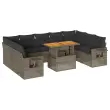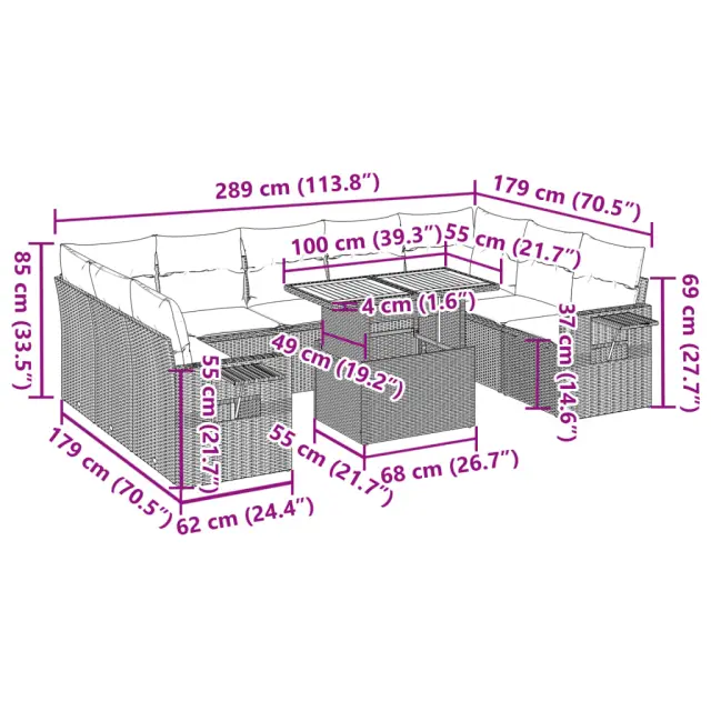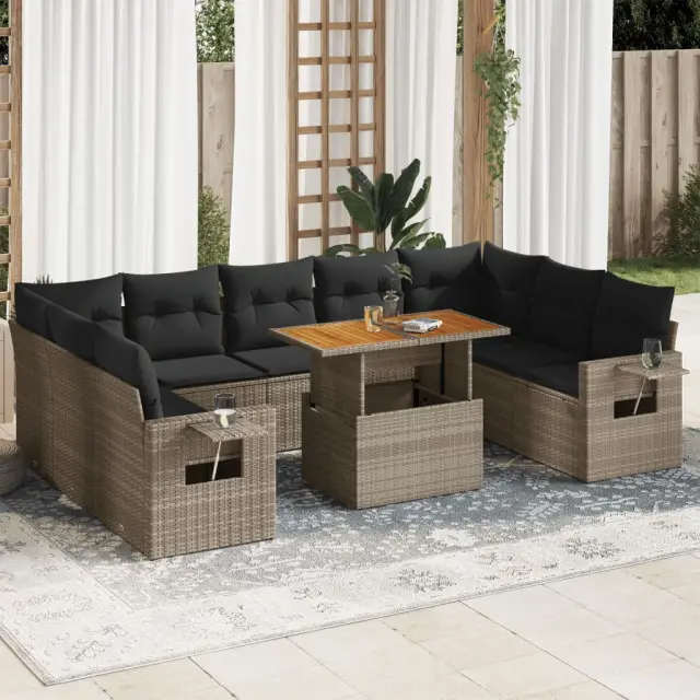Ta vrtna sedežna garnitura je popoln dodatek za vaše dvorišče, teraso ali verando, saj zagotavlja udoben in vabljiv prostor za klepet z družino in prijatelji ali preprosto za sprostitev in uživanje na prostem. Trpežen material: PE ratan, znan tudi kot poli ratan, je močan sintetični material, ki ne potrebuje vzdrževanja in je videti kot naravni ratan. Je lahek, enostaven za čiščenje in se zaradi svoje vzdržljivosti in odpornosti na vremenske vplive pogosto uporablja za zunanje pohištvo.Funkcija shranjevanja z vodoodporno torbo: Vrtno pohištvo ima pod sedežem prostor za shranjevanje, opremljen z vodoodporno torbo za shranjevanje blazin, igrač in drugih stvari. Notranjo torbo je mogoče varno pritrditi na zunanje pohištvo s kavljem in zanko za večjo stabilnost.Nastavljiva mizna plošča: Z dvigom mizne plošče lahko mizo povišate, s čimer se zunanja klubska mizica spremeni v jedilno mizo. Popolna je za sprejemanje gostov ali uživanje v obrokih na prostem.Prevleko je mogoče odstraniti in oprati: Te sedežne blazine imajo odstranljive prevleke za lažje pranje in vzdrževanje.Modularna zasnova: Ta komplet zunanjega pohištva ima modularno zasnovo, zaradi česar je popolnoma prilagodljiv in enostaven za premikanje, tako da lahko zunanjo garnituro postavite kakor koli želite. Dobro je vedeti:Če želite, da vaše zunanje pohištvo ostane lepo, vam priporočamo, da ga zaščitite z vodoodporno prevleko.Dimenzije vodoodporne vreče: 55 x 53 x 34 cm (D x Š x V)Maksimalna nosilnost (na sedež): 110 kgUV-odpornoPlastične nastavljive nogePotrebno sestavljanje: DaKotni sedež:Barva: SivaMaterial: PE ratan, jeklen okvir s prašnim premazomDimenzije: 62 x 62 x 69 cm (Š x G x V)Velikost sedeža: 55 x 55 cm (Š x G)Višina sedeža od tal (brez blazine): 37 cmKotni sedež s naslonom za roke iz ratana:Barva: SivaMaterial: PE ratan, jeklen okvir s prašnim premazomDimenzije: 62 x 62 x 69 cm (Š x G x V)Velikost sedeža: 55 x 55 cm (Š x G)Višina sedeža od tal (brez blazine): 37 cmVišina naslonjal za roke od tal: 55 cmŠirina naslonjala za roke: 6 cmVelikost stranske mizice: 25 x 23 cm (D x Š)Srednji sedež:Barva: SivaMaterial: PE ratan, jeklen okvir s prašnim premazomDimenzije: 55 x 62 x 69 cm (Š x G x V)Velikost sedeža: 55 x 55 cm (Š x G)Višina sedeža od tal (brez blazine): 37 cmMiza:Barva: SivaMaterial: PE ratan, prašno premazano jeklo, trden akacijev les z oljnim premazomDimenzije: 55 x 55 x 37 cm (D x Š x V)Blazina:Barva: Temno sivaMaterial prevleke: Tkanina (100 % poliester)Polnilo sedežne blazine: PenaPolnilo hrbtne blazine: bombažna vlaknaDimenzije sedežne blazine: 55 x 55 x 3 cm (Š x G x D)Dimenzije hrbtne blazine: 55 x 45 x 13 cm (D x Š x D)Paket vsebuje:1 x Vrtna miza2 x Kotni kavč s funkcijo shranjevanja z vodoodporno vrečo2 x Kotni sedež z naslonom za roke iz ratana s funkcijo shranjevanja z vodoodporno torbo5 x Srednji sedež s funkcijo shranjevanja z vodoodporno vrečo11 x Blazina za hrbet9 x Sedežna blazina s snemljivo in pralno prevleko 3327196