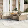 Ta vrtna sedežna garnitura je popoln dodatek za vaše dvorišče, teraso ali verando, saj zagotavlja udoben in vabljiv prostor za klepet z družino in prijatelji ali preprosto za sprostitev in uživanje na prostem.Trpežen material: PE ratan, znan tudi kot poli ratan, je močan sintetični material, ki ne potrebuje vzdrževanja in je videti kot naravni ratan. Je lahek, enostaven za čiščenje in se zaradi svoje vzdržljivosti in odpornosti na vremenske vplive pogosto uporablja za zunanje pohištvo.Funkcija shranjevanja z vodoodporno vrečo: Vsak vrtni sedež ima prostor za shranjevanje pod sedežem, skupaj z vodoodporno vrečo za shranjevanje blazin, igrač in drugih predmetov. Notranje vreče imajo zgornjo prevleko in jih je mogoče s pomočjo primenjal varno pritrditi na sedeže za dodatno varnost.Prevleko je mogoče odstraniti in oprati: Te sedežne blazine imajo odstranljive prevleke za lažje pranje in vzdrževanje.Modularna zasnova: Ta komplet zunanjega pohištva ima modularno zasnovo, zaradi česar je popolnoma prilagodljiv in enostaven za premikanje, tako da lahko zunanjo garnituro postavite kakor koli želite.Dobro je vedeti:Če želite, da vaše zunanje pohištvo ostane lepo, vam priporočamo, da ga zaščitite z vodoodporno prevleko.Največja dovoljena teža (na sedež): 110 kgUV-odpornoPlastične nastavljive nogePotrebno sestavljanje: DaSrednji sedež:Barva: BežMaterial: PE ratan, jeklen okvir s prašnim premazomDimenzije: 55 x 62 x 69 cm (Š x G x V)Velikost sedeža: 55 x 55 cm (Š x G)Višina sedeža od tal (brez blazine): 37 cmKotni sedež:Barva: BežMaterial: PE ratan, jeklen okvir s prašnim premazomDimenzije: 62 x 62 x 69 cm (Š x G x V)Velikost sedeža: 55 x 55 cm (Š x G)Višina sedeža od tal (brez blazine): 37 cmKotni sedež s naslonom za roke iz ratana:Barva: BežMaterial: PE ratan, jeklen okvir s prašnim premazomDimenzije: 93 x 62 x 69 cm (Š x G x V)Velikost sedeža: 55 x 55 cm (Š x G)Višina sedeža od tal (brez blazine): 37 cmVišina naslonjal za roke od tal: 55 cmŠirina naslona za roke: 27,5 cmMiza:Barva: BežMaterial: PE ratan, prašno premazano jeklo, trden akacijev les z oljnim premazomDimenzije: 100 x 55 x 44/73 cm (D x Š x V)Blazina:Barva: Kremno belaMaterial prevleke: Tkanina (100 % poliester)Polnilo sedežne blazine: PenaPolnilo hrbtne blazine: bombažna vlaknaDimenzije sedežne blazine: 55 x 55 x 3 cm (Š x G x D)Dimenzije hrbtne blazine: 55 x 45 x 13 cm (D x Š x D)Paket vsebuje:1 x Vrtna miza1 x Kotni kavč s funkcijo shranjevanja z vodoodporno vrečo1 x Kotni sedež z naslonom za roke iz ratana s funkcijo shranjevanja z vodoodporno torbo2 x Kotni sedež z naslonom za roke iz ratana s funkcijo shranjevanja z vodoodporno torbo5 x Srednji sedež s funkcijo shranjevanja z vodoodporno vrečo9 x Sedežna blazina s snemljivo in pralno prevleko11 x Blazina za hrbet 3327418