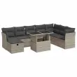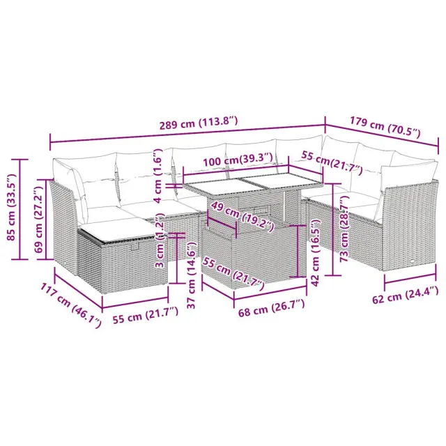 Ta vrtna sedežna garnitura je popoln dodatek za vaše dvorišče, teraso ali verando, saj zagotavlja udoben in vabljiv prostor za klepet z družino in prijatelji ali preprosto za sprostitev in uživanje na prostem.Trpežen material: PE ratan, znan tudi kot poli ratan, je močan sintetični material, ki ne potrebuje vzdrževanja in je videti kot naravni ratan. Je lahek, enostaven za čiščenje in se zaradi svoje vzdržljivosti in odpornosti na vremenske vplive pogosto uporablja za zunanje pohištvo.Funkcija shranjevanja z vodoodporno vrečo: Vsak vrtni sedež ima prostor za shranjevanje pod sedežem, skupaj z vodoodporno vrečo za shranjevanje blazin, igrač in drugih predmetov. Notranje vreče imajo zgornjo prevleko in jih je mogoče s pomočjo primenjal varno pritrditi na sedeže za dodatno varnost.Prevleko je mogoče odstraniti in oprati: Te sedežne blazine imajo odstranljive prevleke za lažje pranje in vzdrževanje.Modularna zasnova: Ta komplet zunanjega pohištva ima modularno zasnovo, zaradi česar je popolnoma prilagodljiv in enostaven za premikanje, tako da lahko zunanjo garnituro postavite kakor koli želite.Dobro je vedeti:Če želite, da vaše zunanje pohištvo ostane lepo, vam priporočamo, da ga zaščitite z vodoodporno prevleko.Največja dovoljena teža (na sedež): 110 kgUV-odpornoPlastične nastavljive nogePotrebno sestavljanje: DaSrednji sedež:Barva: Svetlo sivaMaterial: PE ratan, jeklen okvir s prašnim premazomDimenzije: 55 x 62 x 69 cm (Š x G x V)Velikost sedeža: 55 x 55 cm (Š x G)Višina sedeža od tal (brez blazine): 37 cmKotni sedež:Barva: Svetlo sivaMaterial: PE ratan, jeklen okvir s prašnim premazomDimenzije: 62 x 62 x 69 cm (Š x G x V)Velikost sedeža: 55 x 55 cm (Š x G)Višina sedeža od tal (brez blazine): 37 cmKotni sedež:Barva: Svetlo sivaMaterial: PE ratan, jeklen okvir s prašnim premazomDimenzije: 62 x 62 x 69 cm (Š x G x V)Velikost sedeža: 55 x 55 cm (Š x G)Višina sedeža od tal (brez blazine): 37 cmStolček:Barva: Svetlo sivaMaterial: PE ratan, jeklen okvir s prašnim premazomDimenzije: 55 x 55 x 37 cm (Š x G x V)Miza:Barva: Svetlo sivaMaterial: PE ratan, jeklo s prašnim premazom, kaljeno stekloDimenzije: 100 x 55 x 44/73 cm (D x Š x V)Blazina:Barva: Temno sivaMaterial prevleke: Tkanina (100 % poliester)Polnilo sedežne blazine: PenaPolnilo hrbtne blazine: bombažna vlaknaDimenzije sedežne blazine: 55 x 55 x 3 cm (Š x G x D)Dimenzije hrbtne blazine: 55 x 45 x 13 cm (D x Š x D)Paket vsebuje:1 x Vrtna miza3 x Kotni kavč s funkcijo shranjevanja z vodoodporno vrečo4 x Srednji kavč s funkcijo shranjevanja z vodoodporno vrečo1 x Stolček s funkcijo shranjevanja z vodoodporno vrečo8 x Sedežna blazina s snemljivo in pralno prevleko10 x Blazina za hrbet 3327802