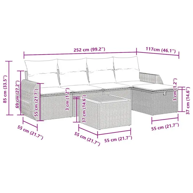 Ta vrtna sedežna garnitura je popoln dodatek za vaše dvorišče, teraso ali verando, saj zagotavlja udoben in vabljiv prostor za klepet z družino in prijatelji ali preprosto za sprostitev in uživanje na prostem. Trpežen material: PE ratan, znan tudi kot poli ratan, je močan sintetični material, ki ne potrebuje vzdrževanja in je videti kot naravni ratan. Je lahek, enostaven za čiščenje in se zaradi svoje vzdržljivosti in odpornosti na vremenske vplive pogosto uporablja za zunanje pohištvo.Funkcija shranjevanja z vodoodporno torbo: Vrtno pohištvo ima pod sedežem prostor za shranjevanje, opremljen z vodoodporno torbo za shranjevanje blazin, igrač in drugih stvari. Notranjo torbo je mogoče varno pritrditi na zunanje pohištvo s kavljem in zanko za večjo stabilnost.Vsestranski stolček za noge: Stolček je vsestransko uporaben, saj služi kot udoben naslon za noge, ko ležite na kavču, ali kot dodaten sedež na vrtu.Prevleko je mogoče odstraniti in oprati: Te sedežne blazine imajo odstranljive prevleke za lažje pranje in vzdrževanje.Modularna zasnova: Ta komplet zunanjega pohištva ima modularno zasnovo, zaradi česar je popolnoma prilagodljiv in enostaven za premikanje, tako da lahko zunanjo garnituro postavite kakor koli želite. Dobro je vedeti:Če želite, da vaše zunanje pohištvo ostane lepo, vam priporočamo, da ga zaščitite z vodoodporno prevleko.Dimenzije vodoodporne vreče: 55 x 53 x 34 cm (D x Š x V)Največja dovoljena teža (na sedež): 110 kgUV-odpornoPlastične nastavljive nogePotrebno sestavljanje: DaKavč z naslonjali za roke:Barva: BežMaterial: PE ratan, jeklen okvir s prašnim premazomDimenzije: 71 x 62 x 69 cm (Š x G x V)Velikost sedeža: 55 x 55 cm (Š x G)Višina sedeža od tal (brez blazine): 37 cmVišina naslonjal za roke od tal: 55 cmSrednji sedež:Barva: BežMaterial: PE ratan, jeklen okvir s prašnim premazomDimenzije: 55 x 62 x 69 cm (Š x G x V)Velikost sedeža: 55 x 55 cm (Š x G)Višina sedeža od tal (brez blazine): 37 cmStolček za noge:Barva: BežMaterial: PE ratan, jeklen okvir s prašnim premazomDimenzije: 55 x 55 x 37 cm (Š x G x V)Vrtna miza:Barva: Bež in rjavaMaterial: PE ratan, prašno premazano jeklo, trden akacijev les z oljnim premazomDimenzije: 55 x 55 x 37 cm (Š x G x V)Blazina:Barva: Svetlo sivaMaterial prevleke: Tkanina (100 % poliester)Polnilo sedežne blazine: PenaPolnilo hrbtne blazine: bombažna vlaknaDimenzije sedežne blazine: 55 x 55 x 3 cm (Š x G x D)Dimenzije hrbtne blazine: 55 x 45 x 13 cm (D x Š x D) Paket vsebuje:2 x Kavč s funkcijo shranjevanja z vodoodporno vrečo2 x Srednji kavč s funkcijo shranjevanja z vodoodporno vrečo1 x Stolček s funkcijo shranjevanja1 x Vrtna miza6 x Blazina za hrbet5 x Sedežna blazina s snemljivo pralno prevleko 3325839