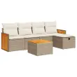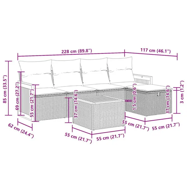 Ta vrtna sedežna garnitura je popoln dodatek za vaše dvorišče, teraso ali verando, saj zagotavlja udoben in vabljiv prostor za klepet z družino in prijatelji ali preprosto za sprostitev in uživanje na prostem. Trpežen material: PE ratan, znan tudi kot poli ratan, je močan sintetični material, ki ne potrebuje vzdrževanja in je videti kot naravni ratan. Je lahek, enostaven za čiščenje in se zaradi svoje vzdržljivosti in odpornosti na vremenske vplive pogosto uporablja za zunanje pohištvo.Funkcija shranjevanja z vodoodporno vrečo: Vsak vrtni sedež ima pod sedežem prostor za shranjevanje, opremljen z vodoodporno vrečo za shranjevanje blazin, igrač in drugih predmetov. Notranja torba ima zgornji pokrov in jo je mogoče varno pritrditi na sedež s kavljem in zanko za večjo stabilnost.Stabilna mizna plošča, ki je enostavna za čiščenje: Ta vrtna miza ima ploščo iz akacijevega lesa, ki je čvrsta, vzdržljiva in jo je enostavno čistiti z vlažno krpo.Vsestranski stolček za noge: Stolček je vsestransko uporaben, saj služi kot udoben naslon za noge, ko ležite na kavču, ali kot dodaten sedež na vrtu.Prevleko je mogoče odstraniti in oprati: Te sedežne blazine imajo odstranljive prevleke za lažje pranje in vzdrževanje.Robusten in stabilen okvir: Jeklen okvir s prašnim premazom je močan, stabilen, trpežen ter odporen na korozijo in slabe vremenske razmere, kar zagotavlja dolgotrajno delovanje. Dobro je vedeti:Če želite, da vaše zunanje pohištvo ostane lepo, vam priporočamo, da ga zaščitite z vodoodporno prevleko.Dimenzije vodoodporne vreče: 55 x 53 x 34 cm (D x Š x V)Največja dovoljena teža (na sedež): 110 kgUV-odpornoPlastične nastavljive nogePotrebno sestavljanje: DaSrednji sedež:Barva: BežMaterial: PE ratan, jeklen okvir s prašnim premazomDimenzije: 55 x 62 x 69 cm (Š x G x V)Velikost sedeža: 55 x 55 cm (Š x G)Višina sedeža od tal (brez blazine): 37 cmKavč z naslonjali za roke:Barva: BežMaterial: PE ratan, prašno premazano jeklo, trden akacijev les z oljnim premazomDimenzije: 59 x 62 x 69 cm (Š x G x V)Velikost sedeža: 55 x 55 cm (Š x G)Višina sedeža od tal (brez blazine): 37 cmVišina naslonjal za roke od tal (brez blazine): 55 cmMiza:Barva: BežMaterial: PE ratan, prašno premazano jeklo, trden akacijev les z oljnim premazomDimenzije: 55 x 55 x 37 cm (D x Š x V)Stolček za noge:Barva: BežMaterial: PE ratan, jeklen okvir s prašnim premazomDimenzije: 55 x 55 x 37 cm (Š x G x V)Blazina:Barva: Kremno belaMaterial prevleke: Tkanina (100 % poliester)Polnilo sedežne blazine: PenaPolnilo hrbtne blazine: bombažna vlaknaDimenzije sedežne blazine: 55 x 55 x 3 cm (Š x G x D)Dimenzije hrbtne blazine: 55 x 45 x 13 cm (D x Š x D)Paket vsebuje:2 x Srednji kavč s funkcijo shranjevanja z vodoodporno vrečo2 x Kavč s funkcijo shranjevanja z vodoodporno vrečo1 x Stolček s funkcijo shranjevanja1 x Miza4 x Blazina za hrbet5 x Sedežna blazina s snemljivo pralno prevleko 3326020
