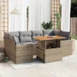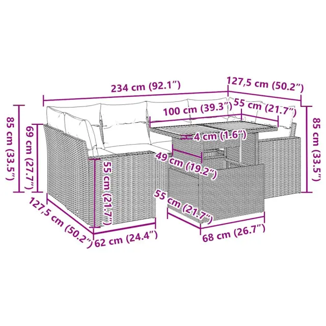 Ta vrtna sedežna garnitura je popoln dodatek za vaše dvorišče, teraso ali verando, saj zagotavlja udoben in vabljiv prostor za klepet z družino in prijatelji ali preprosto za sprostitev in uživanje na prostem. Trpežen material: PE ratan, znan tudi kot poli ratan, je močan sintetični material, ki ne potrebuje vzdrževanja in je videti kot naravni ratan. Je lahek, enostaven za čiščenje in se zaradi svoje vzdržljivosti in odpornosti na vremenske vplive pogosto uporablja za zunanje pohištvo.Funkcija shranjevanja z vodoodporno torbo: Vrtno pohištvo ima pod sedežem prostor za shranjevanje, opremljen z vodoodporno torbo za shranjevanje blazin, igrač in drugih stvari. Notranjo torbo je mogoče varno pritrditi na zunanje pohištvo s kavljem in zanko za večjo stabilnost.Nastavljiva mizna plošča: Z dvigom mizne plošče lahko mizo povišate, s čimer se zunanja klubska mizica spremeni v jedilno mizo. Popolna je za sprejemanje gostov ali uživanje v obrokih na prostem.Prevleko je mogoče odstraniti in oprati: Te sedežne blazine imajo odstranljive prevleke za lažje pranje in vzdrževanje.Modularna zasnova: Ta komplet zunanjega pohištva ima modularno zasnovo, zaradi česar je popolnoma prilagodljiv in enostaven za premikanje, tako da lahko zunanjo garnituro postavite kakor koli želite. Dobro je vedeti:Če želite, da vaše zunanje pohištvo ostane lepo, vam priporočamo, da ga zaščitite z vodoodporno prevleko.Dimenzije vodoodporne vreče: 55 x 53 x 34 cm (D x Š x V)Maksimalna nosilnost (na sedež): 110 kgUV-odpornoPlastične nastavljive nogePotrebno sestavljanje: DaKotni sedež:Barva: BežMaterial: PE ratan, jeklen okvir s prašnim premazomDimenzije: 62 x 62 x 69 cm (Š x G x V)Velikost sedeža: 55 x 55 cm (Š x G)Višina sedeža od tal (brez blazine): 37 cmKotni sedež s naslonom za roke iz ratana:Barva: BežMaterial: PE ratan, jeklen okvir s prašnim premazomDimenzije: 65,5 x 62 x 69 cm (Š x G x V)Velikost sedeža: 55 x 55 cm (Š x G)Višina sedeža od tal (brez blazine): 37 cmVišina naslonjal za roke od tal: 55 cmŠirina naslonjala za roke: 10 cmSrednji sedež:Barva: BežMaterial: PE ratan, jeklen okvir s prašnim premazomDimenzije: 55 x 62 x 69 cm (Š x G x V)Velikost sedeža: 55 x 55 cm (Š x G)Višina sedeža od tal (brez blazine): 37 cmMiza:Barva: BežMaterial: PE ratan, prašno premazano jeklo, trden akacijev les z oljnim premazomDimenzije: 100 x 55 x 44/73 cm (D x Š x V)Blazina:Barva: Svetlo sivaMaterial prevleke: Tkanina (100 % poliester)Polnilo sedežne blazine: PenaPolnilo hrbtne blazine: bombažna vlaknaDimenzije sedežne blazine: 55 x 55 x 3 cm (Š x G x D)Dimenzije hrbtne blazine: 55 x 45 x 13 cm (D x Š x D)Paket vsebuje:1 x Vrtna miza2 x Kotni kavč s funkcijo shranjevanja z vodoodporno vrečo2 x Kotni sedež z naslonom za roke iz ratana s funkcijo shranjevanja z vodoodporno torbo2 x Srednji kavč s funkcijo shranjevanja z vodoodporno vrečo8 x Blazina za hrbet6 x Sedežna blazina s snemljivo pralno prevleko 3327006