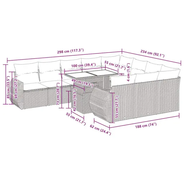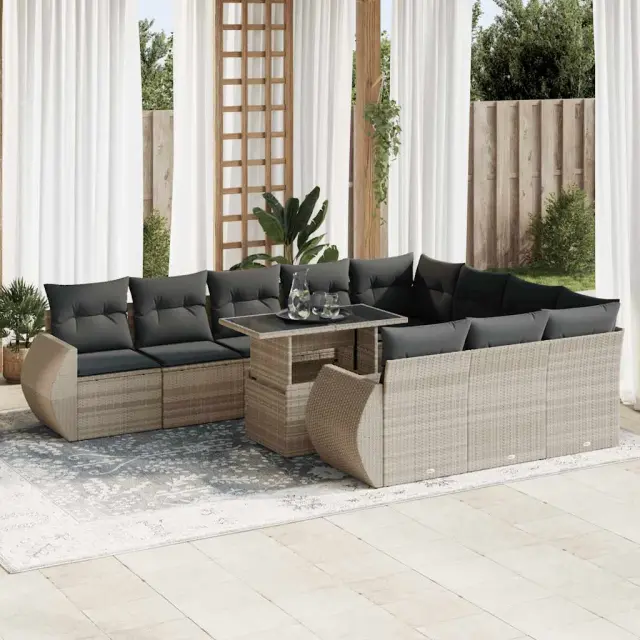 Ta vrtna sedežna garnitura je popoln dodatek za vaše dvorišče, teraso ali verando, saj zagotavlja udoben in vabljiv prostor za klepet z družino in prijatelji ali preprosto za sprostitev in uživanje na prostem. Trpežen material: PE ratan, znan tudi kot poli ratan, je močan sintetični material, ki ne potrebuje vzdrževanja in je videti kot naravni ratan. Je lahek, enostaven za čiščenje in se zaradi svoje vzdržljivosti in odpornosti na vremenske vplive pogosto uporablja za zunanje pohištvo.Funkcija shranjevanja z vodoodporno torbo: Vrtno pohištvo ima pod sedežem prostor za shranjevanje, opremljen z vodoodporno torbo za shranjevanje blazin, igrač in drugih stvari. Notranjo torbo je mogoče varno pritrditi na zunanje pohištvo s kavljem in zanko za večjo stabilnost.Nastavljiva mizna plošča: Z dvigom mizne plošče lahko mizo povišate, s čimer se zunanja klubska mizica spremeni v jedilno mizo. Popolna je za sprejemanje gostov ali uživanje v obrokih na prostem.Prevleko je mogoče odstraniti in oprati: Te sedežne blazine imajo odstranljive prevleke za lažje pranje in vzdrževanje.Modularna zasnova: Ta komplet zunanjega pohištva ima modularno zasnovo, zaradi česar je popolnoma prilagodljiv in enostaven za premikanje, tako da lahko zunanjo garnituro postavite kakor koli želite. Dobro je vedeti:Če želite, da vaše zunanje pohištvo ostane lepo, vam priporočamo, da ga zaščitite z vodoodporno prevleko.Dimenzije vodoodporne vreče: 55 x 53 x 34 cm (D x Š x V)Maksimalna nosilnost (na sedež): 110 kgUV-odpornoPlastične nastavljive nogePotrebno sestavljanje: DaKotni sedež:Barva: Svetlo sivaMaterial: PE ratan, jeklen okvir s prašnim premazomDimenzije: 62 x 62 x 69 cm (Š x G x V)Velikost sedeža: 55 x 55 cm (Š x G)Višina sedeža od tal (brez blazine): 37 cmKotni sedež s naslonom za roke iz ratana:Barva: Svetlo sivaMaterial: PE ratan, jeklen okvir s prašnim premazomDimenzije: 71 x 62 x 69 cm (Š x G x V)Velikost sedeža: 55 x 55 cm (Š x G)Višina sedeža od tal (brez blazine): 37 cmVišina naslonjal za roke od tal: 55 cmSrednji sedež:Barva: Svetlo sivaMaterial: PE ratan, jeklen okvir s prašnim premazomDimenzije: 55 x 62 x 69 cm (Š x G x V)Velikost sedeža: 55 x 55 cm (Š x G)Višina sedeža od tal (brez blazine): 37 cmMiza:Barva: Svetlo sivaMaterial: PE ratan, jeklo s prašnim premazom, kaljeno stekloDimenzije: 100 x 55 x 44/73 cm (D x Š x V)Blazina:Barva: Temno sivaMaterial prevleke: Tkanina (100 % poliester)Polnilo sedežne blazine: PenaPolnilo hrbtne blazine: bombažna vlaknaDimenzije sedežne blazine: 55 x 55 x 3 cm (Š x G x D)Dimenzije hrbtne blazine: 55 x 45 x 13 cm (D x Š x D)Paket vsebuje:1 x Vrtna miza2 x Kotni kavč s funkcijo shranjevanja z vodoodporno vrečo2 x Kotni sedež z naslonom za roke iz ratana s funkcijo shranjevanja z vodoodporno torbo6 x Srednji kavč s funkcijo shranjevanja z vodoodporno vrečo12 x Blazina za hrbet10 x Sedežna blazina s snemljivo in pralno prevleko 3326713