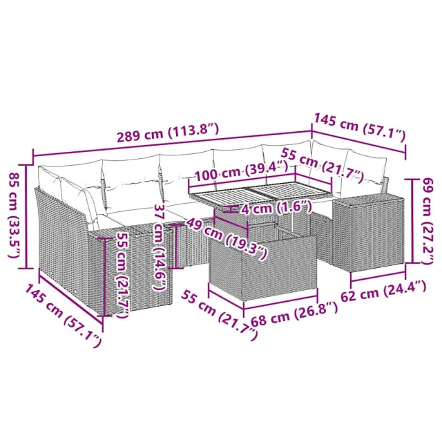 Ta vrtna sedežna garnitura je popoln dodatek za vaše dvorišče, teraso ali verando, saj zagotavlja udoben in vabljiv prostor za klepet z družino in prijatelji ali preprosto za sprostitev in uživanje na prostem. Trpežen material: PE ratan, znan tudi kot poli ratan, je močan sintetični material, ki ne potrebuje vzdrževanja in je videti kot naravni ratan. Je lahek, enostaven za čiščenje in se zaradi svoje vzdržljivosti in odpornosti na vremenske vplive pogosto uporablja za zunanje pohištvo.Funkcija shranjevanja z vodoodporno torbo: Vrtno pohištvo ima pod sedežem prostor za shranjevanje, opremljen z vodoodporno torbo za shranjevanje blazin, igrač in drugih stvari. Notranjo torbo je mogoče varno pritrditi na zunanje pohištvo s kavljem in zanko za večjo stabilnost.Nastavljiva mizna plošča: Z dvigom mizne plošče lahko mizo povišate, s čimer se zunanja klubska mizica spremeni v jedilno mizo. Popolna je za sprejemanje gostov ali uživanje v obrokih na prostem.Prevleko je mogoče odstraniti in oprati: Te sedežne blazine imajo odstranljive prevleke za lažje pranje in vzdrževanje.Modularna zasnova: Ta komplet zunanjega pohištva ima modularno zasnovo, zaradi česar je popolnoma prilagodljiv in enostaven za premikanje, tako da lahko zunanjo garnituro postavite kakor koli želite. Dobro je vedeti:Če želite, da vaše zunanje pohištvo ostane lepo, vam priporočamo, da ga zaščitite z vodoodporno prevleko.Dimenzije vodoodporne vreče: 55 x 53 x 34 cm (D x Š x V)Maksimalna nosilnost (na sedež): 110 kgUV-odpornoPlastične nastavljive nogePotrebno sestavljanje: DaKotni sedež:Barva: ČrnaMaterial: PE ratan, jeklen okvir s prašnim premazomDimenzije: 62 x 62 x 69 cm (Š x G x V)Velikost sedeža: 55 x 55 cm (Š x G)Višina sedeža od tal (brez blazine): 37 cmKotni sedež s naslonom za roke iz ratana:Barva: ČrnaMaterial: PE ratan, jeklen okvir s prašnim premazomDimenzije: 83 x 62 x 69 cm (Š x G x V)Velikost sedeža: 55 x 55 cm (Š x G)Višina sedeža od tal (brez blazine): 37 cmVišina naslonjal za roke od tal: 55 cmŠirina naslona za roke: 27,5 cmSrednji sedež:Barva: ČrnaMaterial: PE ratan, jeklen okvir s prašnim premazomDimenzije: 55 x 62 x 69 cm (Š x G x V)Velikost sedeža: 55 x 55 cm (Š x G)Višina sedeža od tal (brez blazine): 37 cmMiza:Barva: ČrnaMaterial: PE ratan, prašno premazano jeklo, trden akacijev les z oljnim premazomDimenzije: 100 x 55 x 44/73 cm (D x Š x V)Blazina:Barva: Kremno belaMaterial prevleke: Tkanina (100 % poliester)Polnilo sedežne blazine: PenaPolnilo hrbtne blazine: bombažna vlaknaDimenzije sedežne blazine: 55 x 55 x 3 cm (Š x G x D)Dimenzije hrbtne blazine: 55 x 45 x 13 cm (D x Š x D)Paket vsebuje:1 x Vrtna miza2 x Kotni kavč s funkcijo shranjevanja z vodoodporno vrečo2 x Kotni sedež z naslonom za roke iz ratana s funkcijo shranjevanja z vodoodporno torbo3 x Srednji kavč s funkcijo shranjevanja z vodoodporno vrečo9 x Blazina za hrbet7 x Sedežna blazina s snemljivo in pralno prevleko 3327346