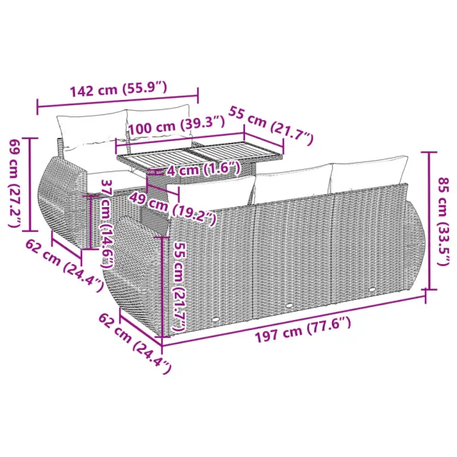 Ta vrtna sedežna garnitura je popoln dodatek za vaše dvorišče, teraso ali verando, saj zagotavlja udoben in vabljiv prostor za klepet z družino in prijatelji ali preprosto za sprostitev in uživanje na prostem. Trpežen material: PE ratan, znan tudi kot poli ratan, je močan sintetični material, ki ne potrebuje vzdrževanja in je videti kot naravni ratan. Je lahek, enostaven za čiščenje in se zaradi svoje vzdržljivosti in odpornosti na vremenske vplive pogosto uporablja za zunanje pohištvo.Funkcija shranjevanja z vodoodporno torbo: Vrtno pohištvo ima pod sedežem prostor za shranjevanje, opremljen z vodoodporno torbo za shranjevanje blazin, igrač in drugih stvari. Notranjo torbo je mogoče varno pritrditi na zunanje pohištvo s kavljem in zanko za večjo stabilnost.Nastavljiva mizna plošča: Z dvigom mizne plošče lahko mizo povišate, s čimer se zunanja klubska mizica spremeni v jedilno mizo. Popolna je za sprejemanje gostov ali uživanje v obrokih na prostem.Prevleko je mogoče odstraniti in oprati: Te sedežne blazine imajo odstranljive prevleke za lažje pranje in vzdrževanje.Modularna zasnova: Ta komplet zunanjega pohištva ima modularno zasnovo, zaradi česar je popolnoma prilagodljiv in enostaven za premikanje, tako da lahko zunanjo garnituro postavite kakor koli želite. Dobro je vedeti:Če želite, da vaše zunanje pohištvo ostane lepo, vam priporočamo, da ga zaščitite z vodoodporno prevleko.Dimenzije vodoodporne vreče: 55 x 53 x 34 cm (D x Š x V)Maksimalna nosilnost (na sedež): 110 kgUV-odpornoPlastične nastavljive nogePotrebno sestavljanje: DaKotni sedež:Barva: SivaMaterial: PE ratan, jeklen okvir s prašnim premazomDimenzije: 71 x 62 x 69 cm (Š x G x V)Velikost sedeža: 55 x 55 cm (Š x G)Višina sedeža od tal (brez blazine): 37 cmVišina naslonjal za roke od tal: 55 cmSrednji sedež:Barva: SivaMaterial: PE ratan, jeklen okvir s prašnim premazomDimenzije: 55 x 62 x 69 cm (Š x G x V)Velikost sedeža: 55 x 55 cm (Š x G)Višina sedeža od tal (brez blazine): 37 cmMiza:Barva: SivaMaterial: PE ratan, prašno premazano jeklo, trden akacijev les z oljnim premazomDimenzije: 100 x 55 x 44/73 cm (D x Š x V)Blazina:Barva: Temno sivaMaterial prevleke: Tkanina (100 % poliester)Polnilo sedežne blazine: PenaPolnilo hrbtne blazine: bombažna vlaknaDimenzije sedežne blazine: 55 x 55 x 3 cm (Š x G x D)Dimenzije hrbtne blazine: 55 x 45 x 13 cm (D x Š x D)Paket vsebuje:1 x Vrtna miza4 x Kotni sedež s funkcijo shranjevanja z vodoodporno vrečo1 x Srednji kavč s funkcijo shranjevanja z vodoodporno vrečo5 x Blazina za hrbet5 x Sedežna blazina s snemljivo pralno prevleko 3327217