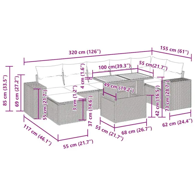 Ta vrtna sedežna garnitura je popoln dodatek za vaše dvorišče, teraso ali verando, saj zagotavlja udoben in vabljiv prostor za klepet z družino in prijatelji ali preprosto za sprostitev in uživanje na prostem. Trpežen material: PE ratan, znan tudi kot poli ratan, je močan sintetični material, ki ne potrebuje vzdrževanja in je videti kot naravni ratan. Je lahek, enostaven za čiščenje in se zaradi svoje vzdržljivosti in odpornosti na vremenske vplive pogosto uporablja za zunanje pohištvo.Funkcija shranjevanja z vodoodporno torbo: Vrtno pohištvo ima pod sedežem prostor za shranjevanje, opremljen z vodoodporno torbo za shranjevanje blazin, igrač in drugih stvari. Notranjo torbo je mogoče varno pritrditi na zunanje pohištvo s kavljem in zanko za večjo stabilnost.Nastavljiva mizna plošča: Z dvigom mizne plošče lahko mizo povišate, s čimer se zunanja klubska mizica spremeni v jedilno mizo. Popolna je za sprejemanje gostov ali uživanje v obrokih na prostem.Prevleko je mogoče odstraniti in oprati: Te sedežne blazine imajo odstranljive prevleke za lažje pranje in vzdrževanje.Modularna zasnova: Ta komplet zunanjega pohištva ima modularno zasnovo, zaradi česar je popolnoma prilagodljiv in enostaven za premikanje, tako da lahko zunanjo garnituro postavite kakor koli želite. Dobro je vedeti:Če želite, da vaše zunanje pohištvo ostane lepo, vam priporočamo, da ga zaščitite z vodoodporno prevleko.Dimenzije vodoodporne vreče: 55 x 53 x 34 cm (D x Š x V)Maksimalna nosilnost (na sedež): 110 kgUV-odpornoPlastične nastavljive nogePotrebno sestavljanje: DaKotni sedež:Barva: BežMaterial: PE ratan, jeklen okvir s prašnim premazomDimenzije: 62 x 62 x 69 cm (Š x G x V)Velikost sedeža: 55 x 55 cm (Š x G)Višina sedeža od tal (brez blazine): 37 cmKotni sedež s naslonom za roke iz ratana:Barva: BežMaterial: PE ratan, jeklen okvir s prašnim premazomDimenzije: 83 x 62 x 69 cm (Š x G x V)Velikost sedeža: 55 x 55 cm (Š x G)Višina sedeža od tal (brez blazine): 37 cmVišina naslonjal za roke od tal: 55 cmŠirina naslona za roke: 27,5 cmSrednji sedež:Barva: BežMaterial: PE ratan, jeklen okvir s prašnim premazomDimenzije: 55 x 62 x 69 cm (Š x G x V)Velikost sedeža: 55 x 55 cm (Š x G)Višina sedeža od tal (brez blazine): 37 cmStolček za noge:Barva: BežMaterial: PE ratan, jeklen okvir s prašnim premazomDimenzije: 55 x 55 x 37 cm (Š x G x V)Miza:Barva: BežMaterial: PE ratan, prašno premazano jeklo, trden akacijev les z oljnim premazomDimenzije: 100 x 55 x 44/73 cm (D x Š x V)Blazina:Barva: Svetlo sivaMaterial prevleke: Tkanina (100 % poliester)Polnilo sedežne blazine: PenaPolnilo hrbtne blazine: bombažna vlaknaDimenzije sedežne blazine: 55 x 55 x 3 cm (Š x G x D)Dimenzije hrbtne blazine: 55 x 45 x 13 cm (D x Š x D)Paket vsebuje:1 x Vrtna miza1 x Kotni kavč s funkcijo shranjevanja z vodoodporno vrečo2 x Kotni sedež z naslonom za roke iz ratana s funkcijo shranjevanja z vodoodporno torbo3 x Srednji kavč s funkcijo shranjevanja z vodoodporno vrečo1 x Stolček za noge s funkcijo shranjevanja z vodoodporno vrečo7 x Hrbtna blazina7 x Sedežna blazina s snemljivo in pralno prevleko 3327405