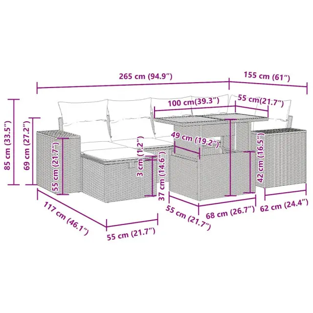 Ta vrtna sedežna garnitura je popoln dodatek za vaše dvorišče, teraso ali verando, saj zagotavlja udoben in vabljiv prostor za klepet z družino in prijatelji ali preprosto za sprostitev in uživanje na prostem.Trpežen material: PE ratan, znan tudi kot poli ratan, je močan sintetični material, ki ne potrebuje vzdrževanja in je videti kot naravni ratan. Je lahek, enostaven za čiščenje in se zaradi svoje vzdržljivosti in odpornosti na vremenske vplive pogosto uporablja za zunanje pohištvo.Funkcija shranjevanja z vodoodporno vrečo: Vsak vrtni sedež ima prostor za shranjevanje pod sedežem, skupaj z vodoodporno vrečo za shranjevanje blazin, igrač in drugih predmetov. Notranje vreče imajo zgornjo prevleko in jih je mogoče s pomočjo primenjal varno pritrditi na sedeže za dodatno varnost.Prevleko je mogoče odstraniti in oprati: Te sedežne blazine imajo odstranljive prevleke za lažje pranje in vzdrževanje.Modularna zasnova: Ta komplet zunanjega pohištva ima modularno zasnovo, zaradi česar je popolnoma prilagodljiv in enostaven za premikanje, tako da lahko zunanjo garnituro postavite kakor koli želite.Dobro je vedeti:Če želite, da vaše zunanje pohištvo ostane lepo, vam priporočamo, da ga zaščitite z vodoodporno prevleko.Dimenzije vodoodporne vreče: 55 x 53 x 34 cm (D x Š x V)Največja dovoljena teža (na sedež): 110 kgUV-odpornoPlastične nastavljive nogePotrebno sestavljanje: DaSrednji sedež:Barva: ČrnaMaterial: PE ratan, jeklen okvir s prašnim premazomDimenzije: 55 x 62 x 69 cm (Š x G x V)Velikost sedeža: 55 x 55 cm (Š x G)Višina sedeža od tal (brez blazine): 37 cmKotni sedež:Barva: ČrnaMaterial: PE ratan, jeklen okvir s prašnim premazomDimenzije: 62 x 62 x 69 cm (Š x G x V)Velikost sedeža: 55 x 55 cm (Š x G)Višina sedeža od tal (brez blazine): 37 cmKavč z naslonjali za roke:Barva: ČrnaMaterial: PE ratan, jeklen okvir s prašnim premazomDimenzije: 93 x 62 x 69 cm (Š x G x V)Velikost sedeža: 55 x 55 cm (Š x G)Višina sedeža od tal (brez blazine): 37 cmVišina naslonjal za roke od tal: 55 cmŠirina naslona za roke: 27,5 cmStolček za noge:Barva: ČrnaMaterial: PE ratan, jeklen okvir s prašnim premazomDimenzije: 55 x 55 x 37 cm (Š x G x V)Miza:Barva: ČrnaMaterial: PE ratan, prašno premazano jeklo, trden akacijev les z oljnim premazomDimenzije: 100 x 55 x 44/73 cm (D x Š x V)Blazina:Barva: Kremno belaMaterial prevleke: Tkanina (100 % poliester)Polnilo sedežne blazine: PenaPolnilo hrbtne blazine: bombažna vlaknaDimenzije sedežne blazine: 55 x 55 x 3 cm (Š x G x D)Dimenzije hrbtne blazine: 55 x 45 x 13 cm (D x Š x D)Paket vsebuje:3 x Srednji kavč s funkcijo shranjevanja z vodoodporno vrečo1 x Kotni kavč s funkcijo shranjevanja z vodoodporno vrečo2 x Kavč s funkcijo shranjevanja z vodoodporno vrečo1 x Stolček za noge s funkcijo shranjevanja z vodoodporno vrečo1 x Miza7 x Hrbtna blazina7 x Sedežna blazina s snemljivo in pralno prevleko 3328085