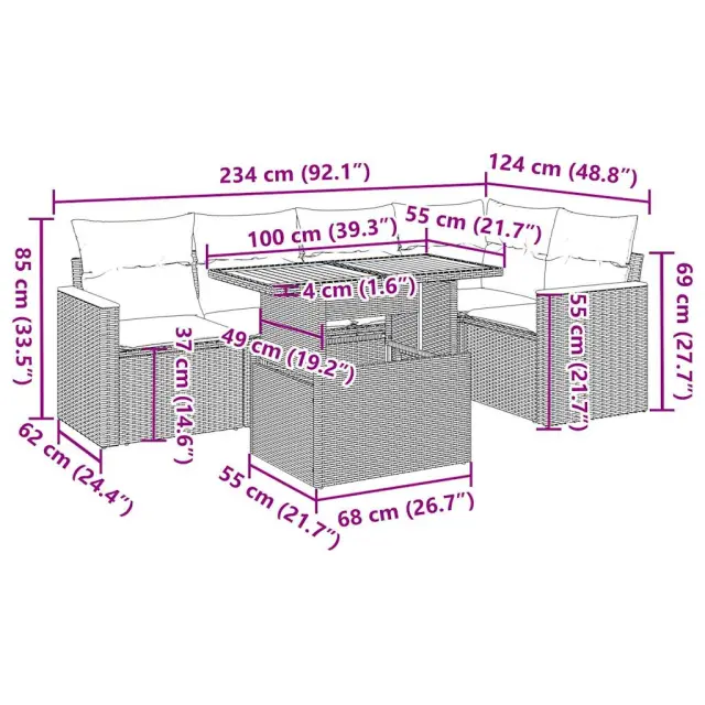 Ta vrtna sedežna garnitura je popoln dodatek za vaše dvorišče, teraso ali verando, saj zagotavlja udoben in vabljiv prostor za klepet z družino in prijatelji ali preprosto za sprostitev in uživanje na prostem.Trpežen material: PE ratan, znan tudi kot poli ratan, je močan sintetični material, ki ne potrebuje vzdrževanja in je videti kot naravni ratan. Je lahek, enostaven za čiščenje in se zaradi svoje vzdržljivosti in odpornosti na vremenske vplive pogosto uporablja za zunanje pohištvo.Funkcija shranjevanja z vodoodporno vrečo: Vsak vrtni sedež ima prostor za shranjevanje pod sedežem, skupaj z vodoodporno vrečo za shranjevanje blazin, igrač in drugih predmetov. Notranje vreče imajo zgornjo prevleko in jih je mogoče s pomočjo primenjal varno pritrditi na sedeže za dodatno varnost.Prevleko je mogoče odstraniti in oprati: Te sedežne blazine imajo odstranljive prevleke za lažje pranje in vzdrževanje.Modularna zasnova: Ta komplet zunanjega pohištva ima modularno zasnovo, zaradi česar je popolnoma prilagodljiv in enostaven za premikanje, tako da lahko zunanjo garnituro postavite kakor koli želite.Dobro je vedeti:Če želite, da vaše zunanje pohištvo ostane lepo, vam priporočamo, da ga zaščitite z vodoodporno prevleko.Največja dovoljena teža (na sedež): 110 kgUV-odpornoPlastične nastavljive nogePotrebno sestavljanje: DaSrednji sedež:Barva: BežMaterial: PE ratan, jeklen okvir s prašnim premazomDimenzije: 55 x 62 x 69 cm (Š x G x V)Velikost sedeža: 55 x 55 cm (Š x G)Višina sedeža od tal (brez blazine): 37 cmKotni sedež:Barva: BežMaterial: PE ratan, jeklen okvir s prašnim premazomDimenzije: 62 x 62 x 69 cm (Š x G x V)Velikost sedeža: 55 x 55 cm (Š x G)Višina sedeža od tal (brez blazine): 37 cmKotni sedež s naslonom za roke iz ratana:Barva: BežMaterial: PE ratan, prašno premazano jeklo, trden akacijev les z oljnim premazomDimenzije: 62 x 62 x 69 cm (Š x G x V)Velikost sedeža: 55 x 55 cm (Š x G)Višina sedeža od tal (brez blazine): 37 cmVišina naslonjal za roke od tal: 55 cmMiza:Barva: BežMaterial: PE ratan, prašno premazano jeklo, trden akacijev les z oljnim premazomDimenzije: 100 x 55 x 44/73 cm (D x Š x V)Blazina:Barva: Kremno belaMaterial prevleke: Tkanina (100 % poliester)Polnilo sedežne blazine: PenaPolnilo hrbtne blazine: bombažna vlaknaDimenzije sedežne blazine: 55 x 55 x 3 cm (Š x G x D)Dimenzije hrbtne blazine: 55 x 45 x 13 cm (D x Š x D)Paket vsebuje:1 x Vrtna miza1 x Kotni kavč s funkcijo shranjevanja z vodoodporno vrečo2 x Kotni sedež z naslonom za roke iz ratana s funkcijo shranjevanja z vodoodporno torbo2 x Srednji kavč s funkcijo shranjevanja z vodoodporno vrečo5 x Sedežna blazina s snemljivo pralno prevleko6 x Blazina za hrbet 3327488