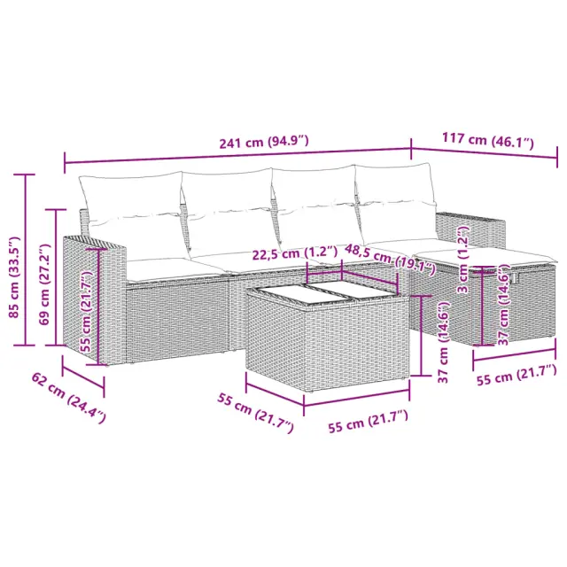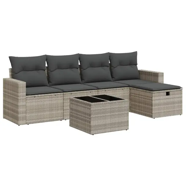 Ta vrtna sedežna garnitura je popoln dodatek za vaše dvorišče, teraso ali verando, saj zagotavlja udoben in vabljiv prostor za klepet z družino in prijatelji ali preprosto za sprostitev in uživanje na prostem. Trpežen material: PE ratan, znan tudi kot poli ratan, je močan sintetični material, ki ne potrebuje vzdrževanja in je videti kot naravni ratan. Je lahek, enostaven za čiščenje in se zaradi svoje vzdržljivosti in odpornosti na vremenske vplive pogosto uporablja za zunanje pohištvo.Funkcija shranjevanja z vodoodporno torbo: Vrtno pohištvo ima pod sedežem prostor za shranjevanje, opremljen z vodoodporno torbo za shranjevanje blazin, igrač in drugih stvari. Notranjo torbo je mogoče varno pritrditi na zunanje pohištvo s kavljem in zanko za večjo stabilnost.Vsestranski stolček za noge: Stolček je vsestransko uporaben, saj služi kot udoben naslon za noge, ko ležite na kavču, ali kot dodaten sedež na vrtu.Prevleko je mogoče odstraniti in oprati: Te sedežne blazine imajo odstranljive prevleke za lažje pranje in vzdrževanje.Modularna zasnova: Ta komplet zunanjega pohištva ima modularno zasnovo, zaradi česar je popolnoma prilagodljiv in enostaven za premikanje, tako da lahko zunanjo garnituro postavite kakor koli želite. Dobro je vedeti:Če želite, da vaše zunanje pohištvo ostane lepo, vam priporočamo, da ga zaščitite z vodoodporno prevleko.Dimenzije vodoodporne vreče: 55 x 53 x 34 cm (D x Š x V)Največja dovoljena teža (na sedež): 110 kgUV-odpornoPlastične nastavljive nogePotrebno sestavljanje: DaKavč z naslonjali za roke:Barva: Svetlo sivaMaterial: PE ratan, jeklen okvir s prašnim premazomDimenzije: 65,5 x 62 x 69 cm (Š x G x V)Velikost sedeža: 55 x 55 cm (Š x G)Višina sedeža od tal (brez blazine): 37 cmVišina naslonjal za roke od tal: 55 cmŠirina naslonjala za roke: 10 cmSrednji sedež:Barva: Svetlo sivaMaterial: PE ratan, jeklen okvir s prašnim premazomDimenzije: 55 x 62 x 69 cm (Š x G x V)Velikost sedeža: 55 x 55 cm (Š x G)Višina sedeža od tal (brez blazine): 37 cmStolček za noge:Barva: Svetlo sivaMaterial: PE ratan, jeklen okvir s prašnim premazomDimenzije: 55 x 55 x 37 cm (Š x G x V)Vrtna miza:Barva: Svetlo sivaMaterial: PE ratan, jeklo s prašnim premazom, kaljeno stekloDimenzije: 55 x 55 x 37 cm (Š x G x V)Blazina:Barva: Temno sivaMaterial prevleke: Tkanina (100 % poliester)Polnilo sedežne blazine: PenaPolnilo hrbtne blazine: bombažna vlaknaDimenzije sedežne blazine: 55 x 55 x 3 cm (Š x G x D)Dimenzije hrbtne blazine: 55 x 45 x 13 cm (D x Š x D)Paket vsebuje:2 x Kavč s funkcijo shranjevanja z vodoodporno vrečo2 x Srednji kavč s funkcijo shranjevanja z vodoodporno vrečo1 x Stolček s funkcijo shranjevanja1 x Vrtna miza4 x Blazina za hrbet5 x Sedežna blazina s snemljivo pralno prevleko 3325378