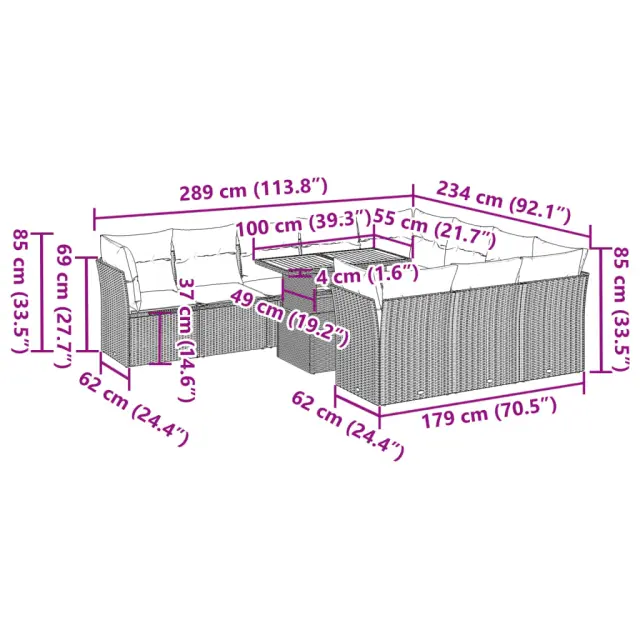 Ta vrtna sedežna garnitura je popoln dodatek za vaše dvorišče, teraso ali verando, saj zagotavlja udoben in vabljiv prostor za klepet z družino in prijatelji ali preprosto za sprostitev in uživanje na prostem. Trpežen material: PE ratan, znan tudi kot poli ratan, je močan sintetični material, ki ne potrebuje vzdrževanja in je videti kot naravni ratan. Je lahek, enostaven za čiščenje in se zaradi svoje vzdržljivosti in odpornosti na vremenske vplive pogosto uporablja za zunanje pohištvo.Funkcija shranjevanja z vodoodporno torbo: Vrtno pohištvo ima pod sedežem prostor za shranjevanje, opremljen z vodoodporno torbo za shranjevanje blazin, igrač in drugih stvari. Notranjo torbo je mogoče varno pritrditi na zunanje pohištvo s kavljem in zanko za večjo stabilnost.Nastavljiva mizna plošča: Z dvigom mizne plošče lahko mizo povišate, s čimer se zunanja klubska mizica spremeni v jedilno mizo. Popolna je za sprejemanje gostov ali uživanje v obrokih na prostem.Prevleko je mogoče odstraniti in oprati: Te sedežne blazine imajo odstranljive prevleke za lažje pranje in vzdrževanje.Modularna zasnova: Ta komplet zunanjega pohištva ima modularno zasnovo, zaradi česar je popolnoma prilagodljiv in enostaven za premikanje, tako da lahko zunanjo garnituro postavite kakor koli želite. Dobro je vedeti:Če želite, da vaše zunanje pohištvo ostane lepo, vam priporočamo, da ga zaščitite z vodoodporno prevleko.Dimenzije vodoodporne vreče: 55 x 53 x 34 cm (D x Š x V)Maksimalna nosilnost (na sedež): 110 kgUV-odpornoPlastične nastavljive nogePotrebno sestavljanje: DaKotni sedež:Barva: BežMaterial: PE ratan, jeklen okvir s prašnim premazomDimenzije: 62 x 62 x 69 cm (Š x G x V)Velikost sedeža: 55 x 55 cm (Š x G)Višina sedeža od tal (brez blazine): 37 cmSrednji sedež:Barva: BežMaterial: PE ratan, jeklen okvir s prašnim premazomDimenzije: 55 x 62 x 69 cm (Š x G x V)Velikost sedeža: 55 x 55 cm (Š x G)Višina sedeža od tal (brez blazine): 37 cmMiza:Barva: BežMaterial: PE ratan, prašno premazano jeklo, trden akacijev les z oljnim premazomDimenzije: 100 x 55 x 44/73 cm (D x Š x V)Blazina:Barva: Svetlo sivaMaterial prevleke: Tkanina (100 % poliester)Polnilo sedežne blazine: PenaPolnilo hrbtne blazine: bombažna vlaknaDimenzije sedežne blazine: 55 x 55 x 3 cm (Š x G x D)Dimenzije hrbtne blazine: 55 x 45 x 13 cm (D x Š x D)Paket vsebuje:1 x Vrtna miza4 x Kotni sedež s funkcijo shranjevanja z vodoodporno vrečo6 x Srednji kavč s funkcijo shranjevanja z vodoodporno vrečo14 x Blazina za hrbet10 x Sedežna blazina s snemljivo in pralno prevleko 3326978