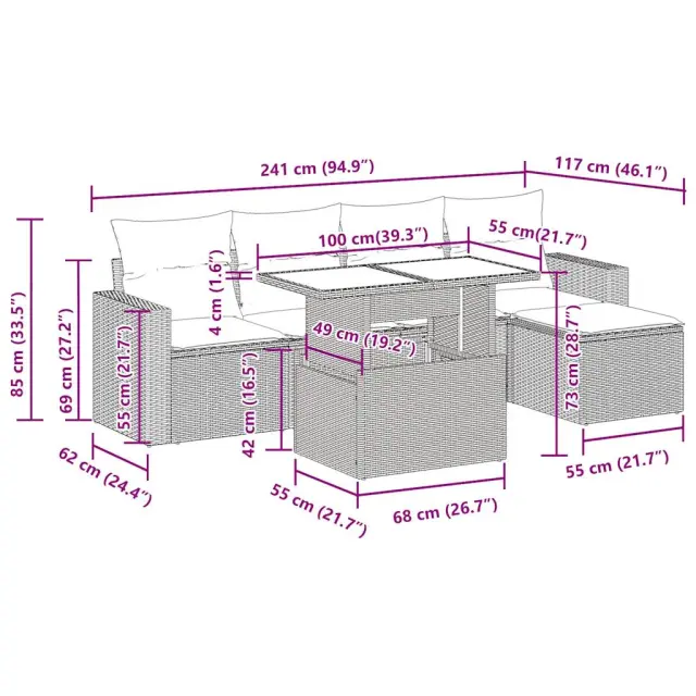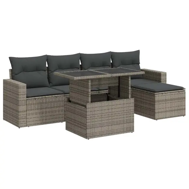 Ta vrtna sedežna garnitura je popoln dodatek za vaše dvorišče, teraso ali verando, saj zagotavlja udoben in vabljiv prostor za klepet z družino in prijatelji ali preprosto za sprostitev in uživanje na prostem. Trpežen material: PE ratan, znan tudi kot poli ratan, je močan sintetični material, ki ne potrebuje vzdrževanja in je videti kot naravni ratan. Je lahek, enostaven za čiščenje in se zaradi svoje vzdržljivosti in odpornosti na vremenske vplive pogosto uporablja za zunanje pohištvo.Funkcija shranjevanja z vodoodporno vrečo: Vsak vrtni sedež ima pod sedežem prostor za shranjevanje, opremljen z vodoodporno vrečo za shranjevanje blazin, igrač in drugih predmetov. Notranja torba ima zgornji pokrov in jo je mogoče varno pritrditi na sedež s kavljem in zanko za večjo stabilnost.Nastavljiva mizna plošča: Z dvigom mizne plošče lahko mizo povišate, s čimer se zunanja klubska mizica spremeni v jedilno mizo. Popolna je za sprejemanje gostov ali uživanje v obrokih na prostem.Vsestranski stolček za noge: Stolček je vsestransko uporaben, saj služi kot udoben naslon za noge, ko ležite na kavču, ali kot dodaten sedež na vrtu.Prevleko je mogoče odstraniti in oprati: Te sedežne blazine imajo odstranljive prevleke za lažje pranje in vzdrževanje.Robusten in stabilen okvir: Jeklen okvir s prašnim premazom je močan, stabilen, trpežen ter odporen na korozijo in slabe vremenske razmere, kar zagotavlja dolgotrajno delovanje. Dobro je vedeti:Če želite, da vaše zunanje pohištvo ostane lepo, vam priporočamo, da ga zaščitite z vodoodporno prevleko.Dimenzije vodoodporne vreče: 55 x 53 x 34 cm (D x Š x V)Največja dovoljena teža (na sedež): 110 kgUV-odpornoPlastične nastavljive nogePotrebno sestavljanje: DaSrednji sedež:Barva: SivaMaterial: PE ratan, jeklen okvir s prašnim premazomDimenzije: 55 x 62 x 69 cm (Š x G x V)Velikost sedeža: 55 x 55 cm (Š x G)Višina sedeža od tal (brez blazine): 37 cmKavč z naslonjali za roke:Barva: SivaMaterial: PE ratan, jeklen okvir s prašnim premazomDimenzije: 65,5 x 62 x 69 cm (Š x G x V)Velikost sedeža: 55 x 55 cm (Š x G)Višina sedeža od tal (brez blazine): 37 cmVišina naslonjal za roke od tal: 55 cmStolček za noge:Barva: SivaMaterial: PE ratan, jeklen okvir s prašnim premazomDimenzije: 55 x 55 x 37 cm (Š x G x V)Miza:Barva: SivaMaterial: PE ratan, jeklo s prašnim premazom, kaljeno stekloDimenzije: 100 x 55 x 44/73 cm (D x Š x V)Blazina:Barva: Temno sivaMaterial prevleke: Tkanina (100 % poliester)Polnilo sedežne blazine: PenaPolnilo hrbtne blazine: bombažna vlaknaDimenzije sedežne blazine: 55 x 55 x 3 cm (Š x G x D)Dimenzije hrbtne blazine: 55 x 45 x 13 cm (D x Š x D)Paket vsebuje:2 x Srednji kavč s funkcijo shranjevanja z vodoodporno vrečo2 x Kavč s funkcijo shranjevanja z vodoodporno vrečo1 x Stolček za noge s funkcijo shranjevanja z vodoodporno vrečo1 x Miza4 x Blazina za hrbet5 x Sedežna blazina s snemljivo pralno prevleko 3326301