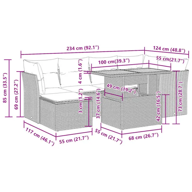 Ta vrtna sedežna garnitura je popoln dodatek za vaše dvorišče, teraso ali verando, saj zagotavlja udoben in vabljiv prostor za klepet z družino in prijatelji ali preprosto za sprostitev in uživanje na prostem. Trpežen material: PE ratan, znan tudi kot poli ratan, je močan sintetični material, ki ne potrebuje vzdrževanja in je videti kot naravni ratan. Je lahek, enostaven za čiščenje in se zaradi svoje vzdržljivosti in odpornosti na vremenske vplive pogosto uporablja za zunanje pohištvo.Funkcija shranjevanja z vodoodporno torbo: Vrtno pohištvo ima pod sedežem prostor za shranjevanje, opremljen z vodoodporno torbo za shranjevanje blazin, igrač in drugih stvari. Notranjo torbo je mogoče varno pritrditi na zunanje pohištvo s kavljem in zanko za večjo stabilnost.Nastavljiva mizna plošča: Z dvigom mizne plošče lahko mizo povišate, s čimer se zunanja klubska mizica spremeni v jedilno mizo. Popolna je za sprejemanje gostov ali uživanje v obrokih na prostem.Prevleko je mogoče odstraniti in oprati: Te sedežne blazine imajo odstranljive prevleke za lažje pranje in vzdrževanje.Modularna zasnova: Ta komplet zunanjega pohištva ima modularno zasnovo, zaradi česar je popolnoma prilagodljiv in enostaven za premikanje, tako da lahko zunanjo garnituro postavite kakor koli želite. Dobro je vedeti:Če želite, da vaše zunanje pohištvo ostane lepo, vam priporočamo, da ga zaščitite z vodoodporno prevleko.Dimenzije vodoodporne vreče: 55 x 53 x 34 cm (D x Š x V)Maksimalna nosilnost (na sedež): 110 kgUV-odpornoPlastične nastavljive nogePotrebno sestavljanje: DaKotni sedež:Barva: BežMaterial: PE ratan, jeklen okvir s prašnim premazomDimenzije: 62 x 62 x 69 cm (Š x G x V)Velikost sedeža: 55 x 55 cm (Š x G)Višina sedeža od tal (brez blazine): 37 cmSrednji sedež:Barva: BežMaterial: PE ratan, jeklen okvir s prašnim premazomDimenzije: 55 x 62 x 69 cm (Š x G x V)Velikost sedeža: 55 x 55 cm (Š x G)Višina sedeža od tal (brez blazine): 37 cmStolček za noge:Barva: BežMaterial: PE ratan, jeklen okvir s prašnim premazomDimenzije: 55 x 55 x 37 cm (Š x G x V)Miza:Barva: BežMaterial: PE ratan, prašno premazano jeklo, trden akacijev les z oljnim premazomDimenzije: 100 x 55 x 44/73 cm (D x Š x V)Blazina:Barva: Kremno belaMaterial prevleke: Tkanina (100 % poliester)Polnilo sedežne blazine: PenaPolnilo hrbtne blazine: bombažna vlaknaDimenzije sedežne blazine: 55 x 55 x 3 cm (Š x G x D)Dimenzije hrbtne blazine: 55 x 45 x 13 cm (D x Š x D)Paket vsebuje:1 x Vrtna miza3 x Kotni kavč s funkcijo shranjevanja z vodoodporno vrečo2 x Srednji kavč s funkcijo shranjevanja z vodoodporno vrečo1 x Stolček za noge s funkcijo shranjevanja z vodoodporno vrečo8 x Blazina za hrbet6 x Sedežna blazina s snemljivo pralno prevleko 3326949