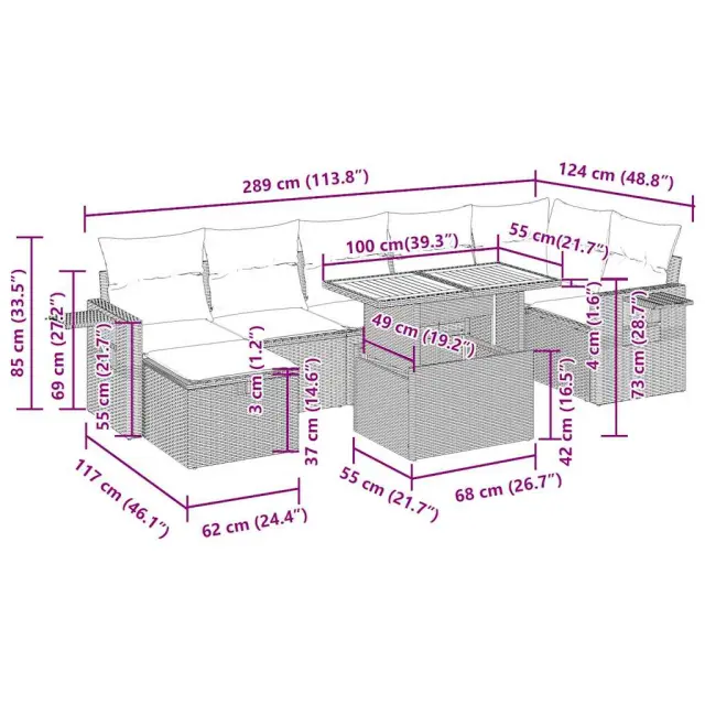 Ta vrtna sedežna garnitura je popoln dodatek za vaše dvorišče, teraso ali verando, saj zagotavlja udoben in vabljiv prostor za klepet z družino in prijatelji ali preprosto za sprostitev in uživanje na prostem.Trpežen material: PE ratan, znan tudi kot poli ratan, je močan sintetični material, ki ne potrebuje vzdrževanja in je videti kot naravni ratan. Je lahek, enostaven za čiščenje in se zaradi svoje vzdržljivosti in odpornosti na vremenske vplive pogosto uporablja za zunanje pohištvo.Funkcija shranjevanja z vodoodporno vrečo: Vsak vrtni sedež ima prostor za shranjevanje pod sedežem, skupaj z vodoodporno vrečo za shranjevanje blazin, igrač in drugih predmetov. Notranje vreče imajo zgornjo prevleko in jih je mogoče s pomočjo primenjal varno pritrditi na sedeže za dodatno varnost.Priročna stranska mizica: To zunanje pohištvo ima zložljivo stransko mizico s plinsko vzmetjo, ki zagotavlja priročen prostor za shranjevanje vaših potrebščin na dosegu roke.Prevleko je mogoče odstraniti in oprati: Te sedežne blazine imajo odstranljive prevleke za lažje pranje in vzdrževanje.Modularna zasnova: Ta komplet zunanjega pohištva ima modularno zasnovo, zaradi česar je popolnoma prilagodljiv in enostaven za premikanje, tako da lahko zunanjo garnituro postavite kakor koli želite.Dobro je vedeti:Če želite, da vaše zunanje pohištvo ostane lepo, vam priporočamo, da ga zaščitite z vodoodporno prevleko.Dimenzije vodoodporne vreče: 55 x 53 x 34 cm (D x Š x V)Največja dovoljena teža (na sedež): 110 kgUV-odpornoPlastične nastavljive nogePotrebno sestavljanje: DaKotni sedež:Barva: BežMaterial: PE ratan, jeklen okvir s prašnim premazomDimenzije: 62 x 62 x 69 cm (Š x G x V)Velikost sedeža: 55 x 55 cm (Š x G)Višina sedeža od tal (brez blazine): 37 cmKavč z naslonjali za roke:Barva: BežMaterial: PE ratan, jeklen okvir s prašnim premazomDimenzije: 62 x 62 x 69 cm (Š x G x V)Velikost sedeža: 55 x 55 cm (Š x G)Višina sedeža od tal (brez blazine): 37 cmVišina naslonjal za roke od tal: 55 cmŠirina naslonjala za roke: 6 cmVelikost stranske mizice: 25 x 23 cm (D x Š)Stolček za noge:Barva: BežMaterial: PE ratan, jeklen okvir s prašnim premazomDimenzije: 55 x 55 x 37 cm (Š x G x V)Miza:Barva: BežMaterial: PE ratan, prašno premazano jeklo, trden akacijev les z oljnim premazomDimenzije: 100 x 55 x 44/73 cm (D x Š x V)Blazina:Barva: Kremno belaMaterial prevleke: Tkanina (100 % poliester)Polnilo sedežne blazine: PenaPolnilo hrbtne blazine: bombažna vlaknaDimenzije sedežne blazine: 55 x 55 x 3 cm (Š x G x D)Dimenzije hrbtne blazine: 55 x 45 x 13 cm (D x Š x D)Paket vsebuje:1 x Kotni kavč s funkcijo shranjevanja z vodoodporno vrečo2 x Kavč s funkcijo shranjevanja z vodoodporno vrečo1 x Stolček za noge s funkcijo shranjevanja z vodoodporno vrečo1 x Miza4 x Blazina za hrbet4 x Sedežna blazina s snemljivo in pralno prevleko 3328038