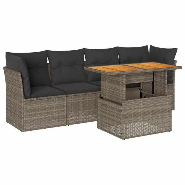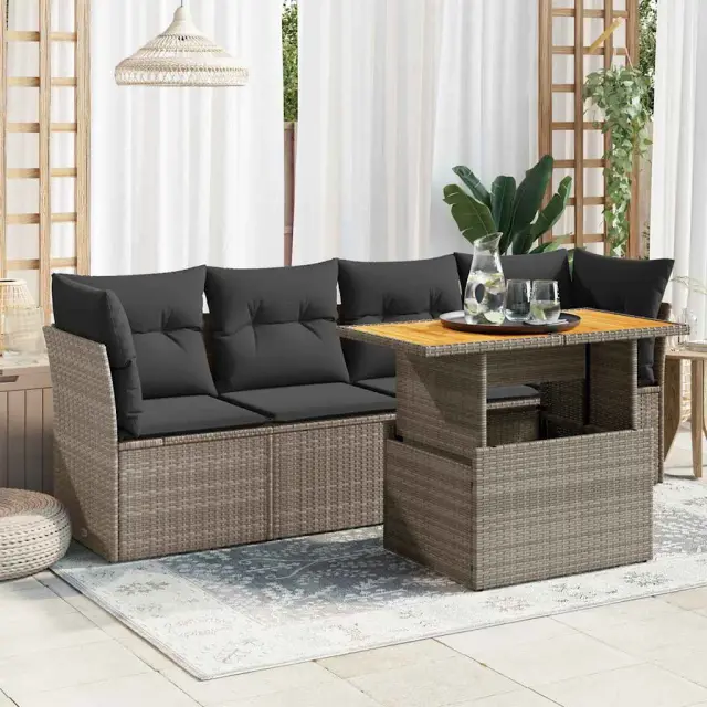 Ta vrtna sedežna garnitura je popoln dodatek za vaše dvorišče, teraso ali verando, saj zagotavlja udoben in vabljiv prostor za klepet z družino in prijatelji ali preprosto za sprostitev in uživanje na prostem. Trpežen material: PE ratan, znan tudi kot poli ratan, je močan sintetični material, ki ne potrebuje vzdrževanja in je videti kot naravni ratan. Je lahek, enostaven za čiščenje in se zaradi svoje vzdržljivosti in odpornosti na vremenske vplive pogosto uporablja za zunanje pohištvo.Funkcija shranjevanja z vodoodporno torbo: Vrtno pohištvo ima pod sedežem prostor za shranjevanje, opremljen z vodoodporno torbo za shranjevanje blazin, igrač in drugih stvari. Notranjo torbo je mogoče varno pritrditi na zunanje pohištvo s kavljem in zanko za večjo stabilnost.Nastavljiva mizna plošča: Z dvigom mizne plošče lahko mizo povišate, s čimer se zunanja klubska mizica spremeni v jedilno mizo. Popolna je za sprejemanje gostov ali uživanje v obrokih na prostem.Prevleko je mogoče odstraniti in oprati: Te sedežne blazine imajo odstranljive prevleke za lažje pranje in vzdrževanje.Modularna zasnova: Ta komplet zunanjega pohištva ima modularno zasnovo, zaradi česar je popolnoma prilagodljiv in enostaven za premikanje, tako da lahko zunanjo garnituro postavite kakor koli želite. Dobro je vedeti:Če želite, da vaše zunanje pohištvo ostane lepo, vam priporočamo, da ga zaščitite z vodoodporno prevleko.Dimenzije vodoodporne vreče: 55 x 53 x 34 cm (D x Š x V)Maksimalna nosilnost (na sedež): 110 kgUV-odpornoPlastične nastavljive nogePotrebno sestavljanje: DaKotni sedež:Barva: SivaMaterial: PE ratan, jeklen okvir s prašnim premazomDimenzije: 62 x 62 x 69 cm (Š x G x V)Velikost sedeža: 55 x 55 cm (Š x G)Višina sedeža od tal (brez blazine): 37 cmSrednji sedež:Barva: SivaMaterial: PE ratan, jeklen okvir s prašnim premazomDimenzije: 55 x 62 x 69 cm (Š x G x V)Velikost sedeža: 55 x 55 cm (Š x G)Višina sedeža od tal (brez blazine): 37 cmMiza:Barva: SivaMaterial: PE ratan, prašno premazano jeklo, trden akacijev les z oljnim premazomDimenzije: 100 x 55 x 44/73 cm (D x Š x V)Blazina:Barva: Temno sivaMaterial prevleke: Tkanina (100 % poliester)Polnilo sedežne blazine: PenaPolnilo hrbtne blazine: bombažna vlaknaDimenzije sedežne blazine: 55 x 55 x 3 cm (Š x G x D)Dimenzije hrbtne blazine: 55 x 45 x 13 cm (D x Š x D)Paket vsebuje:1 x Vrtna miza2 x Kotni kavč s funkcijo shranjevanja z vodoodporno vrečo2 x Srednji kavč s funkcijo shranjevanja z vodoodporno vrečo6 x Blazina za hrbet4 x Sedežna blazina s snemljivo in pralno prevleko 3326881