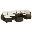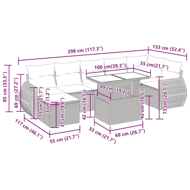 Ta vrtna sedežna garnitura je popoln dodatek za vaše dvorišče, teraso ali verando, saj zagotavlja udoben in vabljiv prostor za klepet z družino in prijatelji ali preprosto za sprostitev in uživanje na prostem.Trpežen material: PE ratan, znan tudi kot poli ratan, je močan sintetični material, ki ne potrebuje vzdrževanja in je videti kot naravni ratan. Je lahek, enostaven za čiščenje in se zaradi svoje vzdržljivosti in odpornosti na vremenske vplive pogosto uporablja za zunanje pohištvo.Funkcija shranjevanja z vodoodporno vrečo: Vsak vrtni sedež ima prostor za shranjevanje pod sedežem, skupaj z vodoodporno vrečo za shranjevanje blazin, igrač in drugih predmetov. Notranje vreče imajo zgornjo prevleko in jih je mogoče s pomočjo primenjal varno pritrditi na sedeže za dodatno varnost.Prevleko je mogoče odstraniti in oprati: Te sedežne blazine imajo odstranljive prevleke za lažje pranje in vzdrževanje.Modularna zasnova: Ta komplet zunanjega pohištva ima modularno zasnovo, zaradi česar je popolnoma prilagodljiv in enostaven za premikanje, tako da lahko zunanjo garnituro postavite kakor koli želite.Dobro je vedeti:Če želite, da vaše zunanje pohištvo ostane lepo, vam priporočamo, da ga zaščitite z vodoodporno prevleko.Največja dovoljena teža (na sedež): 110 kgUV-odpornoPlastične nastavljive nogePotrebno sestavljanje: DaKotni sedež:Barva: RjavaMaterial: PE ratan, jeklen okvir s prašnim premazomDimenzije: 62 x 62 x 69 cm (Š x G x V)Velikost sedeža: 55 x 55 cm (Š x G)Višina sedeža od tal (brez blazine): 37 cmSrednji sedež:Barva: RjavaMaterial: PE ratan, jeklen okvir s prašnim premazomDimenzije: 55 x 62 x 69 cm (Š x G x V)Velikost sedeža: 55 x 55 cm (Š x G)Višina sedeža od tal (brez blazine): 37 cmStolček:Barva: RjavaMaterial: PE ratan, jeklen okvir s prašnim premazomDimenzije: 55 x 55 x 37 cm (Š x G x V)Kotni sedež s naslonom za roke iz ratanaBarva: RjavaMaterial: PE ratan, jeklen okvir s prašnim premazomDimenzije: 71 x 62 x 69 cm (Š x G x V)Velikost sedeža: 55 x 55 cm (Š x G)Višina sedeža od tal (brez blazine): 37 cmVišina naslonjal za roke od tal: 55 cmMiza:Barva: ČrnaMaterial: PE ratan, jeklo s prašnim premazom, kaljeno stekloDimenzije: 100 x 55 x 44/73 cm (D x Š x V)Blazina:Barva: Kremno belaMaterial prevleke: Tkanina (100 % poliester)Polnilo sedežne blazine: PenaPolnilo hrbtne blazine: bombažna vlaknaDimenzije sedežne blazine: 55 x 55 x 3 cm (Š x G x D)Dimenzije hrbtne blazine: 55 x 45 x 13 cm (D x Š x D)Paket vsebuje:1 x Vrtna miza1 x Kotni kavč s funkcijo shranjevanja z vodoodporno vrečo2 x Kotni sedež z naslonom za roke iz ratana s funkcijo shranjevanja z vodoodporno torbo3 x Srednji kavč s funkcijo shranjevanja z vodoodporno vrečo1 x Stolček s funkcijo shranjevanja z vodoodporno vrečo7 x Sedežna blazina s snemljivo in pralno prevleko7 x Hrbtna blazina 3327913