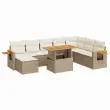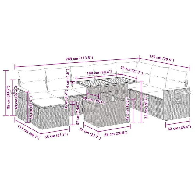 Ta vrtna sedežna garnitura je popoln dodatek za vaše dvorišče, teraso ali verando, saj zagotavlja udoben in vabljiv prostor za klepet z družino in prijatelji ali preprosto za sprostitev in uživanje na prostem.Trpežen material: PE ratan, znan tudi kot poli ratan, je močan sintetični material, ki ne potrebuje vzdrževanja in je videti kot naravni ratan. Je lahek, enostaven za čiščenje in se zaradi svoje vzdržljivosti in odpornosti na vremenske vplive pogosto uporablja za zunanje pohištvo.Funkcija shranjevanja z vodoodporno vrečo: Vsak vrtni sedež ima prostor za shranjevanje pod sedežem, skupaj z vodoodporno vrečo za shranjevanje blazin, igrač in drugih predmetov. Notranje vreče imajo zgornjo prevleko in jih je mogoče s pomočjo primenjal varno pritrditi na sedeže za dodatno varnost.Priročna stranska mizica: To zunanje pohištvo ima zložljivo stransko mizico s plinsko vzmetjo, ki zagotavlja priročen prostor za shranjevanje vaših potrebščin na dosegu roke.Prevleko je mogoče odstraniti in oprati: Te sedežne blazine imajo odstranljive prevleke za lažje pranje in vzdrževanje.Modularna zasnova: Ta komplet zunanjega pohištva ima modularno zasnovo, zaradi česar je popolnoma prilagodljiv in enostaven za premikanje, tako da lahko zunanjo garnituro postavite kakor koli želite.Dobro je vedeti:Če želite, da vaše zunanje pohištvo ostane lepo, vam priporočamo, da ga zaščitite z vodoodporno prevleko.Največja dovoljena teža (na sedež): 110 kgUV-odpornoPlastične nastavljive nogePotrebno sestavljanje: DaKotni sedež:Barva: BežMaterial: PE ratan, jeklen okvir s prašnim premazomDimenzije: 62 x 62 x 69 cm (Š x G x V)Velikost sedeža: 55 x 55 cm (Š x G)Višina sedeža od tal (brez blazine): 37 cmSrednji sedež:Barva: BežMaterial: PE ratan, jeklen okvir s prašnim premazomDimenzije: 55 x 62 x 69 cm (Š x G x V)Velikost sedeža: 55 x 55 cm (Š x G)Višina sedeža od tal (brez blazine): 37 cmStolček:Barva: BežMaterial: PE ratan, jeklen okvir s prašnim premazomDimenzije: 55 x 55 x 37 cm (Š x G x V)Kotni sedež z naslonom za roke iz akacijevega lesaBarva: BežMaterial: PE ratan, prašno premazano jeklo, trden akacijev les z oljnim premazomDimenzije: 62 x 62 x 69 cm (Š x G x V)Velikost sedeža: 55 x 55 cm (Š x G)Višina sedeža od tal (brez blazine): 37 cmVišina naslonjal za roke od tal: 55 cmŠirina naslonjala za roke: 6 cmVelikost stranske mizice: 24,5 x 23,5 cm (D × Š)Miza:Barva: BežMaterial: PE ratan, prašno premazano jeklo, trden akacijev les z oljnim premazomDimenzije: 100 x 55 x 44/73 cm (D x Š x V)Srednji sedež:Barva: BežMaterial: PE ratan, jeklen okvir s prašnim premazomDimenzije: 55 x 62 x 69 cm (Š x G x V)Velikost sedeža: 55 x 55 cm (Š x G)Višina sedeža od tal (brez blazine): 37 cmBlazina:Barva: Kremno belaMaterial prevleke: Tkanina (100 % poliester)Polnilo sedežne blazine: PenaPolnilo hrbtne blazine: bombažna vlaknaDimenzije sedežne blazine: 55 x 55 x 3 cm (Š x G x D)Dimenzije hrbtne blazine: 55 x 45 x 13 cm (D x Š x D)Paket vsebuje:1 x Vrtna miza3 x Kotni kavč s funkcijo shranjevanja z vodoodporno vrečo4 x Srednji kavč s funkcijo shranjevanja z vodoodporno vrečo1 x Stolček s funkcijo shranjevanja z vodoodporno vrečo7 x Sedežna blazina s snemljivo in pralno prevleko8 x Blazina za hrbet 3327635