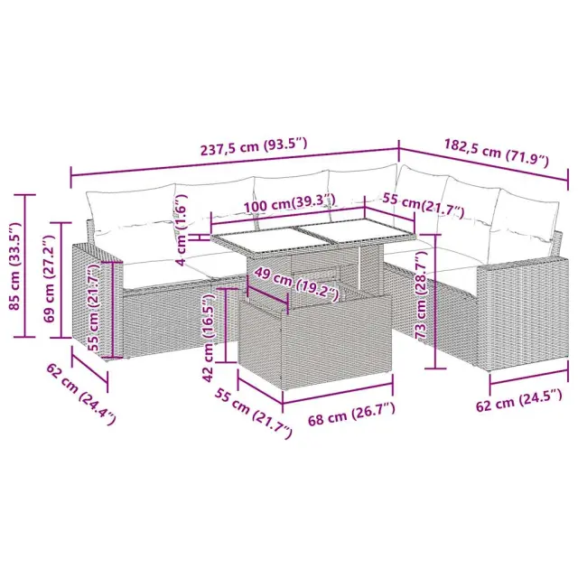 Ta vrtna sedežna garnitura je popoln dodatek za vaše dvorišče, teraso ali verando, saj zagotavlja udoben in vabljiv prostor za klepet z družino in prijatelji ali preprosto za sprostitev in uživanje na prostem. Trpežen material: PE ratan, znan tudi kot poli ratan, je močan sintetični material, ki ne potrebuje vzdrževanja in je videti kot naravni ratan. Je lahek, enostaven za čiščenje in se zaradi svoje vzdržljivosti in odpornosti na vremenske vplive pogosto uporablja za zunanje pohištvo.Funkcija shranjevanja z vodoodporno vrečo: Vsak vrtni sedež ima pod sedežem prostor za shranjevanje, opremljen z vodoodporno vrečo za shranjevanje blazin, igrač in drugih predmetov. Notranja torba ima zgornji pokrov in jo je mogoče varno pritrditi na sedež s kavljem in zanko za večjo stabilnost.Nastavljiva mizna plošča: Z dvigom mizne plošče lahko mizo povišate, s čimer se zunanja klubska mizica spremeni v jedilno mizo. Popolna je za sprejemanje gostov ali uživanje v obrokih na prostem.Prevleko je mogoče odstraniti in oprati: Te sedežne blazine imajo odstranljive prevleke za lažje pranje in vzdrževanje.Robusten in stabilen okvir: Jeklen okvir s prašnim premazom je močan, stabilen, trpežen ter odporen na korozijo in slabe vremenske razmere, kar zagotavlja dolgotrajno delovanje. Dobro je vedeti:Če želite, da vaše zunanje pohištvo ostane lepo, vam priporočamo, da ga zaščitite z vodoodporno prevleko.Dimenzije vodoodporne vreče: 55 x 53 x 34 cm (D x Š x V)Največja dovoljena teža (na sedež): 110 kgUV-odpornoPlastične nastavljive nogePotrebno sestavljanje: DaSrednji sedež:Barva: ČrnaMaterial: PE ratan, jeklen okvir s prašnim premazomDimenzije: 55 x 62 x 69 cm (Š x G x V)Velikost sedeža: 55 x 55 cm (Š x G)Višina sedeža od tal (brez blazine): 37 cmKotni sedež:Barva: ČrnaMaterial: PE ratan, jeklen okvir s prašnim premazomDimenzije: 62 x 62 x 69 cm (Š x G x V)Velikost sedeža: 55 x 55 cm (Š x G)Višina sedeža od tal (brez blazine): 37 cmKavč z naslonjali za roke:Barva: ČrnaMaterial: PE ratan, jeklen okvir s prašnim premazomDimenzije: 65,5 x 62 x 69 cm (Š x G x V)Velikost sedeža: 55 x 55 cm (Š x G)Višina sedeža od tal (brez blazine): 37 cmVišina naslonjal za roke od tal: 55 cmMiza:Barva: ČrnaMaterial: PE ratan, jeklo s prašnim premazom, kaljeno stekloDimenzije: 100 x 55 x 44/73 cm (D x Š x V)Blazina:Barva: Kremno belaMaterial prevleke: Tkanina (100 % poliester)Polnilo sedežne blazine: PenaPolnilo hrbtne blazine: bombažna vlaknaDimenzije sedežne blazine: 55 x 55 x 3 cm (Š x G x D)Dimenzije hrbtne blazine: 55 x 45 x 13 cm (D x Š x D)Paket vsebuje:3 x Srednji kavč s funkcijo shranjevanja z vodoodporno vrečo1 x Kotni kavč s funkcijo shranjevanja z vodoodporno vrečo2 x Kavč s funkcijo shranjevanja z vodoodporno vrečo1 x Miza7 x Hrbtna blazina6 x Sedežna blazina s snemljivo pralno prevleko 3326327