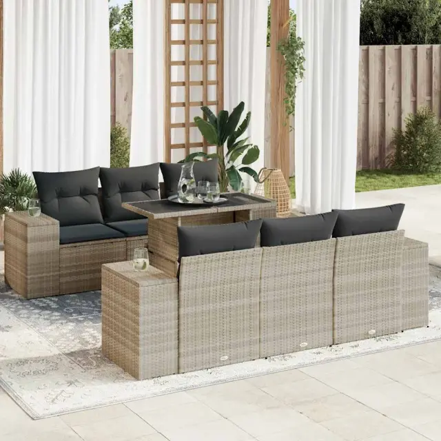 Ta vrtna sedežna garnitura je popoln dodatek za vaše dvorišče, teraso ali verando, saj zagotavlja udoben in vabljiv prostor za klepet z družino in prijatelji ali preprosto za sprostitev in uživanje na prostem. Trpežen material: PE ratan, znan tudi kot poli ratan, je močan sintetični material, ki ne potrebuje vzdrževanja in je videti kot naravni ratan. Je lahek, enostaven za čiščenje in se zaradi svoje vzdržljivosti in odpornosti na vremenske vplive pogosto uporablja za zunanje pohištvo.Funkcija shranjevanja z vodoodporno torbo: Vrtno pohištvo ima pod sedežem prostor za shranjevanje, opremljen z vodoodporno torbo za shranjevanje blazin, igrač in drugih stvari. Notranjo torbo je mogoče varno pritrditi na zunanje pohištvo s kavljem in zanko za večjo stabilnost.Nastavljiva mizna plošča: Z dvigom mizne plošče lahko mizo povišate, s čimer se zunanja klubska mizica spremeni v jedilno mizo. Popolna je za sprejemanje gostov ali uživanje v obrokih na prostem.Prevleko je mogoče odstraniti in oprati: Te sedežne blazine imajo odstranljive prevleke za lažje pranje in vzdrževanje.Modularna zasnova: Ta komplet zunanjega pohištva ima modularno zasnovo, zaradi česar je popolnoma prilagodljiv in enostaven za premikanje, tako da lahko zunanjo garnituro postavite kakor koli želite. Dobro je vedeti:Če želite, da vaše zunanje pohištvo ostane lepo, vam priporočamo, da ga zaščitite z vodoodporno prevleko.Dimenzije vodoodporne vreče: 55 x 53 x 34 cm (D x Š x V)Maksimalna nosilnost (na sedež): 110 kgUV-odpornoPlastične nastavljive nogePotrebno sestavljanje: DaKotni sedež:Barva: Svetlo sivaMaterial: PE ratan, jeklen okvir s prašnim premazomDimenzije: 83 x 62 x 69 cm (Š x G x V)Velikost sedeža: 55 x 55 cm (Š x G)Višina sedeža od tal (brez blazine): 37 cmVišina naslonjal za roke od tal: 55 cmŠirina naslona za roke: 27,5 cmSrednji sedež:Barva: Svetlo sivaMaterial: PE ratan, jeklen okvir s prašnim premazomDimenzije: 55 x 62 x 69 cm (Š x G x V)Velikost sedeža: 55 x 55 cm (Š x G)Višina sedeža od tal (brez blazine): 37 cmMiza:Barva: Svetlo sivaMaterial: PE ratan, jeklo s prašnim premazom, kaljeno stekloDimenzije: 100 x 55 x 44/73 cm (D x Š x V)Blazina:Barva: Temno sivaMaterial prevleke: Tkanina (100 % poliester)Polnilo sedežne blazine: PenaPolnilo hrbtne blazine: bombažna vlaknaDimenzije sedežne blazine: 55 x 55 x 3 cm (Š x G x D)Dimenzije hrbtne blazine: 55 x 45 x 13 cm (D x Š x D)Paket vsebuje:1 x Vrtna miza4 x Kotni sedež s funkcijo shranjevanja z vodoodporno vrečo2 x Srednji kavč s funkcijo shranjevanja z vodoodporno vrečo6 x Blazina za hrbet6 x Sedežna blazina s snemljivo pralno prevleko 3326743