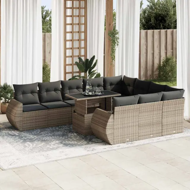 Ta vrtna sedežna garnitura je popoln dodatek za vaše dvorišče, teraso ali verando, saj zagotavlja udoben in vabljiv prostor za klepet z družino in prijatelji ali preprosto za sprostitev in uživanje na prostem. Trpežen material: PE ratan, znan tudi kot poli ratan, je močan sintetični material, ki ne potrebuje vzdrževanja in je videti kot naravni ratan. Je lahek, enostaven za čiščenje in se zaradi svoje vzdržljivosti in odpornosti na vremenske vplive pogosto uporablja za zunanje pohištvo.Funkcija shranjevanja z vodoodporno torbo: Vrtno pohištvo ima pod sedežem prostor za shranjevanje, opremljen z vodoodporno torbo za shranjevanje blazin, igrač in drugih stvari. Notranjo torbo je mogoče varno pritrditi na zunanje pohištvo s kavljem in zanko za večjo stabilnost.Nastavljiva mizna plošča: Z dvigom mizne plošče lahko mizo povišate, s čimer se zunanja klubska mizica spremeni v jedilno mizo. Popolna je za sprejemanje gostov ali uživanje v obrokih na prostem.Prevleko je mogoče odstraniti in oprati: Te sedežne blazine imajo odstranljive prevleke za lažje pranje in vzdrževanje.Modularna zasnova: Ta komplet zunanjega pohištva ima modularno zasnovo, zaradi česar je popolnoma prilagodljiv in enostaven za premikanje, tako da lahko zunanjo garnituro postavite kakor koli želite. Dobro je vedeti:Če želite, da vaše zunanje pohištvo ostane lepo, vam priporočamo, da ga zaščitite z vodoodporno prevleko.Dimenzije vodoodporne vreče: 55 x 53 x 34 cm (D x Š x V)Maksimalna nosilnost (na sedež): 110 kgUV-odpornoPlastične nastavljive nogePotrebno sestavljanje: DaKotni sedež:Barva: SivaMaterial: PE ratan, jeklen okvir s prašnim premazomDimenzije: 62 x 62 x 69 cm (Š x G x V)Velikost sedeža: 55 x 55 cm (Š x G)Višina sedeža od tal (brez blazine): 37 cmKotni sedež s naslonom za roke iz ratana:Barva: SivaMaterial: PE ratan, jeklen okvir s prašnim premazomDimenzije: 71 x 62 x 69 cm (Š x G x V)Velikost sedeža: 55 x 55 cm (Š x G)Višina sedeža od tal (brez blazine): 37 cmVišina naslonjal za roke od tal: 55 cmSrednji sedež:Barva: SivaMaterial: PE ratan, jeklen okvir s prašnim premazomDimenzije: 55 x 62 x 69 cm (Š x G x V)Velikost sedeža: 55 x 55 cm (Š x G)Višina sedeža od tal (brez blazine): 37 cmMiza:Barva: SivaMaterial: PE ratan, jeklo s prašnim premazom, kaljeno stekloDimenzije: 100 x 55 x 44/73 cm (D x Š x V)Blazina:Barva: Temno sivaMaterial prevleke: Tkanina (100 % poliester)Polnilo sedežne blazine: PenaPolnilo hrbtne blazine: bombažna vlaknaDimenzije sedežne blazine: 55 x 55 x 3 cm (Š x G x D)Dimenzije hrbtne blazine: 55 x 45 x 13 cm (D x Š x D)Paket vsebuje:1 x Vrtna miza2 x Kotni kavč s funkcijo shranjevanja z vodoodporno vrečo2 x Kotni sedež z naslonom za roke iz ratana s funkcijo shranjevanja z vodoodporno torbo6 x Srednji kavč s funkcijo shranjevanja z vodoodporno vrečo12 x Blazina za hrbet10 x Sedežna blazina s snemljivo in pralno prevleko 3326711