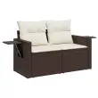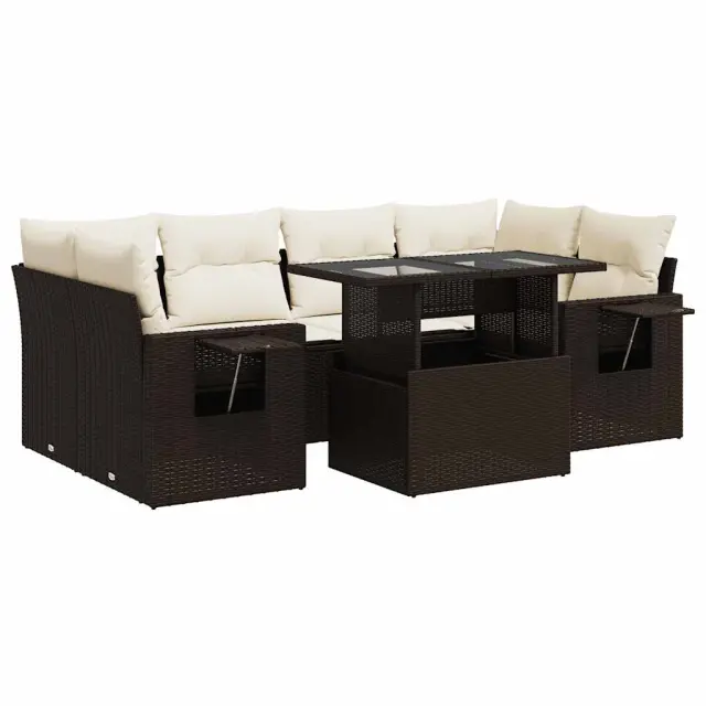 Ta vrtna sedežna garnitura je popoln dodatek za vaše dvorišče, teraso ali verando, saj zagotavlja udoben in vabljiv prostor za klepet z družino in prijatelji ali preprosto za sprostitev in uživanje na prostem. Trpežen material: PE ratan, znan tudi kot poli ratan, je močan sintetični material, ki ne potrebuje vzdrževanja in je videti kot naravni ratan. Je lahek, enostaven za čiščenje in se zaradi svoje vzdržljivosti in odpornosti na vremenske vplive pogosto uporablja za zunanje pohištvo.Funkcija shranjevanja z vodoodporno vrečo: Vsak vrtni sedež ima pod sedežem prostor za shranjevanje, opremljen z vodoodporno vrečo za shranjevanje blazin, igrač in drugih predmetov. Notranja torba ima zgornji pokrov in jo je mogoče varno pritrditi na sedež s kavljem in zanko za večjo stabilnost.Nastavljiva mizna plošča: Z dvigom mizne plošče lahko mizo povišate, s čimer se zunanja klubska mizica spremeni v jedilno mizo. Popolna je za sprejemanje gostov ali uživanje v obrokih na prostem.Prevleko je mogoče odstraniti in oprati: Te sedežne blazine imajo odstranljive prevleke za lažje pranje in vzdrževanje.Robusten in stabilen okvir: Jeklen okvir s prašnim premazom je močan, stabilen, trpežen ter odporen na korozijo in slabe vremenske razmere, kar zagotavlja dolgotrajno delovanje. Dobro je vedeti:Če želite, da vaše zunanje pohištvo ostane lepo, vam priporočamo, da ga zaščitite z vodoodporno prevleko.Dimenzije vodoodporne vreče: 55 x 53 x 34 cm (D x Š x V)Največja dovoljena teža (na sedež): 110 kgUV-odpornoPlastične nastavljive nogePotrebno sestavljanje: DaSrednji sedež:Barva: RjavaMaterial: PE ratan, jeklen okvir s prašnim premazomDimenzije: 55 x 62 x 69 cm (Š x G x V)Velikost sedeža: 55 x 55 cm (Š x G)Višina sedeža od tal (brez blazine): 37 cmKotni sedež:Barva: RjavaMaterial: PE ratan, jeklen okvir s prašnim premazomDimenzije: 62 x 62 x 69 cm (Š x G x V)Velikost sedeža: 55 x 55 cm (Š x G)Višina sedeža od tal (brez blazine): 37 cmKavč z naslonjali za roke:Barva: RjavaMaterial: PE ratan, jeklen okvir s prašnim premazomDimenzije: 62 x 62 x 69 cm (Š x G x V)Velikost sedeža: 55 x 55 cm (Š x G)Višina sedeža od tal (brez blazine): 37 cmVišina naslonjal za roke od tal: 55 cmMiza:Barva: RjavaMaterial: PE ratan, jeklo s prašnim premazom, kaljeno stekloDimenzije: 100 x 55 x 44/73 cm (D x Š x V)Blazina:Barva: Kremno belaMaterial prevleke: Tkanina (100 % poliester)Polnilo sedežne blazine: PenaPolnilo hrbtne blazine: bombažna vlaknaDimenzije sedežne blazine: 55 x 55 x 3 cm (Š x G x D)Dimenzije hrbtne blazine: 55 x 45 x 13 cm (D x Š x D)Paket vsebuje:2 x Srednji kavč s funkcijo shranjevanja z vodoodporno vrečo2 x Kotni kavč s funkcijo shranjevanja z vodoodporno vrečo2 x Kavč s funkcijo shranjevanja z vodoodporno vrečo1 x Miza8 x Blazina za hrbet6 x Sedežna blazina s snemljivo pralno prevleko 3326434