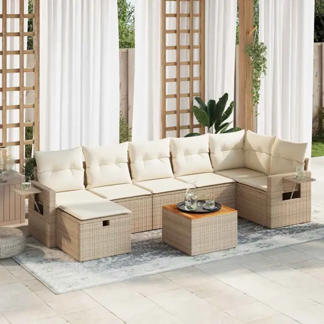 Ta vrtna sedežna garnitura je popoln dodatek za vaše dvorišče, teraso ali verando, saj zagotavlja udoben in vabljiv prostor za klepet z družino in prijatelji ali preprosto za sprostitev in uživanje na prostem. Trpežen material: PE ratan, znan tudi kot poli ratan, je močan sintetični material, ki ne potrebuje vzdrževanja in je videti kot naravni ratan. Je lahek, enostaven za čiščenje in se zaradi svoje vzdržljivosti in odpornosti na vremenske vplive pogosto uporablja za zunanje pohištvo.Funkcija shranjevanja z vodoodporno torbo: Vrtno pohištvo ima pod sedežem prostor za shranjevanje, opremljen z vodoodporno torbo za shranjevanje blazin, igrač in drugih stvari. Notranjo torbo je mogoče varno pritrditi na zunanje pohištvo s kavljem in zanko za večjo stabilnost.Vsestranski stolček za noge: Stolček je vsestransko uporaben, saj služi kot udoben naslon za noge, ko ležite na kavču, ali kot dodaten sedež na vrtu.Prevleko je mogoče odstraniti in oprati: Te sedežne blazine imajo odstranljive prevleke za lažje pranje in vzdrževanje.Modularna zasnova: Ta komplet zunanjega pohištva ima modularno zasnovo, zaradi česar je popolnoma prilagodljiv in enostaven za premikanje, tako da lahko zunanjo garnituro postavite kakor koli želite. Dobro je vedeti:Če želite, da vaše zunanje pohištvo ostane lepo, vam priporočamo, da ga zaščitite z vodoodporno prevleko.Dimenzije vodoodporne vreče: 55 x 53 x 34 cm (D x Š x V)Največja dovoljena teža (na sedež): 110 kgUV-odpornoPlastične nastavljive nogePotrebno sestavljanje: DaKavč z naslonjali za roke:Barva: BežMaterial: PE ratan, jeklen okvir s prašnim premazomDimenzije: 62 x 62 x 69 cm (Š x G x V)Velikost sedeža: 55 x 55 cm (Š x G)Višina sedeža od tal (brez blazine): 37 cmVišina naslonjal za roke od tal: 55 cmŠirina naslonjala za roke: 6 cmVelikost stranske mizice: 25 x 23 cm (D x Š)Kotni sedež:Barva: BežMaterial: PE ratan, jeklen okvir s prašnim premazomDimenzije: 62 x 62 x 69 cm (Š x G x V)Velikost sedeža: 55 x 55 cm (Š x G)Višina sedeža od tal (brez blazine): 37 cmSrednji sedež:Barva: BežMaterial: PE ratan, jeklen okvir s prašnim premazomDimenzije: 55 x 62 x 69 cm (Š x G x V)Velikost sedeža: 55 x 55 cm (Š x G)Višina sedeža od tal (brez blazine): 37 cmStolček za noge:Barva: BežMaterial: PE ratan, jeklen okvir s prašnim premazomDimenzije: 55 x 55 x 37 cm (Š x G x V)Vrtna miza:Barva: Bež in rjavaMaterial: PE ratan, prašno premazano jeklo, trden akacijev les z oljnim premazomDimenzije: 55 x 55 x 37 cm (Š x G x V)Blazina:Barva: Kremno belaMaterial prevleke: Tkanina (100 % poliester)Polnilo sedežne blazine: PenaPolnilo hrbtne blazine: bombažna vlaknaDimenzije sedežne blazine: 55 x 55 x 3 cm (Š x G x D)Dimenzije hrbtne blazine: 55 x 45 x 13 cm (D x Š x D)Paket vsebuje:2 x Kavč s funkcijo shranjevanja z vodoodporno vrečo1 x Kotni kavč s funkcijo shranjevanja z vodoodporno vrečo3 x Srednji kavč s funkcijo shranjevanja z vodoodporno vrečo1 x Stolček s funkcijo shranjevanja1 x Vrtna miza7 x Hrbtna blazina7 x Sedežna blazina s snemljivo in pralno prevleko 3325824
