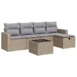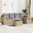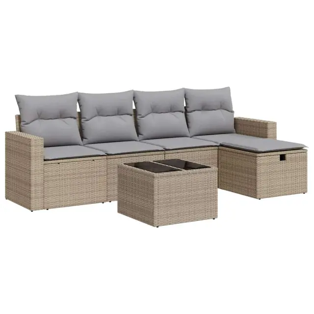 Ta vrtna sedežna garnitura je popoln dodatek za vaše dvorišče, teraso ali verando, saj zagotavlja udoben in vabljiv prostor za klepet z družino in prijatelji ali preprosto za sprostitev in uživanje na prostem. Trpežen material: PE ratan, znan tudi kot poli ratan, je močan sintetični material, ki ne potrebuje vzdrževanja in je videti kot naravni ratan. Je lahek, enostaven za čiščenje in se zaradi svoje vzdržljivosti in odpornosti na vremenske vplive pogosto uporablja za zunanje pohištvo.Funkcija shranjevanja z vodoodporno torbo: Vrtno pohištvo ima pod sedežem prostor za shranjevanje, opremljen z vodoodporno torbo za shranjevanje blazin, igrač in drugih stvari. Notranjo torbo je mogoče varno pritrditi na zunanje pohištvo s kavljem in zanko za večjo stabilnost.Vsestranski stolček za noge: Stolček je vsestransko uporaben, saj služi kot udoben naslon za noge, ko ležite na kavču, ali kot dodaten sedež na vrtu.Prevleko je mogoče odstraniti in oprati: Te sedežne blazine imajo odstranljive prevleke za lažje pranje in vzdrževanje.Modularna zasnova: Ta komplet zunanjega pohištva ima modularno zasnovo, zaradi česar je popolnoma prilagodljiv in enostaven za premikanje, tako da lahko zunanjo garnituro postavite kakor koli želite. Dobro je vedeti:Če želite, da vaše zunanje pohištvo ostane lepo, vam priporočamo, da ga zaščitite z vodoodporno prevleko.Dimenzije vodoodporne vreče: 55 x 53 x 34 cm (D x Š x V)Največja dovoljena teža (na sedež): 110 kgUV-odpornoPlastične nastavljive nogePotrebno sestavljanje: DaKavč z naslonjali za roke:Barva: BežMaterial: PE ratan, jeklen okvir s prašnim premazomDimenzije: 65,5 x 62 x 69 cm (Š x G x V)Velikost sedeža: 55 x 55 cm (Š x G)Višina sedeža od tal (brez blazine): 37 cmVišina naslonjal za roke od tal: 55 cmŠirina naslonjala za roke: 10 cmSrednji sedež:Barva: BežMaterial: PE ratan, jeklen okvir s prašnim premazomDimenzije: 55 x 62 x 69 cm (Š x G x V)Velikost sedeža: 55 x 55 cm (Š x G)Višina sedeža od tal (brez blazine): 37 cmStolček za noge:Barva: BežMaterial: PE ratan, jeklen okvir s prašnim premazomDimenzije: 55 x 55 x 37 cm (Š x G x V)Vrtna miza:Barva: BežMaterial: PE ratan, jeklo s prašnim premazom, kaljeno stekloDimenzije: 55 x 55 x 37 cm (Š x G x V)Blazina:Barva: Svetlo sivaMaterial prevleke: Tkanina (100 % poliester)Polnilo sedežne blazine: PenaPolnilo hrbtne blazine: bombažna vlaknaDimenzije sedežne blazine: 55 x 55 x 3 cm (Š x G x D)Dimenzije hrbtne blazine: 55 x 45 x 13 cm (D x Š x D)Paket vsebuje:2 x Kavč s funkcijo shranjevanja z vodoodporno vrečo2 x Srednji kavč s funkcijo shranjevanja z vodoodporno vrečo1 x Stolček s funkcijo shranjevanja1 x Vrtna miza4 x Blazina za hrbet5 x Sedežna blazina s snemljivo pralno prevleko 3325375