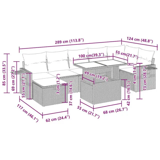 Ta vrtna sedežna garnitura je popoln dodatek za vaše dvorišče, teraso ali verando, saj zagotavlja udoben in vabljiv prostor za klepet z družino in prijatelji ali preprosto za sprostitev in uživanje na prostem.Trpežen material: PE ratan, znan tudi kot poli ratan, je močan sintetični material, ki ne potrebuje vzdrževanja in je videti kot naravni ratan. Je lahek, enostaven za čiščenje in se zaradi svoje vzdržljivosti in odpornosti na vremenske vplive pogosto uporablja za zunanje pohištvo.Funkcija shranjevanja z vodoodporno vrečo: Vsak vrtni sedež ima prostor za shranjevanje pod sedežem, skupaj z vodoodporno vrečo za shranjevanje blazin, igrač in drugih predmetov. Notranje vreče imajo zgornjo prevleko in jih je mogoče s pomočjo primenjal varno pritrditi na sedeže za dodatno varnost.Priročna stranska mizica: To zunanje pohištvo ima zložljivo stransko mizico s plinsko vzmetjo, ki zagotavlja priročen prostor za shranjevanje vaših potrebščin na dosegu roke.Prevleko je mogoče odstraniti in oprati: Te sedežne blazine imajo odstranljive prevleke za lažje pranje in vzdrževanje.Modularna zasnova: Ta komplet zunanjega pohištva ima modularno zasnovo, zaradi česar je popolnoma prilagodljiv in enostaven za premikanje, tako da lahko zunanjo garnituro postavite kakor koli želite.Dobro je vedeti:Če želite, da vaše zunanje pohištvo ostane lepo, vam priporočamo, da ga zaščitite z vodoodporno prevleko.Največja dovoljena teža (na sedež): 110 kgUV-odpornoPlastične nastavljive nogePotrebno sestavljanje: DaKotni sedež:Barva: ČrnaMaterial: PE ratan, jeklen okvir s prašnim premazomDimenzije: 62 x 62 x 69 cm (Š x G x V)Velikost sedeža: 55 x 55 cm (Š x G)Višina sedeža od tal (brez blazine): 37 cmSrednji sedež:Barva: ČrnaMaterial: PE ratan, jeklen okvir s prašnim premazomDimenzije: 55 x 62 x 69 cm (Š x G x V)Velikost sedeža: 55 x 55 cm (Š x G)Višina sedeža od tal (brez blazine): 37 cmStolček:Barva: ČrnaMaterial: PE ratan, jeklen okvir s prašnim premazomDimenzije: 55 x 55 x 37 cm (Š x G x V)Kotni sedež s naslonom za roke iz ratanaBarva: ČrnaMaterial: PE ratan, jeklen okvir s prašnim premazomDimenzije: 62 x 62 x 69 cm (Š x G x V)Velikost sedeža: 55 x 55 cm (Š x G)Višina sedeža od tal (brez blazine): 37 cmVišina naslonjal za roke od tal: 55 cmŠirina naslonjala za roke: 6 cmVelikost stranske mizice: 25 x 23 cm (D x Š)Miza:Barva: ČrnaMaterial: PE ratan, jeklo s prašnim premazom, kaljeno stekloDimenzije: 100 x 55 x 44/73 cm (D x Š x V)Blazina:Barva: Kremno belaMaterial prevleke: Tkanina (100 % poliester)Polnilo sedežne blazine: PenaPolnilo hrbtne blazine: bombažna vlaknaDimenzije sedežne blazine: 55 x 55 x 3 cm (Š x G x D)Dimenzije hrbtne blazine: 55 x 45 x 13 cm (D x Š x D)Paket vsebuje:1 x Vrtna miza1 x Kotni kavč s funkcijo shranjevanja z vodoodporno vrečo2 x Kotni sedež z naslonom za roke iz ratana s funkcijo shranjevanja z vodoodporno torbo3 x Srednji kavč s funkcijo shranjevanja z vodoodporno vrečo1 x Stolček s funkcijo shranjevanja z vodoodporno vrečo7 x Sedežna blazina s snemljivo in pralno prevleko7 x Hrbtna blazina 3327866
