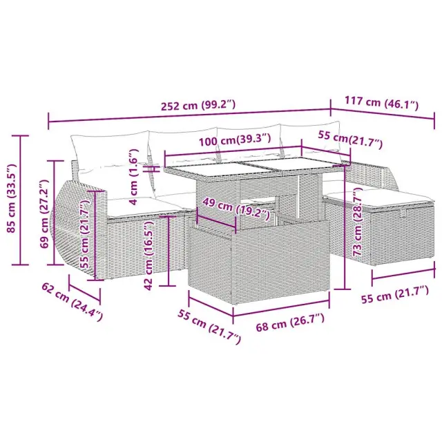 Ta vrtna sedežna garnitura je popoln dodatek za vaše dvorišče, teraso ali verando, saj zagotavlja udoben in vabljiv prostor za klepet z družino in prijatelji ali preprosto za sprostitev in uživanje na prostem.Trpežen material: PE ratan, znan tudi kot poli ratan, je močan sintetični material, ki ne potrebuje vzdrževanja in je videti kot naravni ratan. Je lahek, enostaven za čiščenje in se zaradi svoje vzdržljivosti in odpornosti na vremenske vplive pogosto uporablja za zunanje pohištvo.Funkcija shranjevanja z vodoodporno vrečo: Vsak vrtni sedež ima prostor za shranjevanje pod sedežem, skupaj z vodoodporno vrečo za shranjevanje blazin, igrač in drugih predmetov. Notranje vreče imajo zgornjo prevleko in jih je mogoče s pomočjo primenjal varno pritrditi na sedeže za dodatno varnost.Prevleko je mogoče odstraniti in oprati: Te sedežne blazine imajo odstranljive prevleke za lažje pranje in vzdrževanje.Modularna zasnova: Ta komplet zunanjega pohištva ima modularno zasnovo, zaradi česar je popolnoma prilagodljiv in enostaven za premikanje, tako da lahko zunanjo garnituro postavite kakor koli želite.Dobro je vedeti:Če želite, da vaše zunanje pohištvo ostane lepo, vam priporočamo, da ga zaščitite z vodoodporno prevleko.Največja dovoljena teža (na sedež): 110 kgUV-odpornoPlastične nastavljive nogePotrebno sestavljanje: DaSrednji sedež:Barva: Svetlo sivaMaterial: PE ratan, jeklen okvir s prašnim premazomDimenzije: 55 x 62 x 69 cm (Š x G x V)Velikost sedeža: 55 x 55 cm (Š x G)Višina sedeža od tal (brez blazine): 37 cmStolček:Barva: Svetlo sivaMaterial: PE ratan, jeklen okvir s prašnim premazomDimenzije: 55 x 55 x 37 cm (Š x G x V)Kotni sedež s naslonom za roke iz ratanaBarva: Svetlo sivaMaterial: PE ratan, jeklen okvir s prašnim premazomDimenzije: 71 x 62 x 69 cm (Š x G x V)Velikost sedeža: 55 x 55 cm (Š x G)Višina sedeža od tal (brez blazine): 37 cmVišina naslonjal za roke od tal: 55 cmMiza:Barva: ČrnaMaterial: PE ratan, jeklo s prašnim premazom, kaljeno stekloDimenzije: 100 x 55 x 44/73 cm (D x Š x V)Blazina:Barva: Temno sivaMaterial prevleke: Tkanina (100 % poliester)Polnilo sedežne blazine: PenaPolnilo hrbtne blazine: bombažna vlaknaDimenzije sedežne blazine: 55 x 55 x 3 cm (Š x G x D)Dimenzije hrbtne blazine: 55 x 45 x 13 cm (D x Š x D)Paket vsebuje:1 x Vrtna miza2 x Kotni kavč s funkcijo shranjevanja z vodoodporno vrečo2 x Srednji kavč s funkcijo shranjevanja z vodoodporno vrečo1 x Stolček s funkcijo shranjevanja z vodoodporno vrečo5 x Sedežna blazina s snemljivo pralno prevleko4 x Blazina za hrbet 3327892