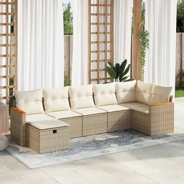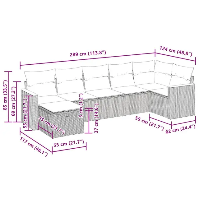Ta vrtna sedežna garnitura je popoln dodatek za vaše dvorišče, teraso ali verando, saj zagotavlja udoben in vabljiv prostor za klepet z družino in prijatelji ali preprosto za sprostitev in uživanje na prostem. Trpežen material: PE ratan, znan tudi kot poli ratan, je močan sintetični material, ki ne potrebuje vzdrževanja in je videti kot naravni ratan. Je lahek, enostaven za čiščenje in se zaradi svoje vzdržljivosti in odpornosti na vremenske vplive pogosto uporablja za zunanje pohištvo.Funkcija shranjevanja z vodoodporno torbo: Vrtno pohištvo ima pod sedežem prostor za shranjevanje, opremljen z vodoodporno torbo za shranjevanje blazin, igrač in drugih stvari. Notranjo torbo je mogoče varno pritrditi na zunanje pohištvo s kavljem in zanko za večjo stabilnost.Vsestranski stolček za noge: Stolček je vsestransko uporaben, saj služi kot udoben naslon za noge, ko ležite na kavču, ali kot dodaten sedež na vrtu.Prevleko je mogoče odstraniti in oprati: Te sedežne blazine imajo odstranljive prevleke za lažje pranje in vzdrževanje.Modularna zasnova: Ta komplet zunanjega pohištva ima modularno zasnovo, zaradi česar je popolnoma prilagodljiv in enostaven za premikanje, tako da lahko zunanjo garnituro postavite kakor koli želite. Dobro je vedeti:Če želite, da vaše zunanje pohištvo ostane lepo, vam priporočamo, da ga zaščitite z vodoodporno prevleko.Dimenzije vodoodporne vreče: 55 x 53 x 34 cm (D x Š x V)Največja dovoljena teža (na sedež): 110 kgUV-odpornoPlastične nastavljive nogePotrebno sestavljanje: DaKavč z naslonjali za roke:Barva: BežMaterial: PE ratan, prašno premazano jeklo, trden akacijev les z oljnim premazomDimenzije: 62 x 62 x 69 cm (Š x G x V)Velikost sedeža: 55 x 55 cm (Š x G)Višina sedeža od tal (brez blazine): 37 cmVišina naslonjal za roke od tal: 55 cmKotni sedež:Barva: BežMaterial: PE ratan, jeklen okvir s prašnim premazomDimenzije: 62 x 62 x 69 cm (Š x G x V)Velikost sedeža: 55 x 55 cm (Š x G)Višina sedeža od tal (brez blazine): 37 cmSrednji sedež:Barva: BežMaterial: PE ratan, jeklen okvir s prašnim premazomDimenzije: 55 x 62 x 69 cm (Š x G x V)Velikost sedeža: 55 x 55 cm (Š x G)Višina sedeža od tal (brez blazine): 37 cmStolček za noge:Barva: BežMaterial: PE ratan, jeklen okvir s prašnim premazomDimenzije: 55 x 55 x 37 cm (Š x G x V)Blazina:Barva: Kremno belaMaterial prevleke: Tkanina (100 % poliester)Polnilo sedežne blazine: PenaPolnilo hrbtne blazine: bombažna vlaknaDimenzije sedežne blazine: 55 x 55 x 3 cm (Š x G x D)Dimenzije hrbtne blazine: 55 x 45 x 13 cm (D x Š x D) Paket vsebuje:2 x Kavč s funkcijo shranjevanja z vodoodporno vrečo1 x Kotni kavč s funkcijo shranjevanja z vodoodporno vrečo3 x Srednji kavč s funkcijo shranjevanja z vodoodporno vrečo1 x Stolček s funkcijo shranjevanja7 x Hrbtna blazina7 x Sedežna blazina s snemljivo in pralno prevleko 3325929