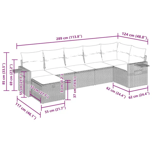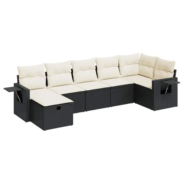 Ta vrtna sedežna garnitura je popoln dodatek za vaše dvorišče, teraso ali verando, saj zagotavlja udoben in vabljiv prostor za klepet z družino in prijatelji ali preprosto za sprostitev in uživanje na prostem. Trpežen material: PE ratan, znan tudi kot poli ratan, je močan sintetični material, ki ne potrebuje vzdrževanja in je videti kot naravni ratan. Je lahek, enostaven za čiščenje in se zaradi svoje vzdržljivosti in odpornosti na vremenske vplive pogosto uporablja za zunanje pohištvo.Funkcija shranjevanja z vodoodporno torbo: Vrtno pohištvo ima pod sedežem prostor za shranjevanje, opremljen z vodoodporno torbo za shranjevanje blazin, igrač in drugih stvari. Notranjo torbo je mogoče varno pritrditi na zunanje pohištvo s kavljem in zanko za večjo stabilnost.Vsestranski stolček za noge: Stolček je vsestransko uporaben, saj služi kot udoben naslon za noge, ko ležite na kavču, ali kot dodaten sedež na vrtu.Prevleko je mogoče odstraniti in oprati: Te sedežne blazine imajo odstranljive prevleke za lažje pranje in vzdrževanje.Modularna zasnova: Ta komplet zunanjega pohištva ima modularno zasnovo, zaradi česar je popolnoma prilagodljiv in enostaven za premikanje, tako da lahko zunanjo garnituro postavite kakor koli želite. Dobro je vedeti:Če želite, da vaše zunanje pohištvo ostane lepo, vam priporočamo, da ga zaščitite z vodoodporno prevleko.Dimenzije vodoodporne vreče: 55 x 53 x 34 cm (D x Š x V)Največja dovoljena teža (na sedež): 110 kgUV-odpornoPlastične nastavljive nogePotrebno sestavljanje: DaKavč z naslonjali za roke:Barva: ČrnaMaterial: PE ratan, jeklen okvir s prašnim premazomDimenzije: 62 x 62 x 69 cm (Š x G x V)Velikost sedeža: 55 x 55 cm (Š x G)Višina sedeža od tal (brez blazine): 37 cmVišina naslonjal za roke od tal: 55 cmŠirina naslonjala za roke: 6 cmVelikost stranske mizice: 25 x 23 cm (D x Š)Kotni sedež:Barva: ČrnaMaterial: PE ratan, jeklen okvir s prašnim premazomDimenzije: 62 x 62 x 69 cm (Š x G x V)Velikost sedeža: 55 x 55 cm (Š x G)Višina sedeža od tal (brez blazine): 37 cmSrednji sedež:Barva: ČrnaMaterial: PE ratan, jeklen okvir s prašnim premazomDimenzije: 55 x 62 x 69 cm (Š x G x V)Velikost sedeža: 55 x 55 cm (Š x G)Višina sedeža od tal (brez blazine): 37 cmStolček za noge:Barva: ČrnaMaterial: PE ratan, jeklen okvir s prašnim premazomDimenzije: 55 x 55 x 37 cm (Š x G x V)Blazina:Barva: Kremno belaMaterial prevleke: Tkanina (100 % poliester)Polnilo sedežne blazine: PenaPolnilo hrbtne blazine: bombažna vlaknaDimenzije sedežne blazine: 55 x 55 x 3 cm (Š x G x D)Dimenzije hrbtne blazine: 55 x 45 x 13 cm (D x Š x D)Paket vsebuje:2 x Kavč s funkcijo shranjevanja z vodoodporno vrečo1 x Kotni kavč s funkcijo shranjevanja z vodoodporno vrečo3 x Srednji kavč s funkcijo shranjevanja z vodoodporno vrečo1 x Stolček s funkcijo shranjevanja7 x Hrbtna blazina7 x Sedežna blazina s snemljivo in pralno prevleko 3325502