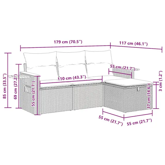 Ta vrtna sedežna garnitura je popoln dodatek za vaše dvorišče, teraso ali verando, saj zagotavlja udoben in vabljiv prostor za klepet z družino in prijatelji ali preprosto za sprostitev in uživanje na prostem. Trpežen material: PE ratan, znan tudi kot poli ratan, je močan sintetični material, ki ne potrebuje vzdrževanja in je videti kot naravni ratan. Je lahek, enostaven za čiščenje in se zaradi svoje vzdržljivosti in odpornosti na vremenske vplive pogosto uporablja za zunanje pohištvo.Funkcija shranjevanja z vodoodporno torbo: Vrtno pohištvo ima pod sedežem prostor za shranjevanje, opremljen z vodoodporno torbo za shranjevanje blazin, igrač in drugih stvari. Notranjo torbo je mogoče varno pritrditi na zunanje pohištvo s kavljem in zanko za večjo stabilnost.Vsestranski stolček za noge: Stolček je vsestransko uporaben, saj služi kot udoben naslon za noge, ko ležite na kavču, ali kot dodaten sedež na vrtu.Prevleko je mogoče odstraniti in oprati: Te sedežne blazine imajo odstranljive prevleke za lažje pranje in vzdrževanje.Modularna zasnova: Ta komplet zunanjega pohištva ima modularno zasnovo, zaradi česar je popolnoma prilagodljiv in enostaven za premikanje, tako da lahko zunanjo garnituro postavite kakor koli želite. Dobro je vedeti:Če želite, da vaše zunanje pohištvo ostane lepo, vam priporočamo, da ga zaščitite z vodoodporno prevleko.Dimenzije vodoodporne vreče: 55 x 53 x 34 cm (D x Š x V)Največja dovoljena teža (na sedež): 110 kgUV-odpornoPlastične nastavljive nogePotrebno sestavljanje: DaKavč z naslonjali za roke:Barva: ČrnaMaterial: PE ratan, prašno premazano jeklo, trden akacijev les z oljnim premazomDimenzije: 62 x 62 x 69 cm (Š x G x V)Velikost sedeža: 55 x 55 cm (Š x G)Višina sedeža od tal (brez blazine): 37 cmVišina naslonjal za roke od tal: 55 cmŠirina naslonjala za roke: 6 cmVelikost stranske mizice: 24,5 x 23,5 cm (D × Š)Srednji sedež:Barva: ČrnaMaterial: PE ratan, jeklen okvir s prašnim premazomDimenzije: 55 x 62 x 69 cm (Š x G x V)Velikost sedeža: 55 x 55 cm (Š x G)Višina sedeža od tal (brez blazine): 37 cmStolček za noge:Barva: ČrnaMaterial: PE ratan, jeklen okvir s prašnim premazomDimenzije: 55 x 55 x 37 cm (Š x G x V)Blazina:Barva: Kremno belaMaterial prevleke: Tkanina (100 % poliester)Polnilo sedežne blazine: PenaPolnilo hrbtne blazine: bombažna vlaknaDimenzije sedežne blazine: 55 x 55 x 3 cm (Š x G x D)Dimenzije hrbtne blazine: 55 x 45 x 13 cm (D x Š x D)Paket vsebuje:2 x Kavč s funkcijo shranjevanja z vodoodporno vrečo1 x Srednji kavč s funkcijo shranjevanja z vodoodporno vrečo1 x Stolček s funkcijo shranjevanja3 x Blazina za hrbet4 x Sedežna blazina s snemljivo in pralno prevleko 3325948