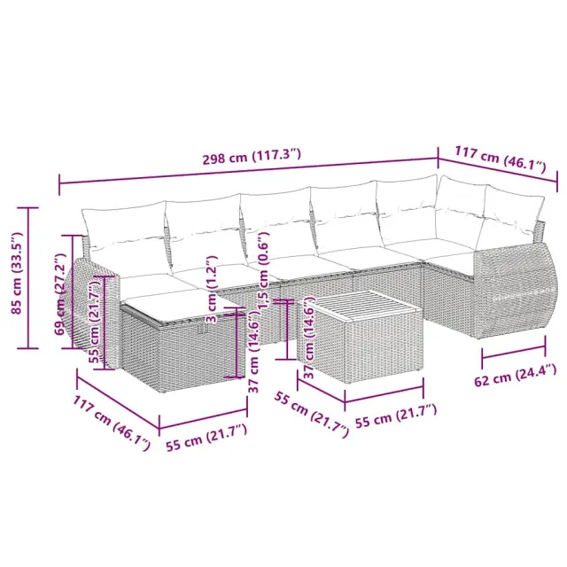 Ta vrtna sedežna garnitura je popoln dodatek za vaše dvorišče, teraso ali verando, saj zagotavlja udoben in vabljiv prostor za klepet z družino in prijatelji ali preprosto za sprostitev in uživanje na prostem. Trpežen material: PE ratan, znan tudi kot poli ratan, je močan sintetični material, ki ne potrebuje vzdrževanja in je videti kot naravni ratan. Je lahek, enostaven za čiščenje in se zaradi svoje vzdržljivosti in odpornosti na vremenske vplive pogosto uporablja za zunanje pohištvo.Funkcija shranjevanja z vodoodporno torbo: Vrtno pohištvo ima pod sedežem prostor za shranjevanje, opremljen z vodoodporno torbo za shranjevanje blazin, igrač in drugih stvari. Notranjo torbo je mogoče varno pritrditi na zunanje pohištvo s kavljem in zanko za večjo stabilnost.Vsestranski stolček za noge: Stolček je vsestransko uporaben, saj služi kot udoben naslon za noge, ko ležite na kavču, ali kot dodaten sedež na vrtu.Prevleko je mogoče odstraniti in oprati: Te sedežne blazine imajo odstranljive prevleke za lažje pranje in vzdrževanje.Modularna zasnova: Ta komplet zunanjega pohištva ima modularno zasnovo, zaradi česar je popolnoma prilagodljiv in enostaven za premikanje, tako da lahko zunanjo garnituro postavite kakor koli želite. Dobro je vedeti:Če želite, da vaše zunanje pohištvo ostane lepo, vam priporočamo, da ga zaščitite z vodoodporno prevleko.Dimenzije vodoodporne vreče: 55 x 53 x 34 cm (D x Š x V)Največja dovoljena teža (na sedež): 110 kgUV-odpornoPlastične nastavljive nogePotrebno sestavljanje: DaKavč z naslonjali za roke:Barva: BežMaterial: PE ratan, jeklen okvir s prašnim premazomDimenzije: 71 x 62 x 69 cm (Š x G x V)Velikost sedeža: 55 x 55 cm (Š x G)Višina sedeža od tal (brez blazine): 37 cmVišina naslonjal za roke od tal: 55 cmKotni sedež:Barva: BežMaterial: PE ratan, jeklen okvir s prašnim premazomDimenzije: 62 x 62 x 69 cm (Š x G x V)Velikost sedeža: 55 x 55 cm (Š x G)Višina sedeža od tal (brez blazine): 37 cmSrednji sedež:Barva: BežMaterial: PE ratan, jeklen okvir s prašnim premazomDimenzije: 55 x 62 x 69 cm (Š x G x V)Velikost sedeža: 55 x 55 cm (Š x G)Višina sedeža od tal (brez blazine): 37 cmStolček za noge:Barva: BežMaterial: PE ratan, jeklen okvir s prašnim premazomDimenzije: 55 x 55 x 37 cm (Š x G x V)Vrtna miza:Barva: Bež in rjavaMaterial: PE ratan, prašno premazano jeklo, trden akacijev les z oljnim premazomDimenzije: 55 x 55 x 37 cm (Š x G x V)Blazina:Barva: Kremno belaMaterial prevleke: Tkanina (100 % poliester)Polnilo sedežne blazine: PenaPolnilo hrbtne blazine: bombažna vlaknaDimenzije sedežne blazine: 55 x 55 x 3 cm (Š x G x D)Dimenzije hrbtne blazine: 55 x 45 x 13 cm (D x Š x D)Paket vsebuje:2 x Kavč s funkcijo shranjevanja z vodoodporno vrečo1 x Kotni kavč s funkcijo shranjevanja z vodoodporno vrečo3 x Srednji kavč s funkcijo shranjevanja z vodoodporno vrečo1 x Stolček s funkcijo shranjevanja1 x Vrtna miza7 x Hrbtna blazina7 x Sedežna blazina s snemljivo in pralno prevleko 3325852
