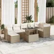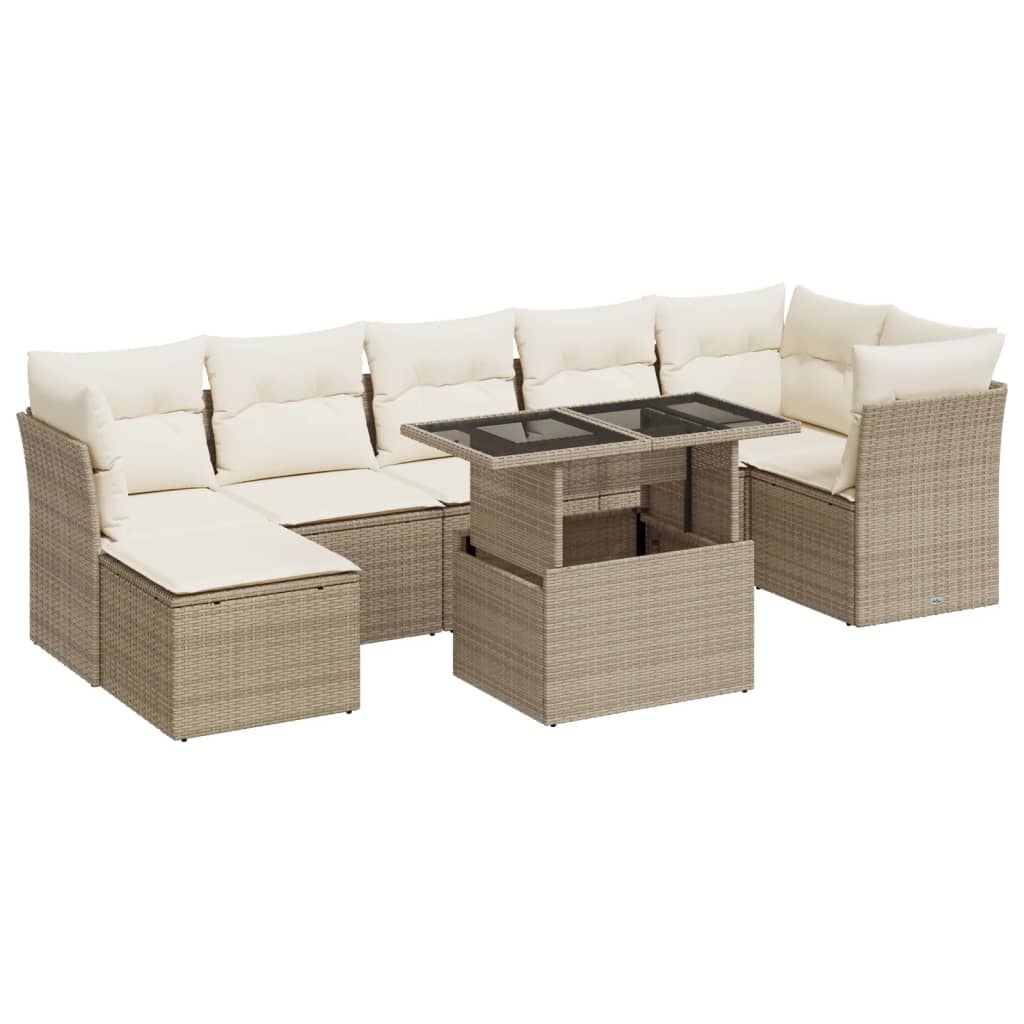 Ta vrtna sedežna garnitura je popoln dodatek za vaše dvorišče, teraso ali verando, saj zagotavlja udoben in vabljiv prostor za klepet z družino in prijatelji ali preprosto za sprostitev in uživanje na prostem. Trpežen material: PE ratan, znan tudi kot poli ratan, je močan sintetični material, ki ne potrebuje vzdrževanja in je videti kot naravni ratan. Je lahek, enostaven za čiščenje in se zaradi svoje vzdržljivosti in odpornosti na vremenske vplive pogosto uporablja za zunanje pohištvo.Funkcija shranjevanja z vodoodporno vrečo: Vsak vrtni sedež ima pod sedežem prostor za shranjevanje, opremljen z vodoodporno vrečo za shranjevanje blazin, igrač in drugih predmetov. Notranja torba ima zgornji pokrov in jo je mogoče varno pritrditi na sedež s kavljem in zanko za večjo stabilnost.Nastavljiva mizna plošča: Z dvigom mizne plošče lahko mizo povišate, s čimer se zunanja klubska mizica spremeni v jedilno mizo. Popolna je za sprejemanje gostov ali uživanje v obrokih na prostem.Vsestranski stolček za noge: Stolček je vsestransko uporaben, saj služi kot udoben naslon za noge, ko ležite na kavču, ali kot dodaten sedež na vrtu.Prevleko je mogoče odstraniti in oprati: Te sedežne blazine imajo odstranljive prevleke za lažje pranje in vzdrževanje.Robusten in stabilen okvir: Jeklen okvir s prašnim premazom je močan, stabilen, trpežen ter odporen na korozijo in slabe vremenske razmere, kar zagotavlja dolgotrajno delovanje. Dobro je vedeti:Če želite, da vaše zunanje pohištvo ostane lepo, vam priporočamo, da ga zaščitite z vodoodporno prevleko.Dimenzije vodoodporne vreče: 55 x 53 x 34 cm (D x Š x V)Največja dovoljena teža (na sedež): 110 kgUV-odpornoPlastične nastavljive nogePotrebno sestavljanje: DaSrednji sedež:Barva: BežMaterial: PE ratan, jeklen okvir s prašnim premazomDimenzije: 55 x 62 x 69 cm (Š x G x V)Velikost sedeža: 55 x 55 cm (Š x G)Višina sedeža od tal (brez blazine): 37 cmKotni sedež:Barva: BežMaterial: PE ratan, jeklen okvir s prašnim premazomDimenzije: 62 x 62 x 69 cm (Š x G x V)Velikost sedeža: 55 x 55 cm (Š x G)Višina sedeža od tal (brez blazine): 37 cmStolček za noge:Barva: BežMaterial: PE ratan, jeklen okvir s prašnim premazomDimenzije: 55 x 55 x 37 cm (Š x G x V)Miza:Barva: BežMaterial: PE ratan, jeklo s prašnim premazom, kaljeno stekloDimenzije: 100 x 55 x 44/73 cm (D x Š x V)Blazina:Barva: Kremno belaMaterial prevleke: Tkanina (100 % poliester)Polnilo sedežne blazine: PenaPolnilo hrbtne blazine: bombažna vlaknaDimenzije sedežne blazine: 55 x 55 x 3 cm (Š x G x D)Dimenzije hrbtne blazine: 55 x 45 x 13 cm (D x Š x D)Paket vsebuje:3 x Srednji kavč s funkcijo shranjevanja z vodoodporno vrečo3 x Kotni kavč s funkcijo shranjevanja z vodoodporno vrečo1 x Stolček za noge s funkcijo shranjevanja z vodoodporno vrečo1 x Miza9 x Blazina za hrbet7 x Sedežna blazina s snemljivo in pralno prevleko 3326199