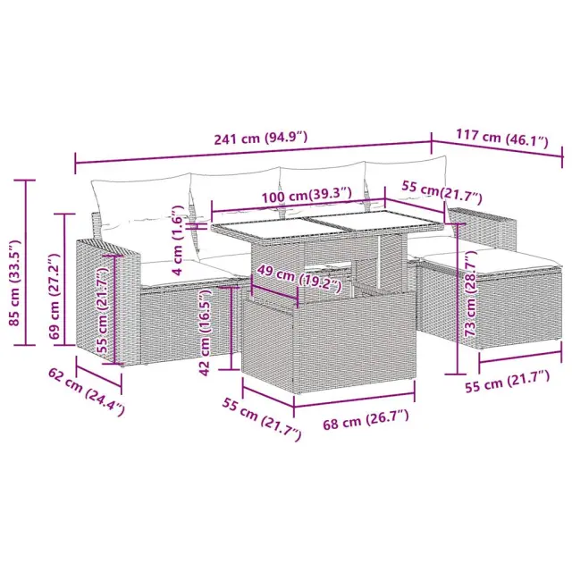 Ta vrtna sedežna garnitura je popoln dodatek za vaše dvorišče, teraso ali verando, saj zagotavlja udoben in vabljiv prostor za klepet z družino in prijatelji ali preprosto za sprostitev in uživanje na prostem. Trpežen material: PE ratan, znan tudi kot poli ratan, je močan sintetični material, ki ne potrebuje vzdrževanja in je videti kot naravni ratan. Je lahek, enostaven za čiščenje in se zaradi svoje vzdržljivosti in odpornosti na vremenske vplive pogosto uporablja za zunanje pohištvo.Funkcija shranjevanja z vodoodporno vrečo: Vsak vrtni sedež ima pod sedežem prostor za shranjevanje, opremljen z vodoodporno vrečo za shranjevanje blazin, igrač in drugih predmetov. Notranja torba ima zgornji pokrov in jo je mogoče varno pritrditi na sedež s kavljem in zanko za večjo stabilnost.Nastavljiva mizna plošča: Z dvigom mizne plošče lahko mizo povišate, s čimer se zunanja klubska mizica spremeni v jedilno mizo. Popolna je za sprejemanje gostov ali uživanje v obrokih na prostem.Vsestranski stolček za noge: Stolček je vsestransko uporaben, saj služi kot udoben naslon za noge, ko ležite na kavču, ali kot dodaten sedež na vrtu.Prevleko je mogoče odstraniti in oprati: Te sedežne blazine imajo odstranljive prevleke za lažje pranje in vzdrževanje.Robusten in stabilen okvir: Jeklen okvir s prašnim premazom je močan, stabilen, trpežen ter odporen na korozijo in slabe vremenske razmere, kar zagotavlja dolgotrajno delovanje. Dobro je vedeti:Če želite, da vaše zunanje pohištvo ostane lepo, vam priporočamo, da ga zaščitite z vodoodporno prevleko.Dimenzije vodoodporne vreče: 55 x 53 x 34 cm (D x Š x V)Največja dovoljena teža (na sedež): 110 kgUV-odpornoPlastične nastavljive nogePotrebno sestavljanje: DaSrednji sedež:Barva: ČrnaMaterial: PE ratan, jeklen okvir s prašnim premazomDimenzije: 55 x 62 x 69 cm (Š x G x V)Velikost sedeža: 55 x 55 cm (Š x G)Višina sedeža od tal (brez blazine): 37 cmKavč z naslonjali za roke:Barva: ČrnaMaterial: PE ratan, jeklen okvir s prašnim premazomDimenzije: 65,5 x 62 x 69 cm (Š x G x V)Velikost sedeža: 55 x 55 cm (Š x G)Višina sedeža od tal (brez blazine): 37 cmVišina naslonjal za roke od tal: 55 cmStolček za noge:Barva: ČrnaMaterial: PE ratan, jeklen okvir s prašnim premazomDimenzije: 55 x 55 x 37 cm (Š x G x V)Miza:Barva: ČrnaMaterial: PE ratan, jeklo s prašnim premazom, kaljeno stekloDimenzije: 100 x 55 x 44/73 cm (D x Š x V)Blazina:Barva: ČrnaMaterial prevleke: Tkanina (100 % poliester)Polnilo sedežne blazine: PenaPolnilo hrbtne blazine: bombažna vlaknaDimenzije sedežne blazine: 55 x 55 x 3 cm (Š x G x D)Dimenzije hrbtne blazine: 55 x 45 x 13 cm (D x Š x D)Paket vsebuje:2 x Srednji kavč s funkcijo shranjevanja z vodoodporno vrečo2 x Kavč s funkcijo shranjevanja z vodoodporno vrečo1 x Stolček za noge s funkcijo shranjevanja z vodoodporno vrečo1 x Miza4 x Blazina za hrbet5 x Sedežna blazina s snemljivo pralno prevleko 3326296