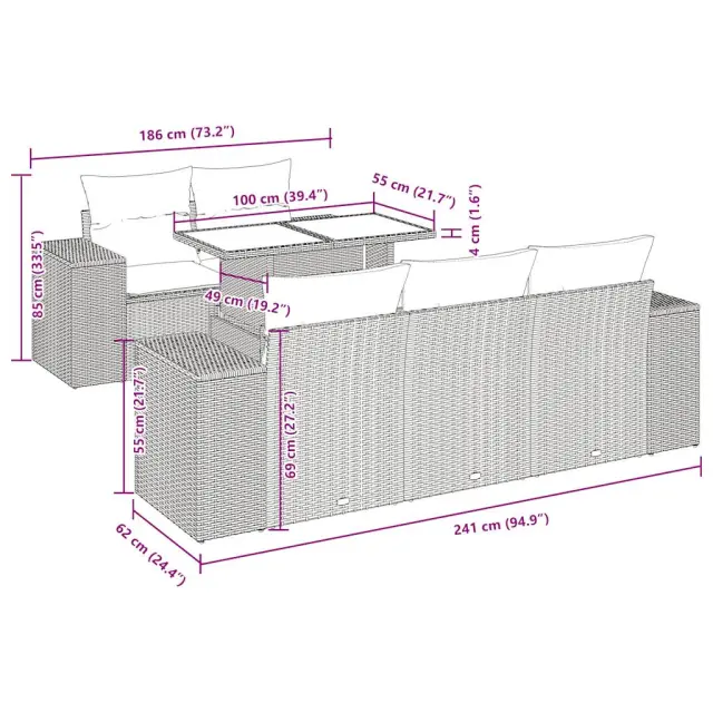 Ta vrtna sedežna garnitura je popoln dodatek za vaše dvorišče, teraso ali verando, saj zagotavlja udoben in vabljiv prostor za klepet z družino in prijatelji ali preprosto za sprostitev in uživanje na prostem. Trpežen material: PE ratan, znan tudi kot poli ratan, je močan sintetični material, ki ne potrebuje vzdrževanja in je videti kot naravni ratan. Je lahek, enostaven za čiščenje in se zaradi svoje vzdržljivosti in odpornosti na vremenske vplive pogosto uporablja za zunanje pohištvo.Funkcija shranjevanja z vodoodporno torbo: Vrtno pohištvo ima pod sedežem prostor za shranjevanje, opremljen z vodoodporno torbo za shranjevanje blazin, igrač in drugih stvari. Notranjo torbo je mogoče varno pritrditi na zunanje pohištvo s kavljem in zanko za večjo stabilnost.Nastavljiva mizna plošča: Z dvigom mizne plošče lahko mizo povišate, s čimer se zunanja klubska mizica spremeni v jedilno mizo. Popolna je za sprejemanje gostov ali uživanje v obrokih na prostem.Prevleko je mogoče odstraniti in oprati: Te sedežne blazine imajo odstranljive prevleke za lažje pranje in vzdrževanje.Modularna zasnova: Ta komplet zunanjega pohištva ima modularno zasnovo, zaradi česar je popolnoma prilagodljiv in enostaven za premikanje, tako da lahko zunanjo garnituro postavite kakor koli želite. Dobro je vedeti:Če želite, da vaše zunanje pohištvo ostane lepo, vam priporočamo, da ga zaščitite z vodoodporno prevleko.Dimenzije vodoodporne vreče: 55 x 53 x 34 cm (D x Š x V)Maksimalna nosilnost (na sedež): 110 kgUV-odpornoPlastične nastavljive nogePotrebno sestavljanje: DaKotni sedež:Barva: Svetlo sivaMaterial: PE ratan, jeklen okvir s prašnim premazomDimenzije: 83 x 62 x 69 cm (Š x G x V)Velikost sedeža: 55 x 55 cm (Š x G)Višina sedeža od tal (brez blazine): 37 cmVišina naslonjal za roke od tal: 55 cmŠirina naslona za roke: 27,5 cmSrednji sedež:Barva: Svetlo sivaMaterial: PE ratan, jeklen okvir s prašnim premazomDimenzije: 55 x 62 x 69 cm (Š x G x V)Velikost sedeža: 55 x 55 cm (Š x G)Višina sedeža od tal (brez blazine): 37 cmMiza:Barva: Svetlo sivaMaterial: PE ratan, jeklo s prašnim premazom, kaljeno stekloDimenzije: 100 x 55 x 44/73 cm (D x Š x V)Blazina:Barva: Temno sivaMaterial prevleke: Tkanina (100 % poliester)Polnilo sedežne blazine: PenaPolnilo hrbtne blazine: bombažna vlaknaDimenzije sedežne blazine: 55 x 55 x 3 cm (Š x G x D)Dimenzije hrbtne blazine: 55 x 45 x 13 cm (D x Š x D)Paket vsebuje:1 x Vrtna miza4 x Kotni sedež s funkcijo shranjevanja z vodoodporno vrečo1 x Srednji kavč s funkcijo shranjevanja z vodoodporno vrečo5 x Blazina za hrbet5 x Sedežna blazina s snemljivo pralno prevleko 3326733