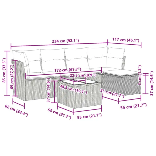 Ta vrtna sedežna garnitura je popoln dodatek za vaše dvorišče, teraso ali verando, saj zagotavlja udoben in vabljiv prostor za klepet z družino in prijatelji ali preprosto za sprostitev in uživanje na prostem. Trpežen material: PE ratan, znan tudi kot poli ratan, je močan sintetični material, ki ne potrebuje vzdrževanja in je videti kot naravni ratan. Je lahek, enostaven za čiščenje in se zaradi svoje vzdržljivosti in odpornosti na vremenske vplive pogosto uporablja za zunanje pohištvo.Funkcija shranjevanja z vodoodporno torbo: Vrtno pohištvo ima pod sedežem prostor za shranjevanje, opremljen z vodoodporno torbo za shranjevanje blazin, igrač in drugih stvari. Notranjo torbo je mogoče varno pritrditi na zunanje pohištvo s kavljem in zanko za večjo stabilnost.Vsestranski stolček za noge: Stolček je vsestransko uporaben, saj služi kot udoben naslon za noge, ko ležite na kavču, ali kot dodaten sedež na vrtu.Prevleko je mogoče odstraniti in oprati: Te sedežne blazine imajo odstranljive prevleke za lažje pranje in vzdrževanje.Modularna zasnova: Ta komplet zunanjega pohištva ima modularno zasnovo, zaradi česar je popolnoma prilagodljiv in enostaven za premikanje, tako da lahko zunanjo garnituro postavite kakor koli želite. Dobro je vedeti:Če želite, da vaše zunanje pohištvo ostane lepo, vam priporočamo, da ga zaščitite z vodoodporno prevleko.Dimenzije vodoodporne vreče: 55 x 53 x 34 cm (D x Š x V)Največja dovoljena teža (na sedež): 110 kgUV-odpornoPlastične nastavljive nogePotrebno sestavljanje: DaKotni sedež:Barva: ČrnaMaterial: PE ratan, jeklen okvir s prašnim premazomDimenzije: 62 x 62 x 69 cm (Š x G x V)Velikost sedeža: 55 x 55 cm (Š x G)Višina sedeža od tal (brez blazine): 37 cmSrednji sedež:Barva: ČrnaMaterial: PE ratan, jeklen okvir s prašnim premazomDimenzije: 55 x 62 x 69 cm (Š x G x V)Velikost sedeža: 55 x 55 cm (Š x G)Višina sedeža od tal (brez blazine): 37 cmStolček za noge:Barva: ČrnaMaterial: PE ratan, jeklen okvir s prašnim premazomDimenzije: 55 x 55 x 37 cm (Š x G x V)Vrtna miza:Barva: ČrnaMaterial: PE ratan, jeklo s prašnim premazom, kaljeno stekloDimenzije: 55 x 55 x 37 cm (Š x G x V)Blazina:Barva: Kremno belaMaterial prevleke: Tkanina (100 % poliester)Polnilo sedežne blazine: PenaPolnilo hrbtne blazine: bombažna vlaknaDimenzije sedežne blazine: 55 x 55 x 3 cm (Š x G x D)Dimenzije hrbtne blazine: 55 x 45 x 13 cm (D x Š x D)Paket vsebuje:2 x Kotni kavč s funkcijo shranjevanja z vodoodporno vrečo2 x Srednji kavč s funkcijo shranjevanja z vodoodporno vrečo1 x Stolček s funkcijo shranjevanja1 x Vrtna miza6 x Blazina za hrbet5 x Sedežna blazina s snemljivo pralno prevleko 3325272