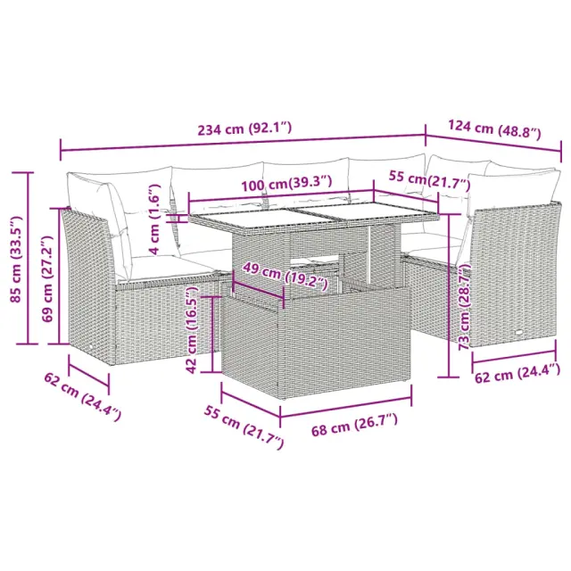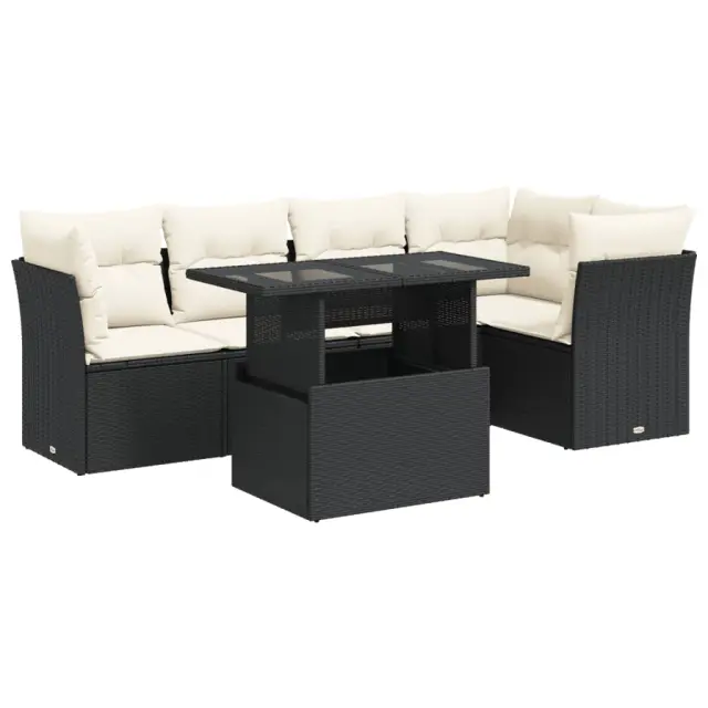 Ta vrtna sedežna garnitura je popoln dodatek za vaše dvorišče, teraso ali verando, saj zagotavlja udoben in vabljiv prostor za klepet z družino in prijatelji ali preprosto za sprostitev in uživanje na prostem. Trpežen material: PE ratan, znan tudi kot poli ratan, je močan sintetični material, ki ne potrebuje vzdrževanja in je videti kot naravni ratan. Je lahek, enostaven za čiščenje in se zaradi svoje vzdržljivosti in odpornosti na vremenske vplive pogosto uporablja za zunanje pohištvo.Funkcija shranjevanja z vodoodporno vrečo: Vsak vrtni sedež ima pod sedežem prostor za shranjevanje, opremljen z vodoodporno vrečo za shranjevanje blazin, igrač in drugih predmetov. Notranja torba ima zgornji pokrov in jo je mogoče varno pritrditi na sedež s kavljem in zanko za večjo stabilnost.Nastavljiva mizna plošča: Z dvigom mizne plošče lahko mizo povišate, s čimer se zunanja klubska mizica spremeni v jedilno mizo. Popolna je za sprejemanje gostov ali uživanje v obrokih na prostem.Prevleko je mogoče odstraniti in oprati: Te sedežne blazine imajo odstranljive prevleke za lažje pranje in vzdrževanje.Robusten in stabilen okvir: Jeklen okvir s prašnim premazom je močan, stabilen, trpežen ter odporen na korozijo in slabe vremenske razmere, kar zagotavlja dolgotrajno delovanje. Dobro je vedeti:Če želite, da vaše zunanje pohištvo ostane lepo, vam priporočamo, da ga zaščitite z vodoodporno prevleko.Dimenzije vodoodporne vreče: 55 x 53 x 34 cm (D x Š x V)Največja dovoljena teža (na sedež): 110 kgUV-odpornoPlastične nastavljive nogePotrebno sestavljanje: DaSrednji sedež:Barva: ČrnaMaterial: PE ratan, jeklen okvir s prašnim premazomDimenzije: 55 x 62 x 69 cm (Š x G x V)Velikost sedeža: 55 x 55 cm (Š x G)Višina sedeža od tal (brez blazine): 37 cmKotni sedež:Barva: ČrnaMaterial: PE ratan, jeklen okvir s prašnim premazomDimenzije: 62 x 62 x 69 cm (Š x G x V)Velikost sedeža: 55 x 55 cm (Š x G)Višina sedeža od tal (brez blazine): 37 cmMiza:Barva: ČrnaMaterial: PE ratan, jeklo s prašnim premazom, kaljeno stekloDimenzije: 100 x 55 x 44/73 cm (D x Š x V)Blazina:Barva: Kremno belaMaterial prevleke: Tkanina (100 % poliester)Polnilo sedežne blazine: PenaPolnilo hrbtne blazine: bombažna vlaknaDimenzije sedežne blazine: 55 x 55 x 3 cm (Š x G x D)Dimenzije hrbtne blazine: 55 x 45 x 13 cm (D x Š x D)Paket vsebuje:2 x Srednji kavč s funkcijo shranjevanja z vodoodporno vrečo3 x Kotni kavč s funkcijo shranjevanja z vodoodporno vrečo1 x Miza8 x Blazina za hrbet5 x Sedežna blazina s snemljivo pralno prevleko 3326157
