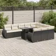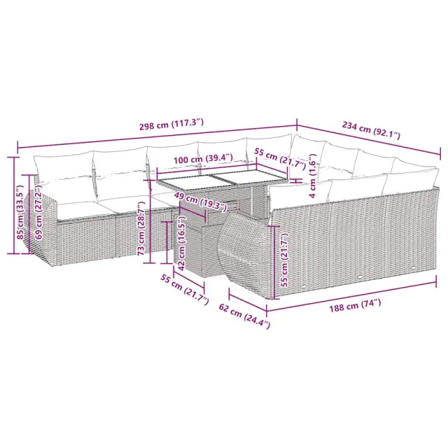 Ta vrtna sedežna garnitura je popoln dodatek za vaše dvorišče, teraso ali verando, saj zagotavlja udoben in vabljiv prostor za klepet z družino in prijatelji ali preprosto za sprostitev in uživanje na prostem. Trpežen material: PE ratan, znan tudi kot poli ratan, je močan sintetični material, ki ne potrebuje vzdrževanja in je videti kot naravni ratan. Je lahek, enostaven za čiščenje in se zaradi svoje vzdržljivosti in odpornosti na vremenske vplive pogosto uporablja za zunanje pohištvo.Funkcija shranjevanja z vodoodporno torbo: Vrtno pohištvo ima pod sedežem prostor za shranjevanje, opremljen z vodoodporno torbo za shranjevanje blazin, igrač in drugih stvari. Notranjo torbo je mogoče varno pritrditi na zunanje pohištvo s kavljem in zanko za večjo stabilnost.Nastavljiva mizna plošča: Z dvigom mizne plošče lahko mizo povišate, s čimer se zunanja klubska mizica spremeni v jedilno mizo. Popolna je za sprejemanje gostov ali uživanje v obrokih na prostem.Prevleko je mogoče odstraniti in oprati: Te sedežne blazine imajo odstranljive prevleke za lažje pranje in vzdrževanje.Modularna zasnova: Ta komplet zunanjega pohištva ima modularno zasnovo, zaradi česar je popolnoma prilagodljiv in enostaven za premikanje, tako da lahko zunanjo garnituro postavite kakor koli želite. Dobro je vedeti:Če želite, da vaše zunanje pohištvo ostane lepo, vam priporočamo, da ga zaščitite z vodoodporno prevleko.Dimenzije vodoodporne vreče: 55 x 53 x 34 cm (D x Š x V)Maksimalna nosilnost (na sedež): 110 kgUV-odpornoPlastične nastavljive nogePotrebno sestavljanje: DaKotni sedež:Barva: ČrnaMaterial: PE ratan, jeklen okvir s prašnim premazomDimenzije: 62 x 62 x 69 cm (Š x G x V)Velikost sedeža: 55 x 55 cm (Š x G)Višina sedeža od tal (brez blazine): 37 cmKotni sedež s naslonom za roke iz ratana:Barva: ČrnaMaterial: PE ratan, jeklen okvir s prašnim premazomDimenzije: 71 x 62 x 69 cm (Š x G x V)Velikost sedeža: 55 x 55 cm (Š x G)Višina sedeža od tal (brez blazine): 37 cmVišina naslonjal za roke od tal: 55 cmSrednji sedež:Barva: ČrnaMaterial: PE ratan, jeklen okvir s prašnim premazomDimenzije: 55 x 62 x 69 cm (Š x G x V)Velikost sedeža: 55 x 55 cm (Š x G)Višina sedeža od tal (brez blazine): 37 cmMiza:Barva: ČrnaMaterial: PE ratan, jeklo s prašnim premazom, kaljeno stekloDimenzije: 100 x 55 x 44/73 cm (D x Š x V)Blazina:Barva: Kremno belaMaterial prevleke: Tkanina (100 % poliester)Polnilo sedežne blazine: PenaPolnilo hrbtne blazine: bombažna vlaknaDimenzije sedežne blazine: 55 x 55 x 3 cm (Š x G x D)Dimenzije hrbtne blazine: 55 x 45 x 13 cm (D x Š x D)Paket vsebuje:1 x Vrtna miza2 x Kotni kavč s funkcijo shranjevanja z vodoodporno vrečo2 x Kotni sedež z naslonom za roke iz ratana s funkcijo shranjevanja z vodoodporno torbo6 x Srednji kavč s funkcijo shranjevanja z vodoodporno vrečo12 x Blazina za hrbet10 x Sedežna blazina s snemljivo in pralno prevleko 3326707