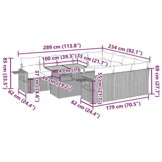 Ta vrtna sedežna garnitura je popoln dodatek za vaše dvorišče, teraso ali verando, saj zagotavlja udoben in vabljiv prostor za klepet z družino in prijatelji ali preprosto za sprostitev in uživanje na prostem. Trpežen material: PE ratan, znan tudi kot poli ratan, je močan sintetični material, ki ne potrebuje vzdrževanja in je videti kot naravni ratan. Je lahek, enostaven za čiščenje in se zaradi svoje vzdržljivosti in odpornosti na vremenske vplive pogosto uporablja za zunanje pohištvo.Funkcija shranjevanja z vodoodporno torbo: Vrtno pohištvo ima pod sedežem prostor za shranjevanje, opremljen z vodoodporno torbo za shranjevanje blazin, igrač in drugih stvari. Notranjo torbo je mogoče varno pritrditi na zunanje pohištvo s kavljem in zanko za večjo stabilnost.Nastavljiva mizna plošča: Z dvigom mizne plošče lahko mizo povišate, s čimer se zunanja klubska mizica spremeni v jedilno mizo. Popolna je za sprejemanje gostov ali uživanje v obrokih na prostem.Prevleko je mogoče odstraniti in oprati: Te sedežne blazine imajo odstranljive prevleke za lažje pranje in vzdrževanje.Modularna zasnova: Ta komplet zunanjega pohištva ima modularno zasnovo, zaradi česar je popolnoma prilagodljiv in enostaven za premikanje, tako da lahko zunanjo garnituro postavite kakor koli želite. Dobro je vedeti:Če želite, da vaše zunanje pohištvo ostane lepo, vam priporočamo, da ga zaščitite z vodoodporno prevleko.Dimenzije vodoodporne vreče: 55 x 53 x 34 cm (D x Š x V)Maksimalna nosilnost (na sedež): 110 kgUV-odpornoPlastične nastavljive nogePotrebno sestavljanje: DaKotni sedež:Barva: BežMaterial: PE ratan, jeklen okvir s prašnim premazomDimenzije: 62 x 62 x 69 cm (Š x G x V)Velikost sedeža: 55 x 55 cm (Š x G)Višina sedeža od tal (brez blazine): 37 cmKotni sedež s naslonom za roke iz ratana:Barva: BežMaterial: PE ratan, jeklen okvir s prašnim premazomDimenzije: 62 x 62 x 69 cm (Š x G x V)Velikost sedeža: 55 x 55 cm (Š x G)Višina sedeža od tal (brez blazine): 37 cmVišina naslonjal za roke od tal: 55 cmŠirina naslonjala za roke: 6 cmVelikost stranske mizice: 25 x 23 cm (D x Š)Srednji sedež:Barva: BežMaterial: PE ratan, jeklen okvir s prašnim premazomDimenzije: 55 x 62 x 69 cm (Š x G x V)Velikost sedeža: 55 x 55 cm (Š x G)Višina sedeža od tal (brez blazine): 37 cmMiza:Barva: BežMaterial: PE ratan, prašno premazano jeklo, trden akacijev les z oljnim premazomDimenzije: 100 x 55 x 44/73 cm (D x Š x V)Blazina:Barva: Svetlo sivaMaterial prevleke: Tkanina (100 % poliester)Polnilo sedežne blazine: PenaPolnilo hrbtne blazine: bombažna vlaknaDimenzije sedežne blazine: 55 x 55 x 3 cm (Š x G x D)Dimenzije hrbtne blazine: 55 x 45 x 13 cm (D x Š x D)Paket vsebuje:1 x Vrtna miza2 x Kotni kavč s funkcijo shranjevanja z vodoodporno vrečo2 x Kotni sedež z naslonom za roke iz ratana s funkcijo shranjevanja z vodoodporno torbo6 x Srednji kavč s funkcijo shranjevanja z vodoodporno vrečo12 x Blazina za hrbet10 x Sedežna blazina s snemljivo in pralno prevleko 3327202