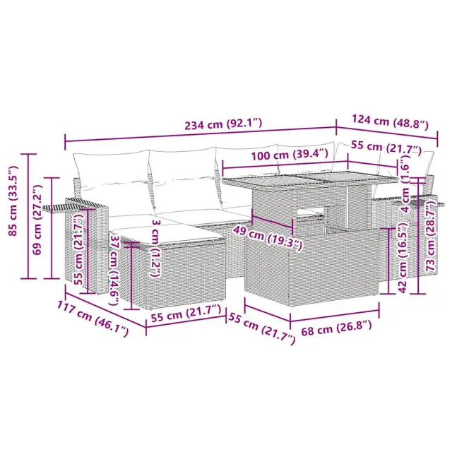 Ta vrtna sedežna garnitura je popoln dodatek za vaše dvorišče, teraso ali verando, saj zagotavlja udoben in vabljiv prostor za klepet z družino in prijatelji ali preprosto za sprostitev in uživanje na prostem. Trpežen material: PE ratan, znan tudi kot poli ratan, je močan sintetični material, ki ne potrebuje vzdrževanja in je videti kot naravni ratan. Je lahek, enostaven za čiščenje in se zaradi svoje vzdržljivosti in odpornosti na vremenske vplive pogosto uporablja za zunanje pohištvo.Funkcija shranjevanja z vodoodporno torbo: Vrtno pohištvo ima pod sedežem prostor za shranjevanje, opremljen z vodoodporno torbo za shranjevanje blazin, igrač in drugih stvari. Notranjo torbo je mogoče varno pritrditi na zunanje pohištvo s kavljem in zanko za večjo stabilnost.Nastavljiva mizna plošča: Z dvigom mizne plošče lahko mizo povišate, s čimer se zunanja klubska mizica spremeni v jedilno mizo. Popolna je za sprejemanje gostov ali uživanje v obrokih na prostem.Prevleko je mogoče odstraniti in oprati: Te sedežne blazine imajo odstranljive prevleke za lažje pranje in vzdrževanje.Modularna zasnova: Ta komplet zunanjega pohištva ima modularno zasnovo, zaradi česar je popolnoma prilagodljiv in enostaven za premikanje, tako da lahko zunanjo garnituro postavite kakor koli želite. Dobro je vedeti:Če želite, da vaše zunanje pohištvo ostane lepo, vam priporočamo, da ga zaščitite z vodoodporno prevleko.Dimenzije vodoodporne vreče: 55 x 53 x 34 cm (D x Š x V)Maksimalna nosilnost (na sedež): 110 kgUV-odpornoPlastične nastavljive nogePotrebno sestavljanje: DaKotni sedež:Barva: BežMaterial: PE ratan, jeklen okvir s prašnim premazomDimenzije: 62 x 62 x 69 cm (Š x G x V)Velikost sedeža: 55 x 55 cm (Š x G)Višina sedeža od tal (brez blazine): 37 cmKotni sedež s naslonom za roke iz ratana:Barva: BežMaterial: PE ratan, jeklen okvir s prašnim premazomDimenzije: 62 x 62 x 69 cm (Š x G x V)Velikost sedeža: 55 x 55 cm (Š x G)Višina sedeža od tal (brez blazine): 37 cmVišina naslonjal za roke od tal: 55 cmŠirina naslonjala za roke: 6 cmVelikost stranske mizice: 25 x 23 cm (D x Š)Srednji sedež:Barva: BežMaterial: PE ratan, jeklen okvir s prašnim premazomDimenzije: 55 x 62 x 69 cm (Š x G x V)Velikost sedeža: 55 x 55 cm (Š x G)Višina sedeža od tal (brez blazine): 37 cmStolček za noge:Barva: BežMaterial: PE ratan, jeklen okvir s prašnim premazomDimenzije: 55 x 55 x 37 cm (Š x G x V)Miza:Barva: BežMaterial: PE ratan, prašno premazano jeklo, trden akacijev les z oljnim premazomDimenzije: 100 x 55 x 44/73 cm (D x Š x V)Blazina:Barva: Kremno belaMaterial prevleke: Tkanina (100 % poliester)Polnilo sedežne blazine: PenaPolnilo hrbtne blazine: bombažna vlaknaDimenzije sedežne blazine: 55 x 55 x 3 cm (Š x G x D)Dimenzije hrbtne blazine: 55 x 45 x 13 cm (D x Š x D)Paket vsebuje:1 x Vrtna miza1 x Kotni kavč s funkcijo shranjevanja z vodoodporno vrečo2 x Kotni sedež z naslonom za roke iz ratana s funkcijo shranjevanja z vodoodporno torbo2 x Srednji kavč s funkcijo shranjevanja z vodoodporno vrečo1 x Stolček za noge s funkcijo shranjevanja z vodoodporno vrečo6 x Blazina za hrbet6 x Sedežna blazina s snemljivo pralno prevleko 3327173